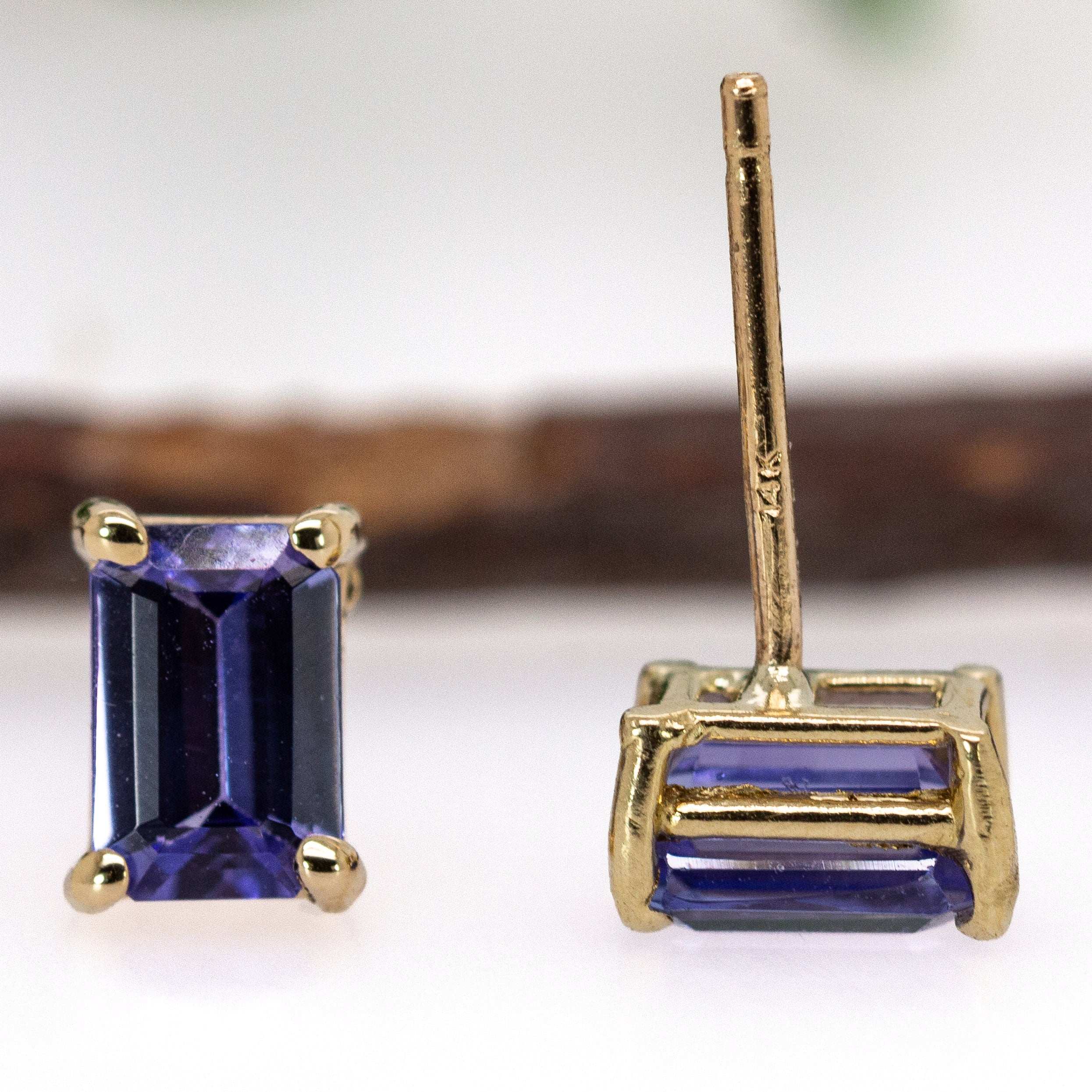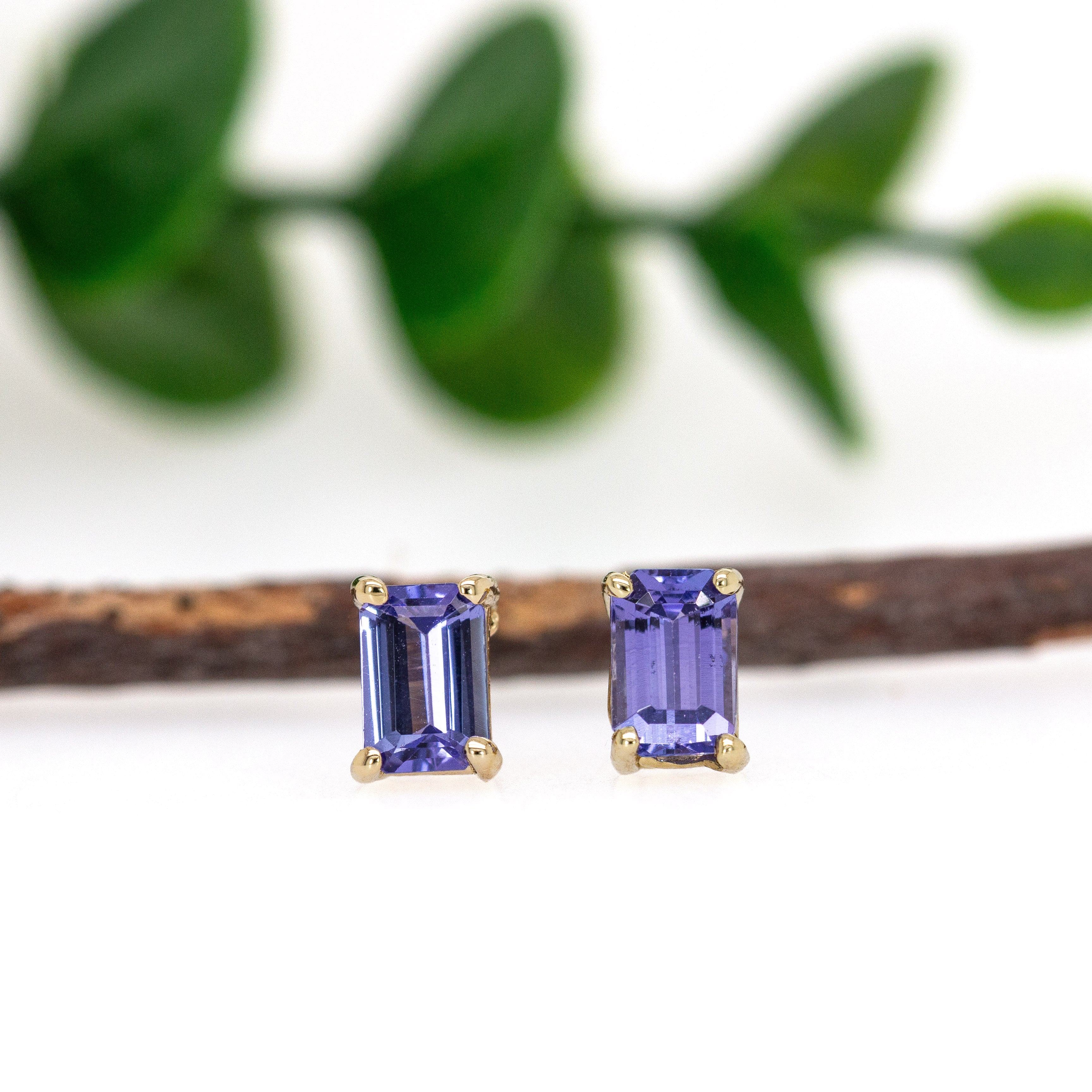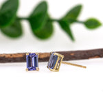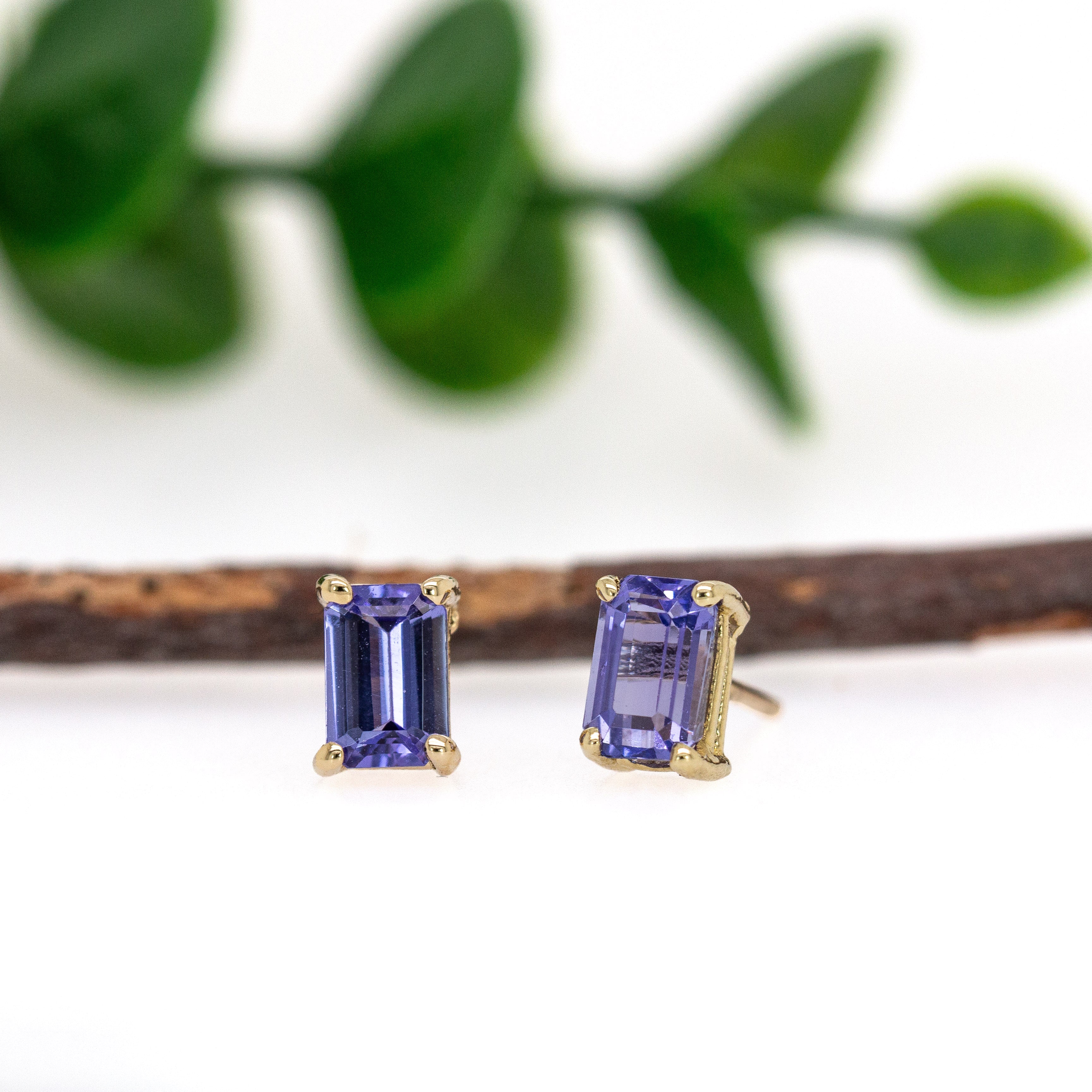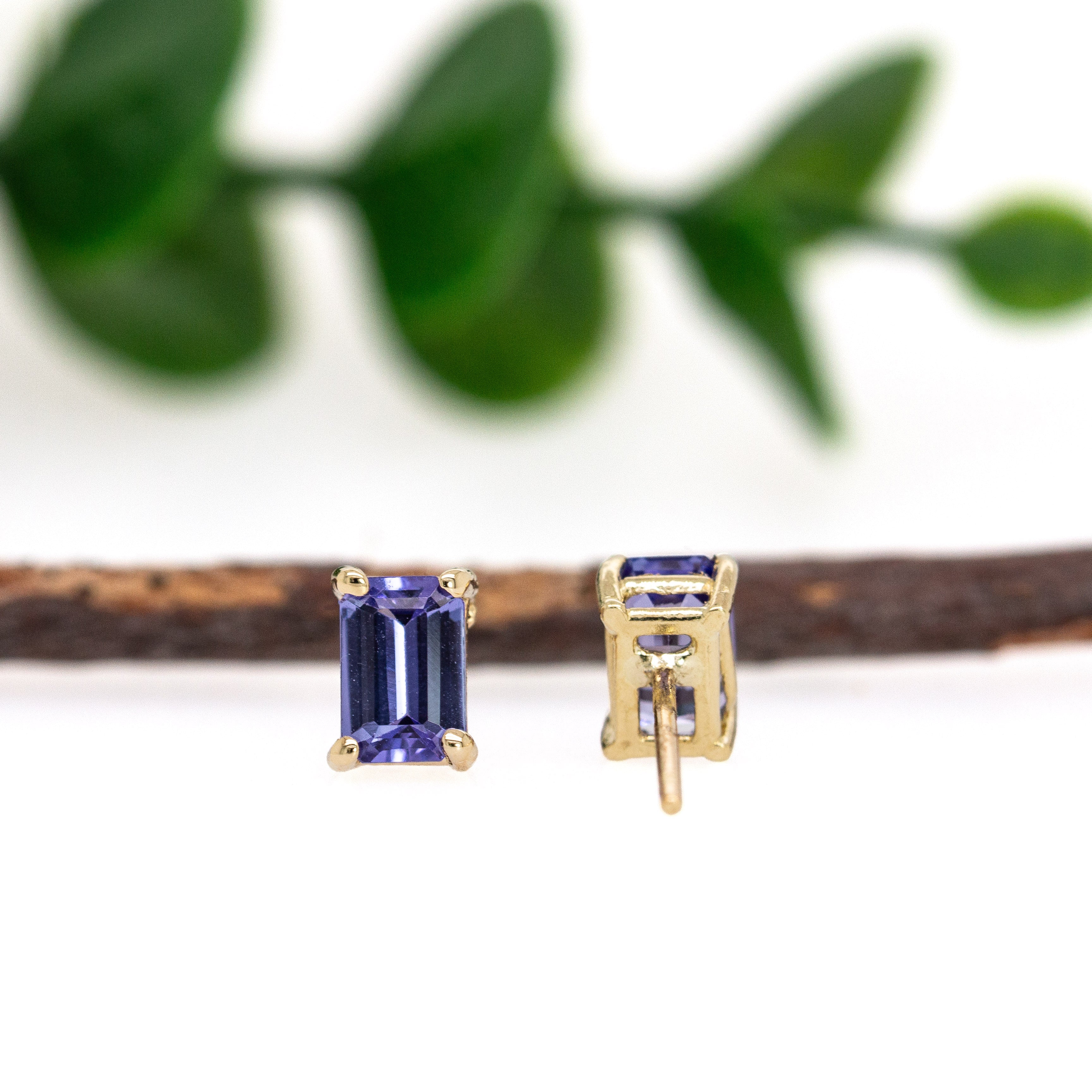 Tanzanite Four Prong Stud Earrings in Solid 14K Gold | Emerald Cut 6x4mm 7x5mm