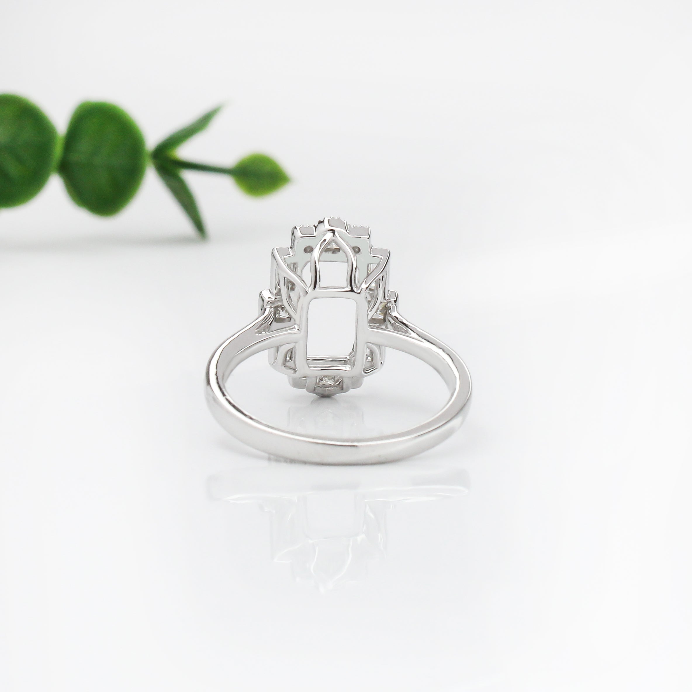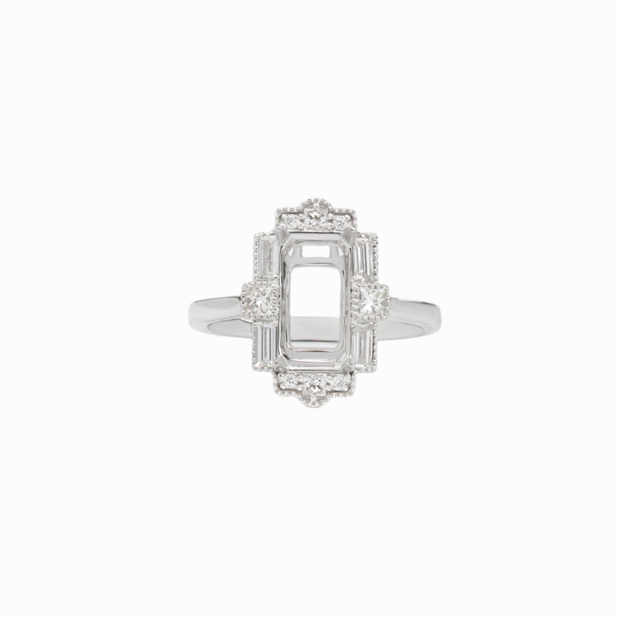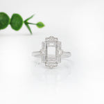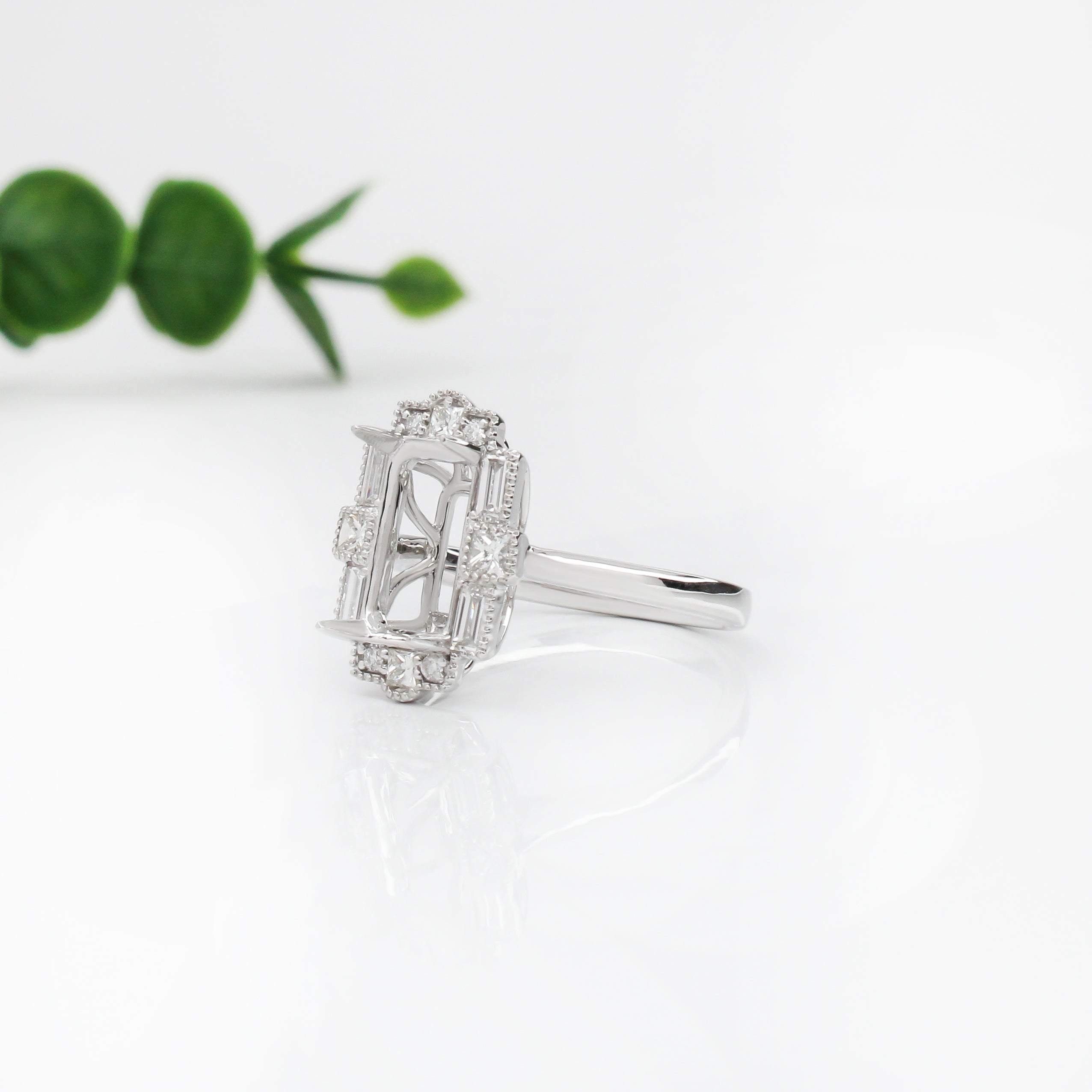 Vintage Inspired Diamond Ring Semi Mount in 14K Solid Gold w Natural Round & Baguette Diamond Accents | Emerald Cut