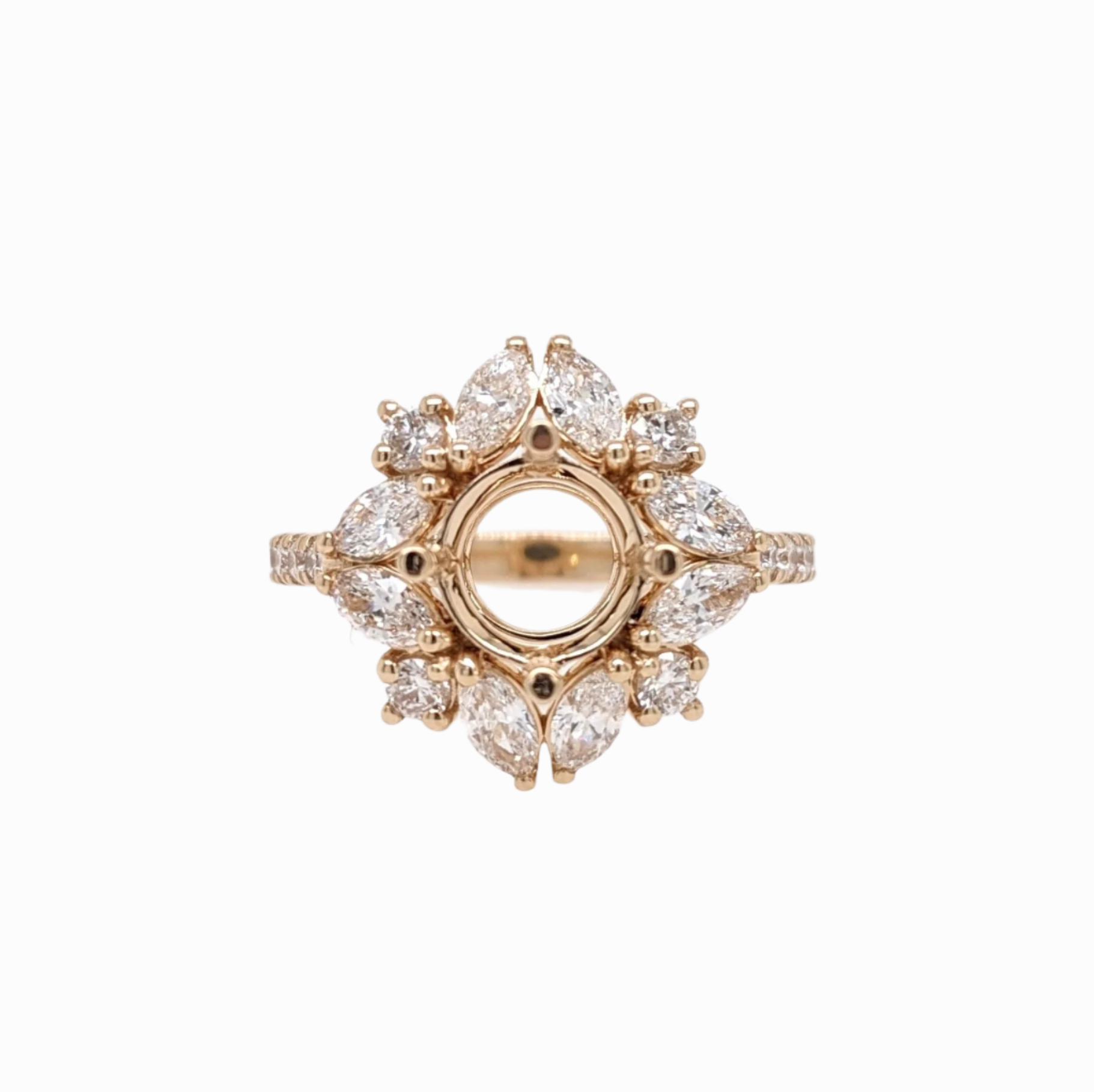 This vintage flower inspired 14K gold ring semi mount featuring a round shape basket with marquise earth mined diamond halo and a pave diamond shank. A statement art deco ring design perfect for an eye catching engagement or anniversary. This ring also makes a beautiful birthstone ring for your loved ones.