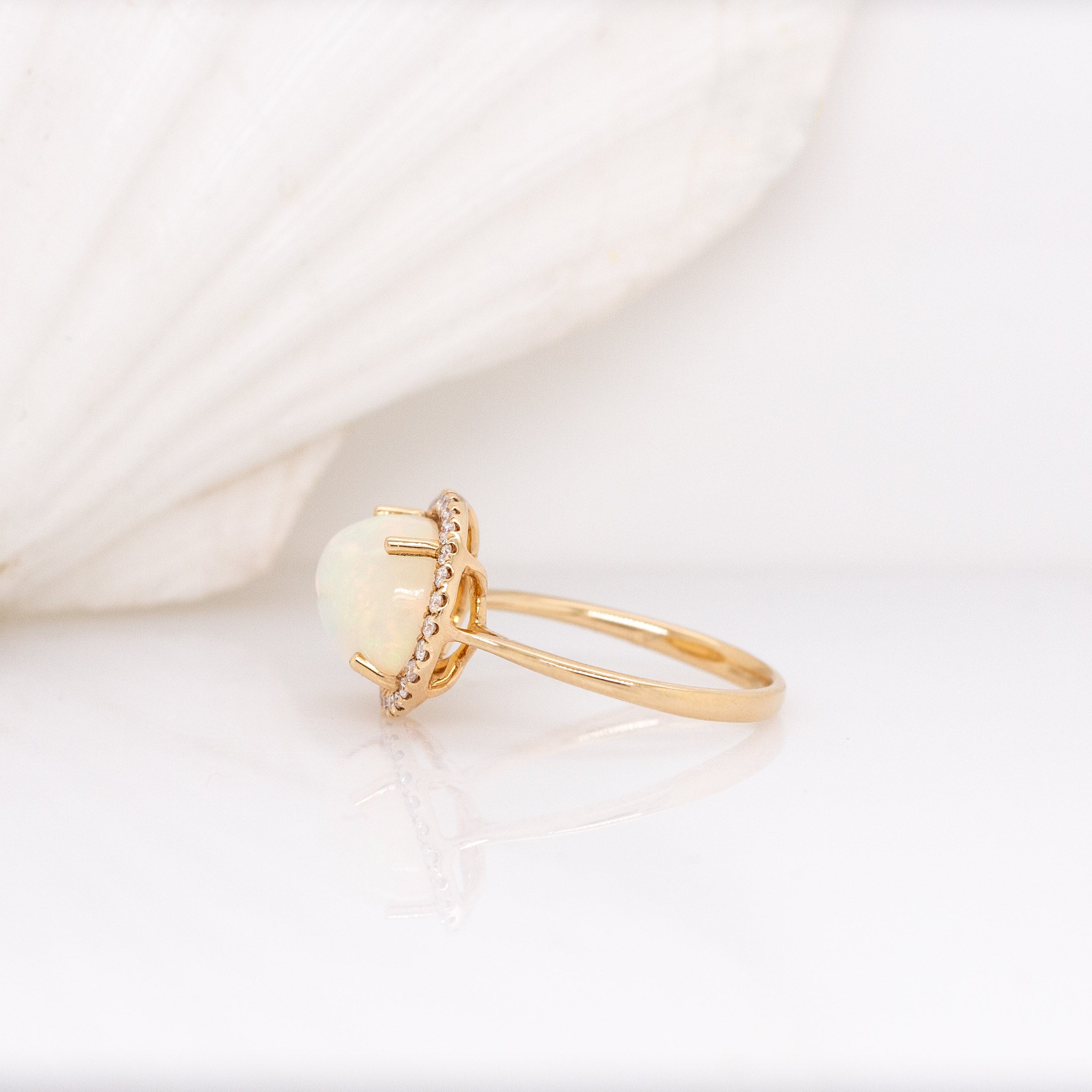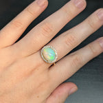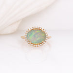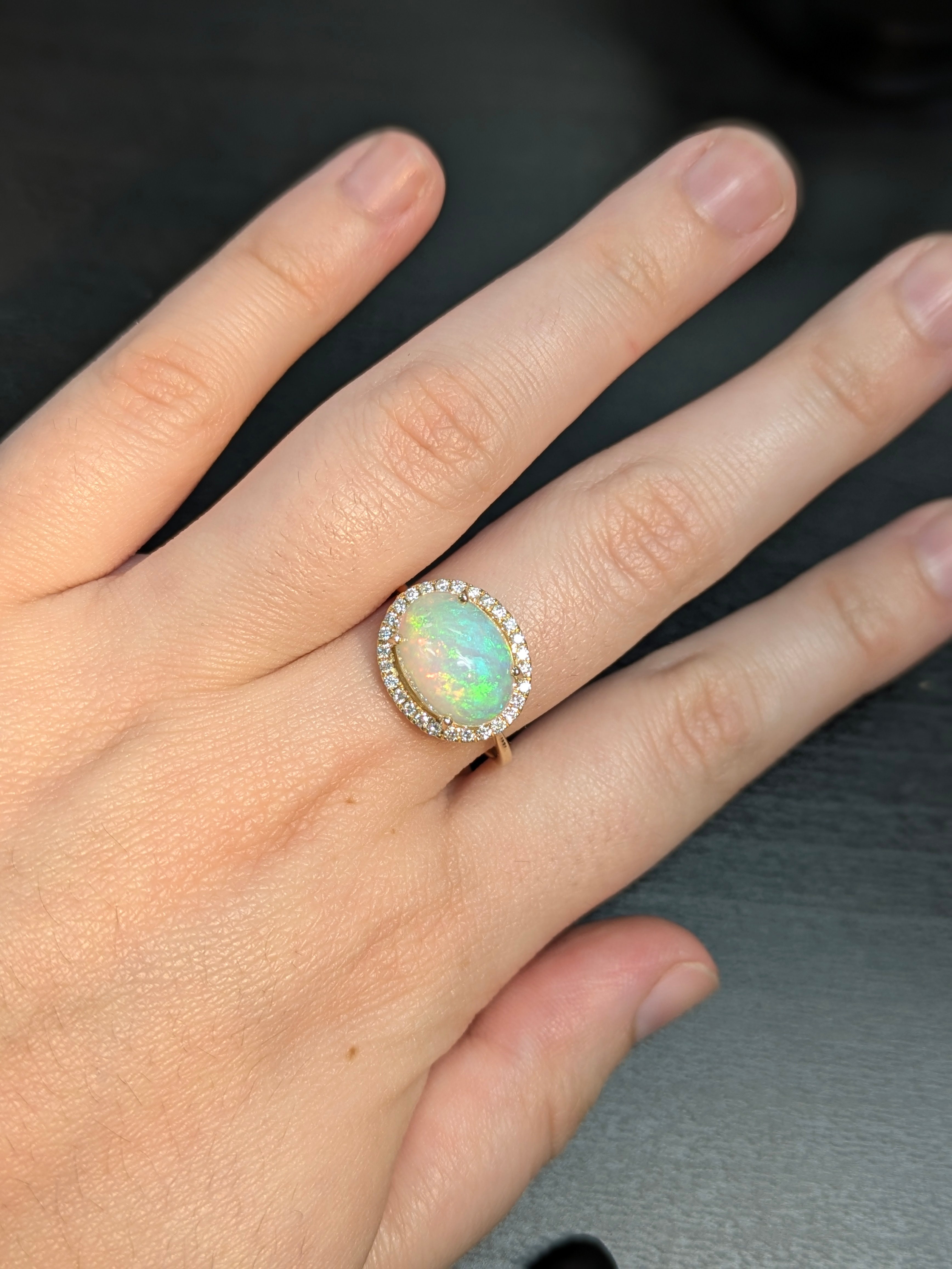 This enchanting ring features a 3.15ct oval Ethiopian opal, measuring 12x10mm, known for its mesmerizing play-of-color that dances with every movement. The opal’s natural iridescence reveals flashes of fiery reds, greens, and blues, making each stone truly one-of-a-kind. Framing the center stone are 28 sparkling diamonds (0.22cttw), delicately set to enhance the opal's brilliance without overshadowing its beauty. Crafted in 14k gold (2.55g), this elegant design is a radiant celebration of color, light, and refined craftsmanship.