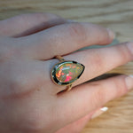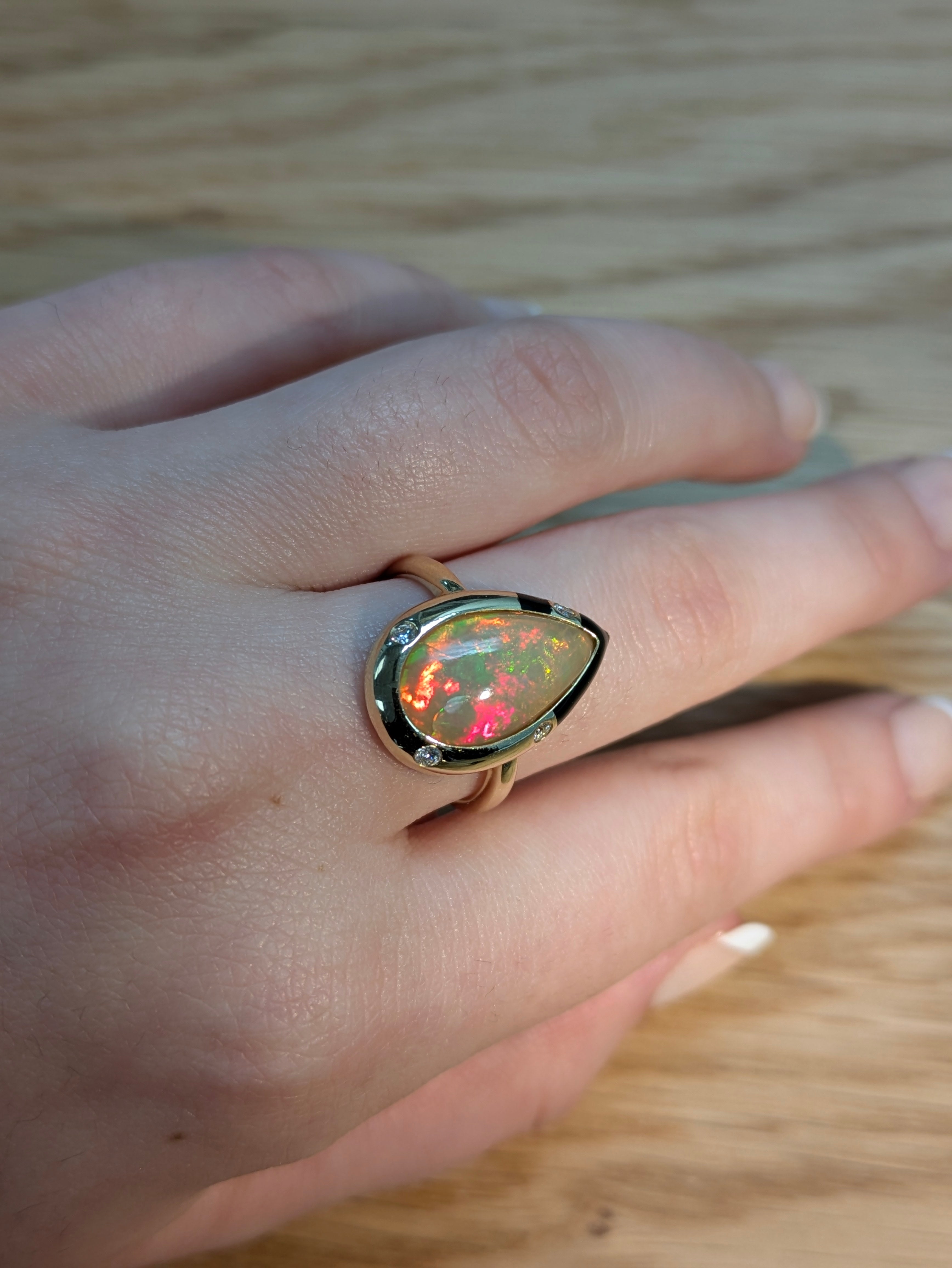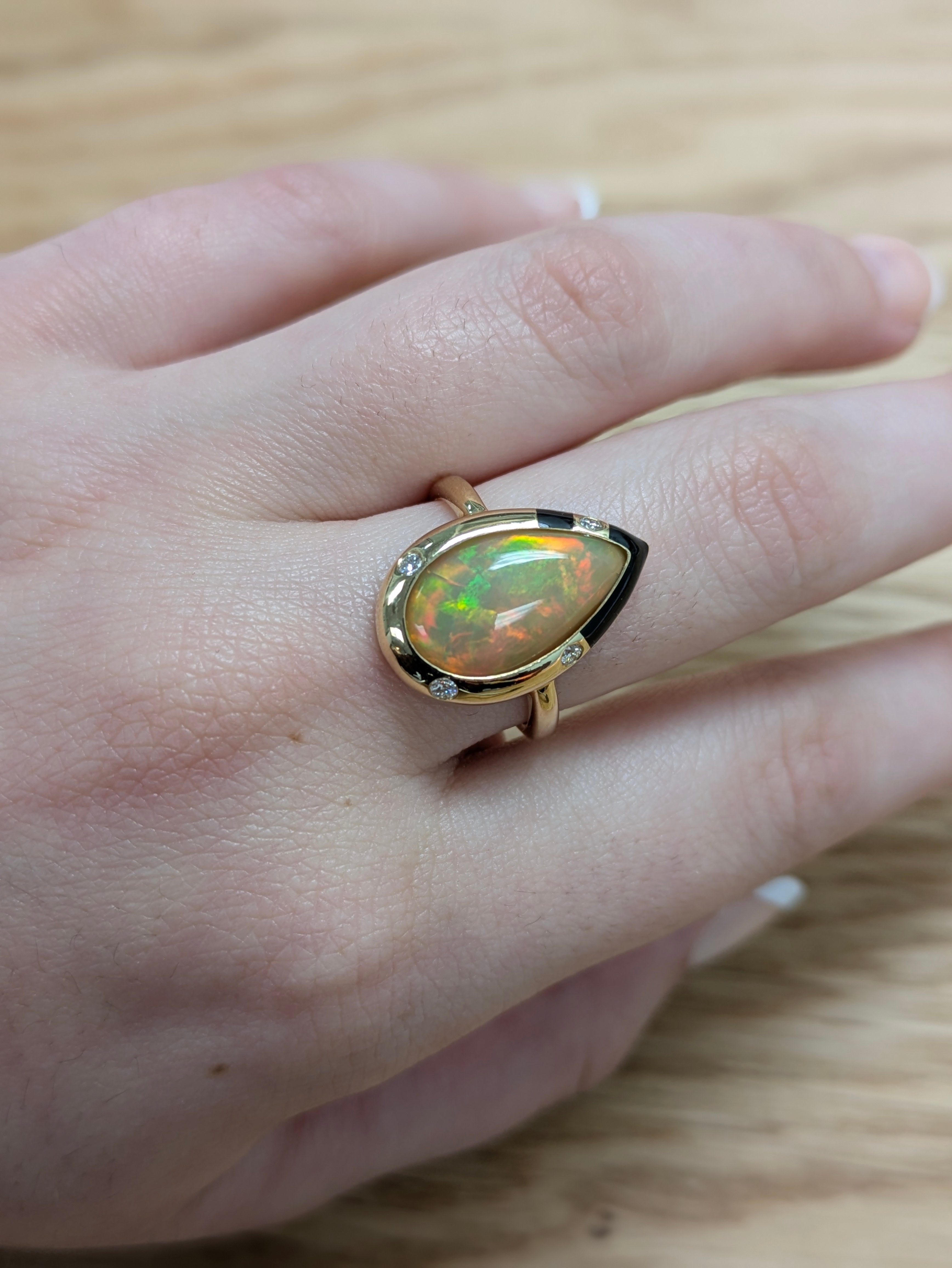 Crafted in 14k gold (3.47g), this graceful ring showcases a luminous 3.93-carat pear-shaped opal from Ethiopia, measuring 16.5x9.8mm. Known for its captivating play-of-color, the opal shimmers with a spectrum of hues that shift with every movement. Four brilliant accent diamonds (0.10cttw) add a subtle sparkle, enhancing the opal’s natural beauty. A refined and timeless piece that’s both eye-catching and elegant