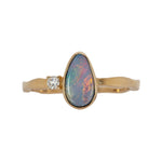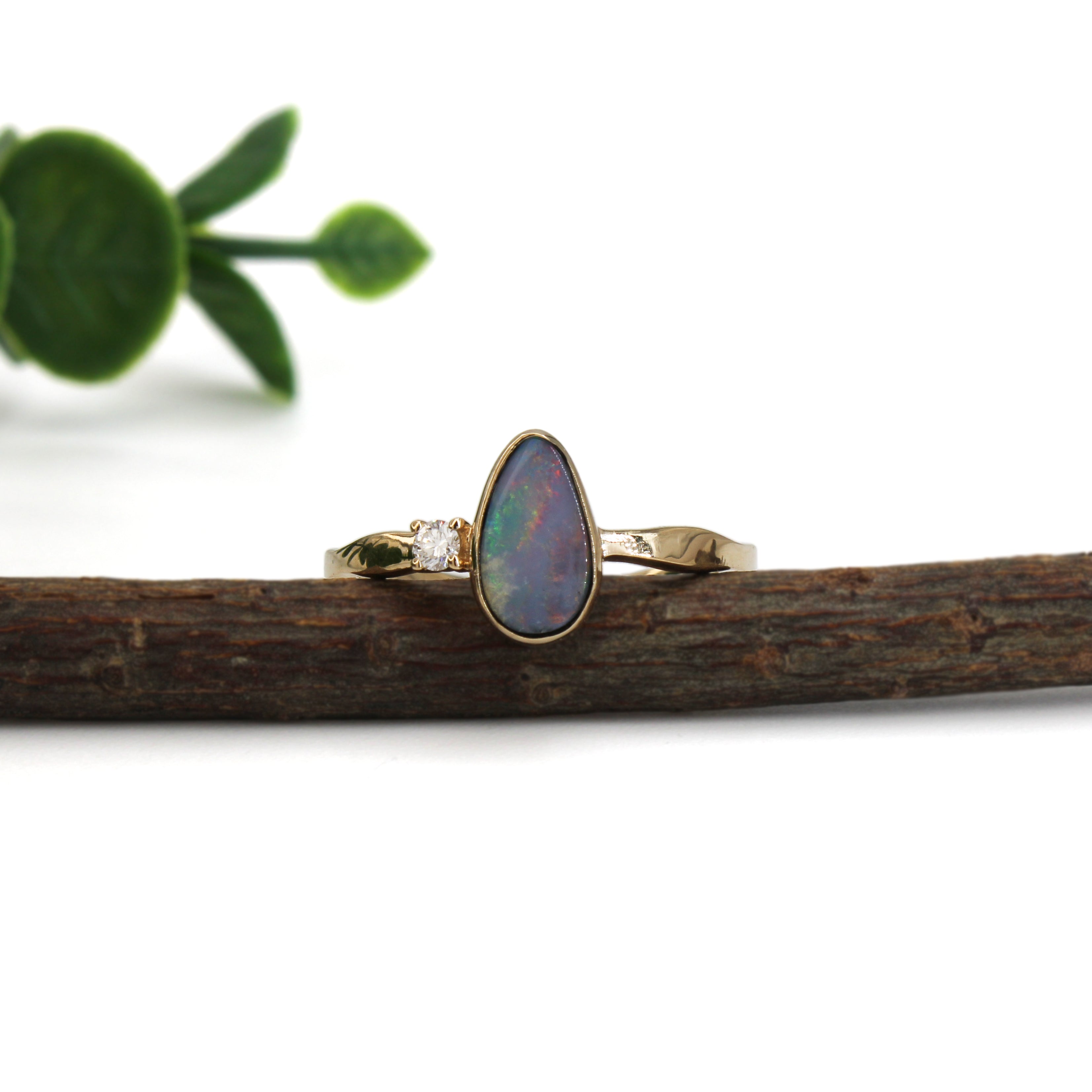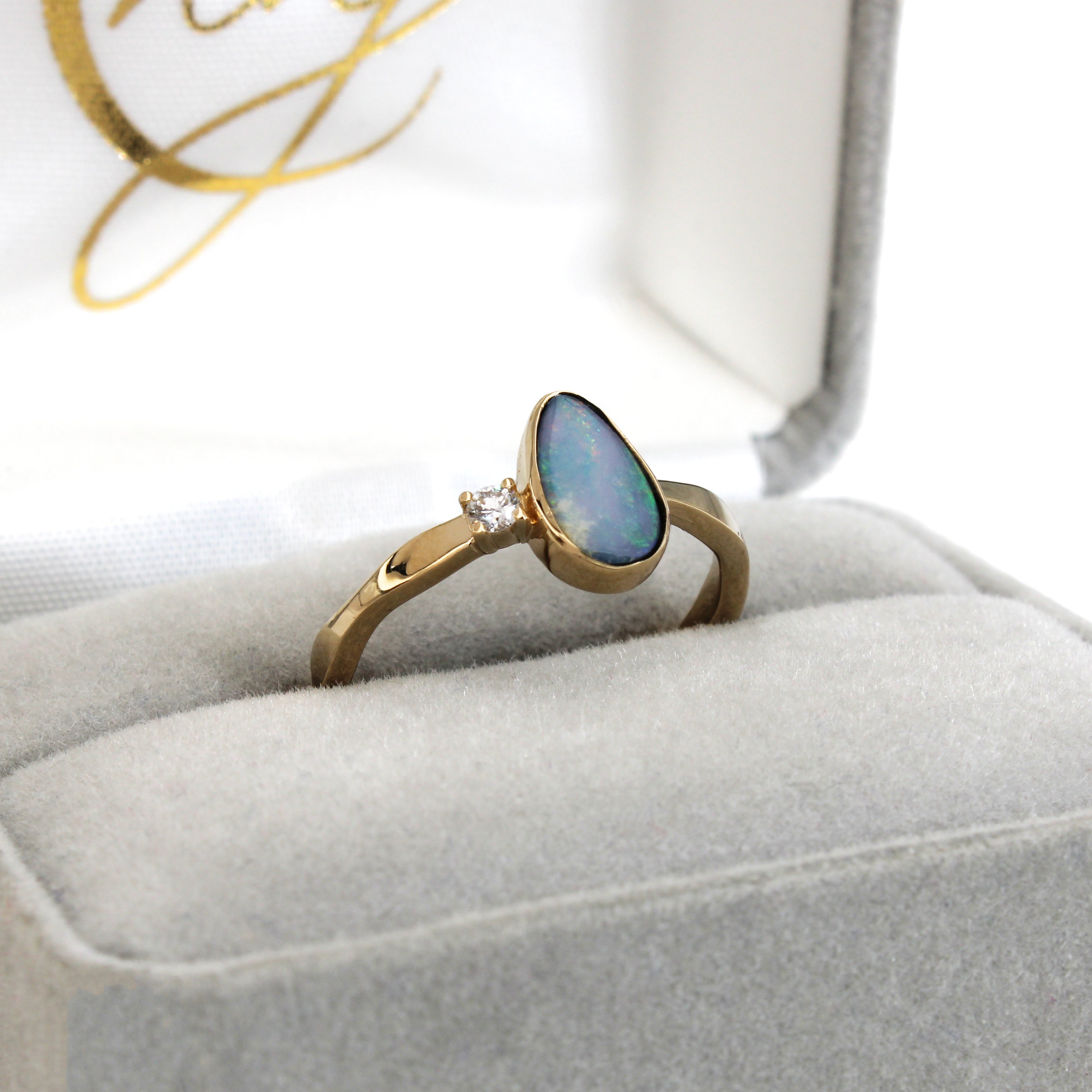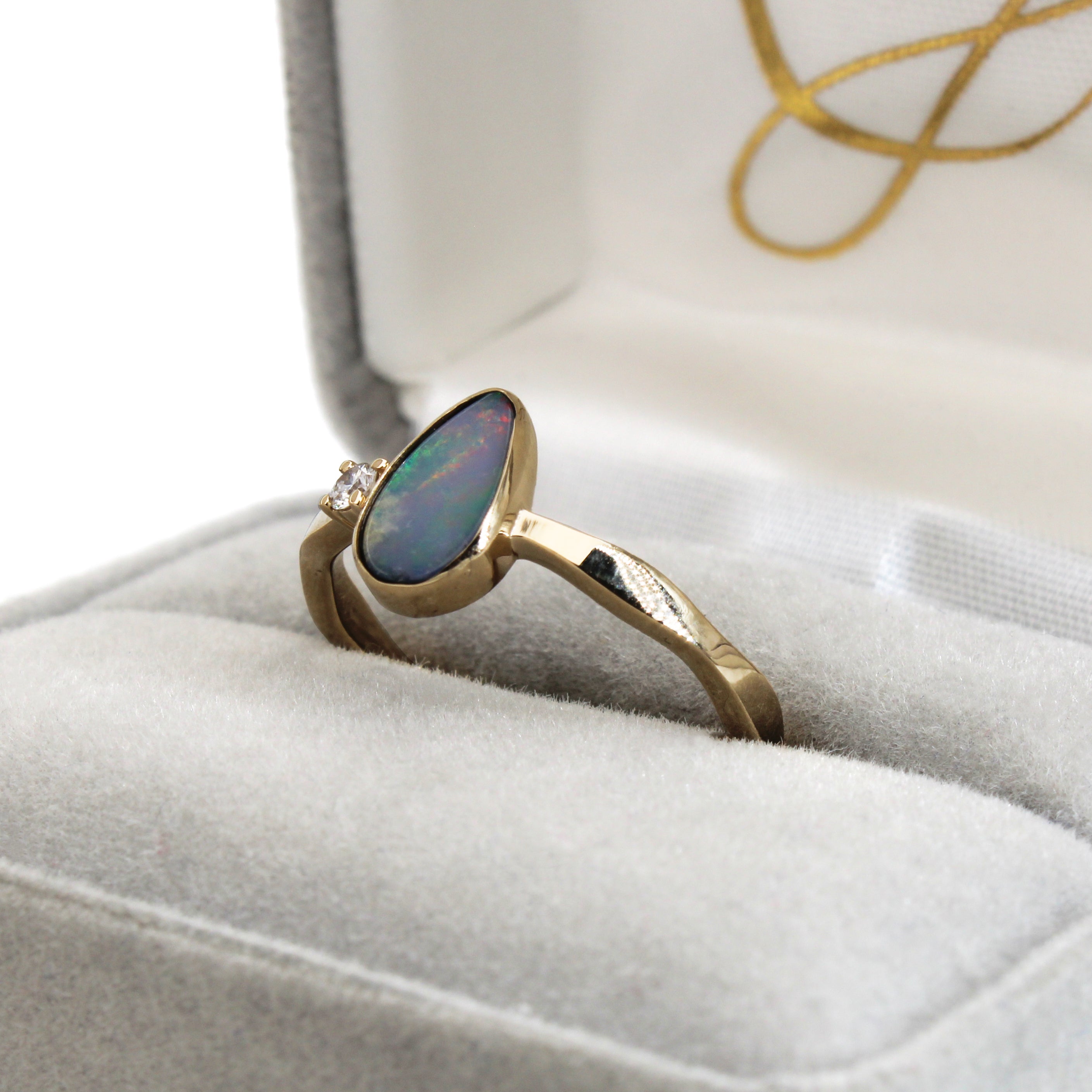 Delicate yet undeniably captivating, this boulder opal ring is a celebration of nature’s artistry and timeless elegance. Set in solid 14K yellow gold, the vibrant opal shimmers with ethereal hues—each stone one-of-a-kind—making this piece as unique as the woman who wears it.