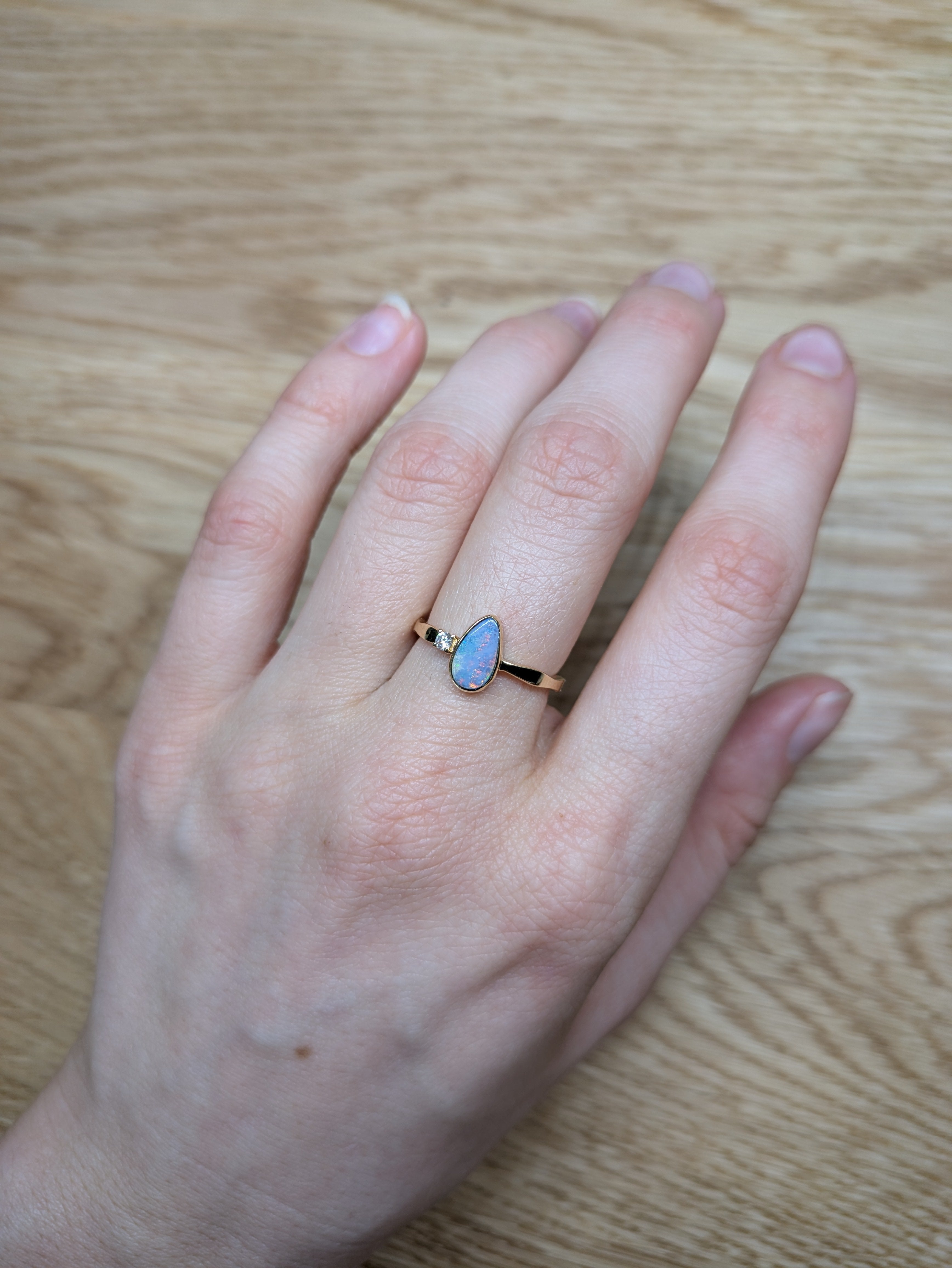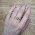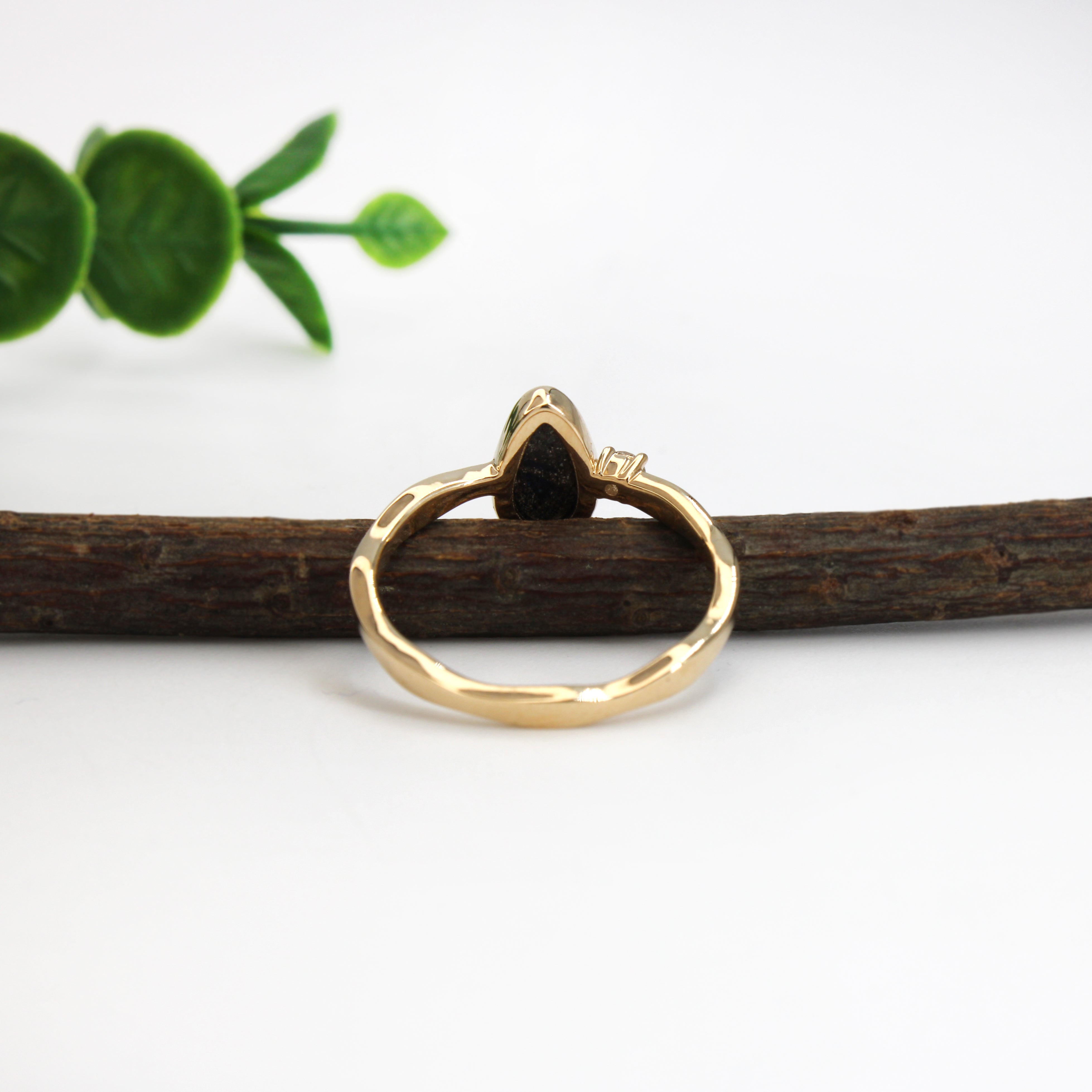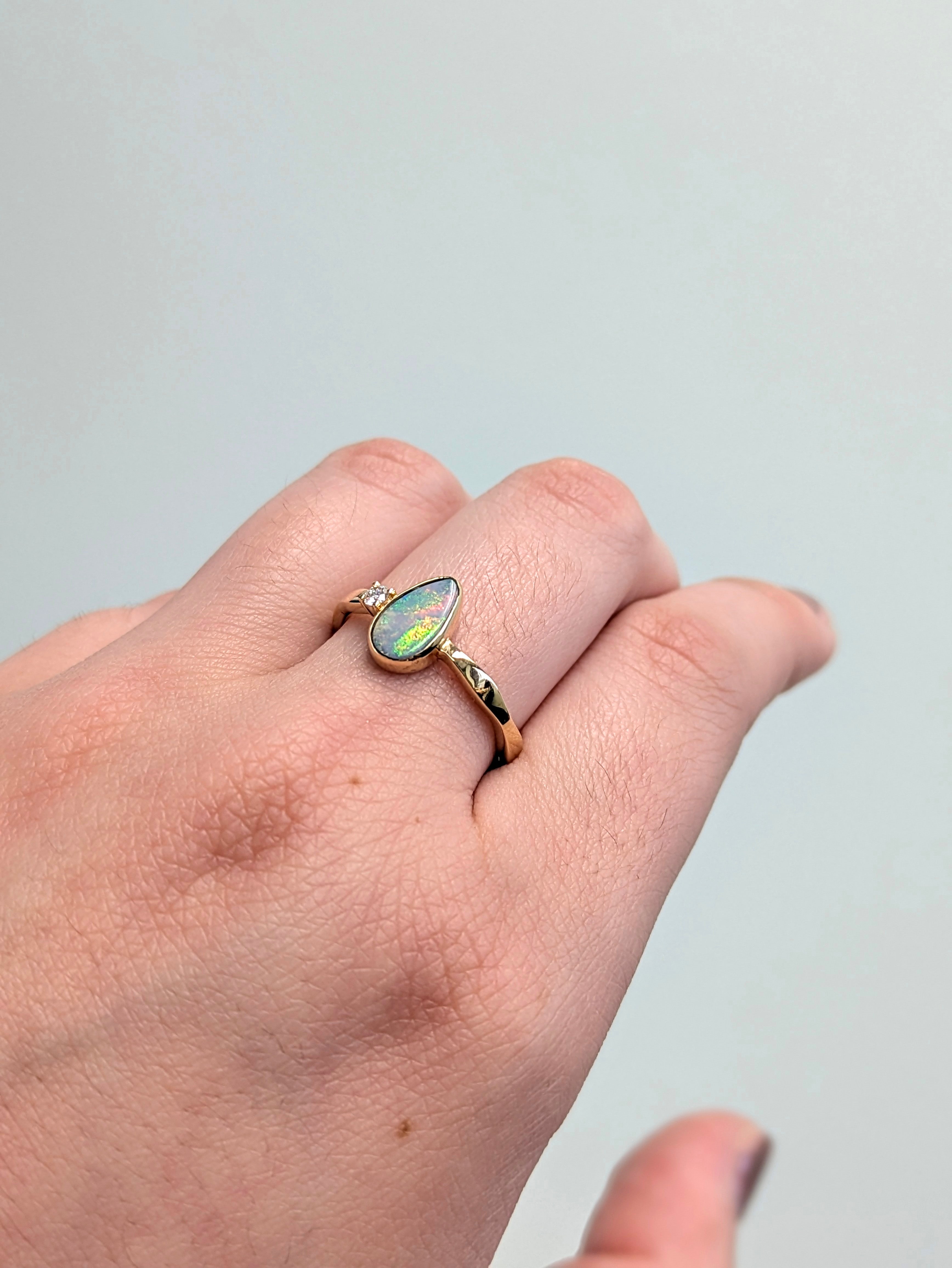 Delicate yet undeniably captivating, this boulder opal ring is a celebration of nature’s artistry and timeless elegance. Set in solid 14K yellow gold, the vibrant opal shimmers with ethereal hues—each stone one-of-a-kind—making this piece as unique as the woman who wears it.