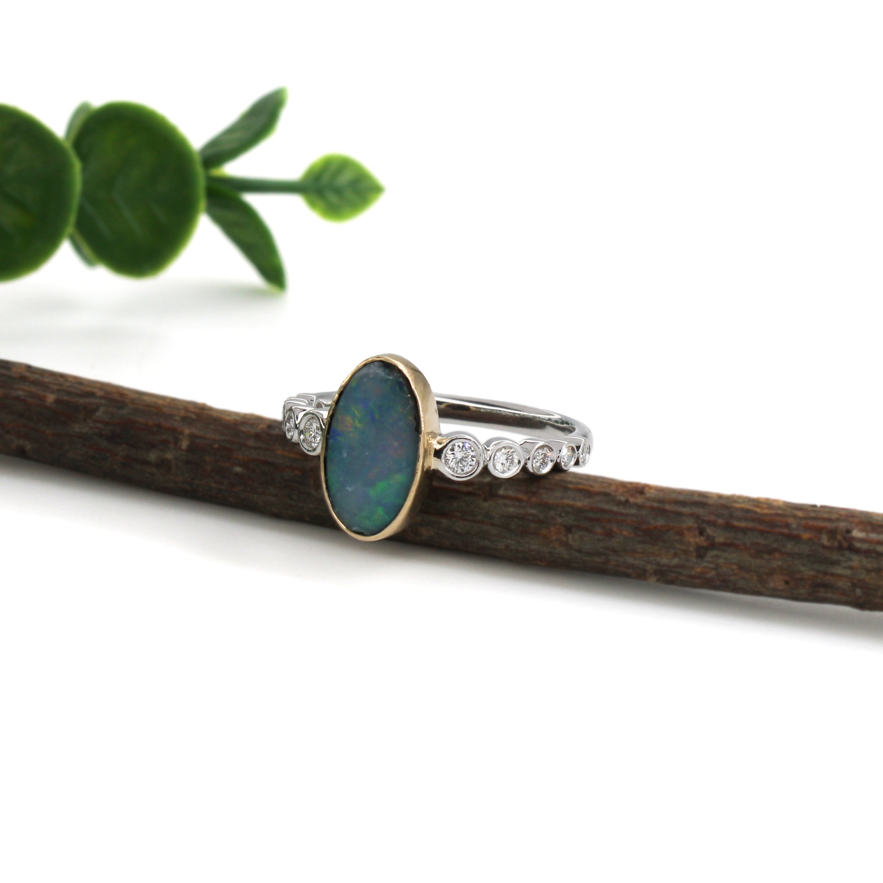 Crafted in 14k gold (1.89g), this distinctive ring showcases a 1.13-carat fancy-shaped boulder opal from Australia, measuring 11x7mm. Known for its vivid color play and natural matrix patterns, the opal radiates with earthy elegance and iridescent charm. Ten sparkling accent diamonds (0.19cttw) add a refined touch of brilliance, perfectly complementing the opal’s unique character. A bold and artistic piece, ideal for those who appreciate one-of-a-kind beauty.