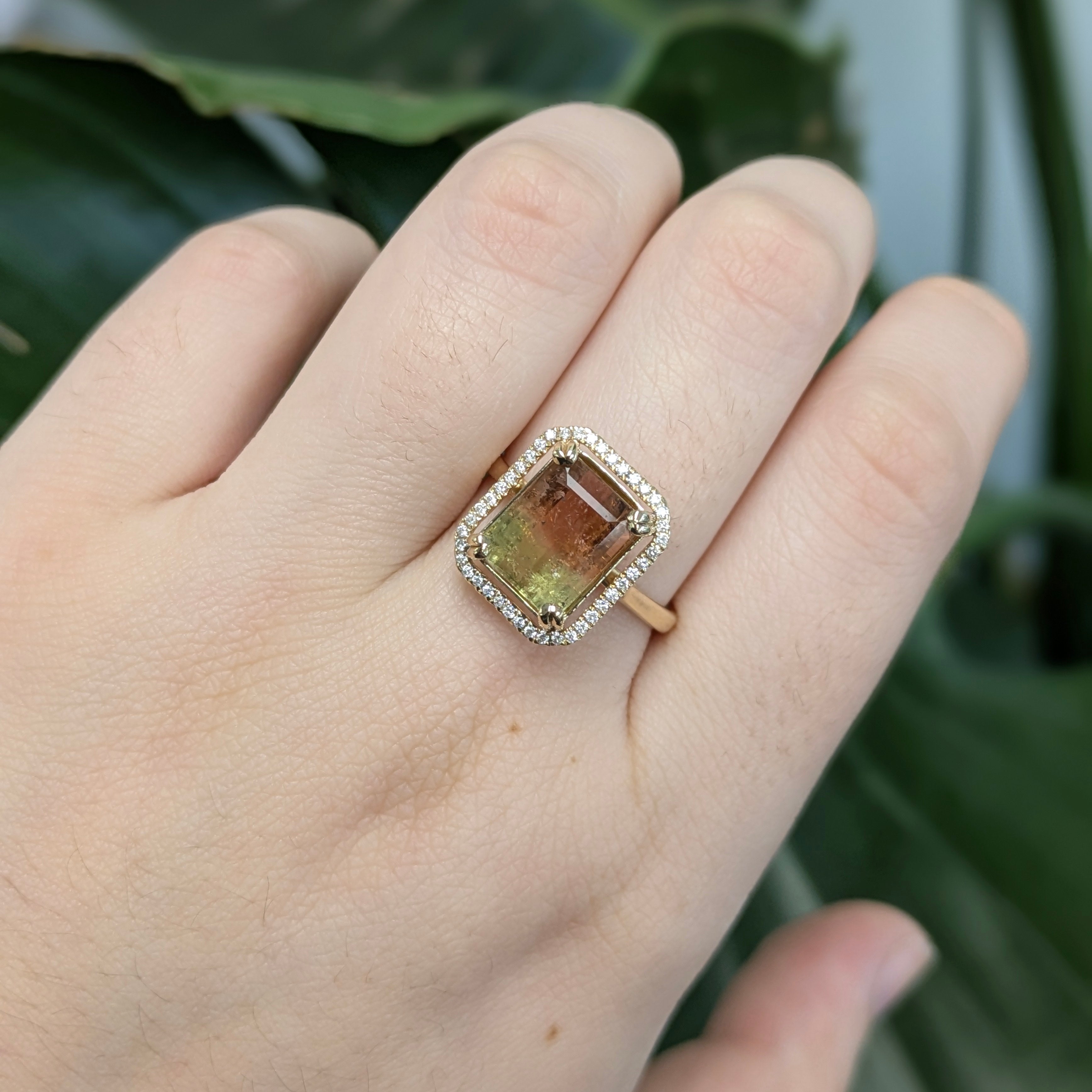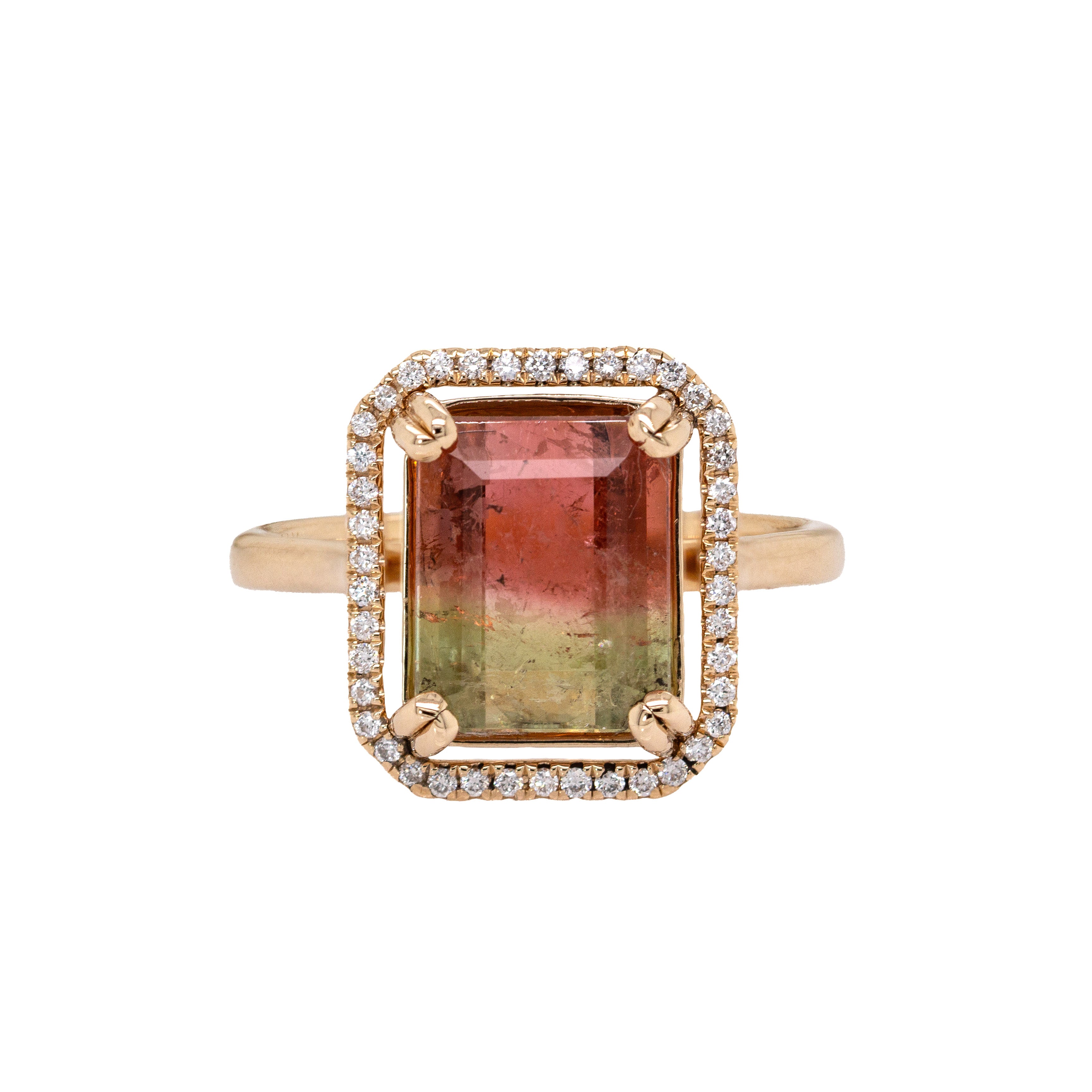 Josie 14K Yellow Gold Bi-Color Tourmaline and Diamond Halo Ring | Emerald Cut 12x8mm