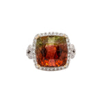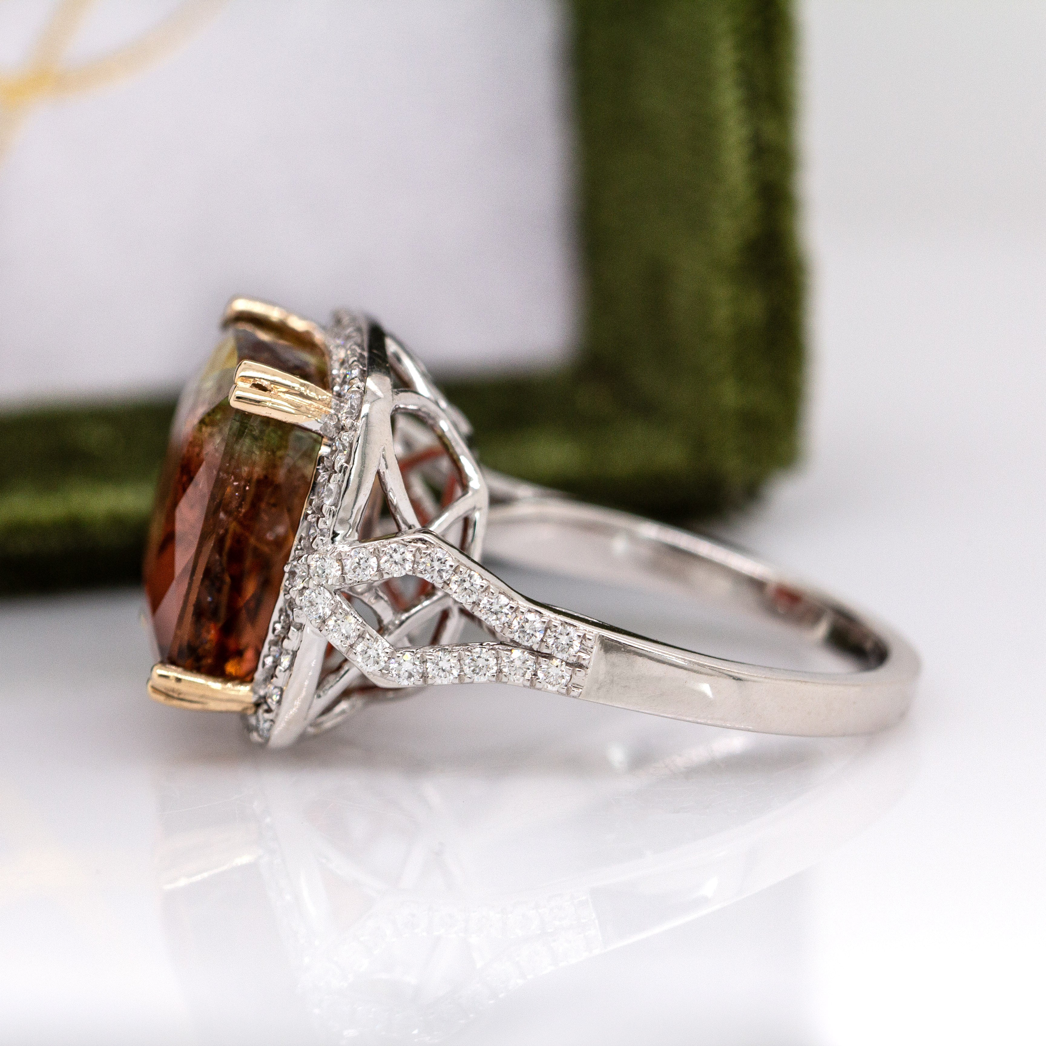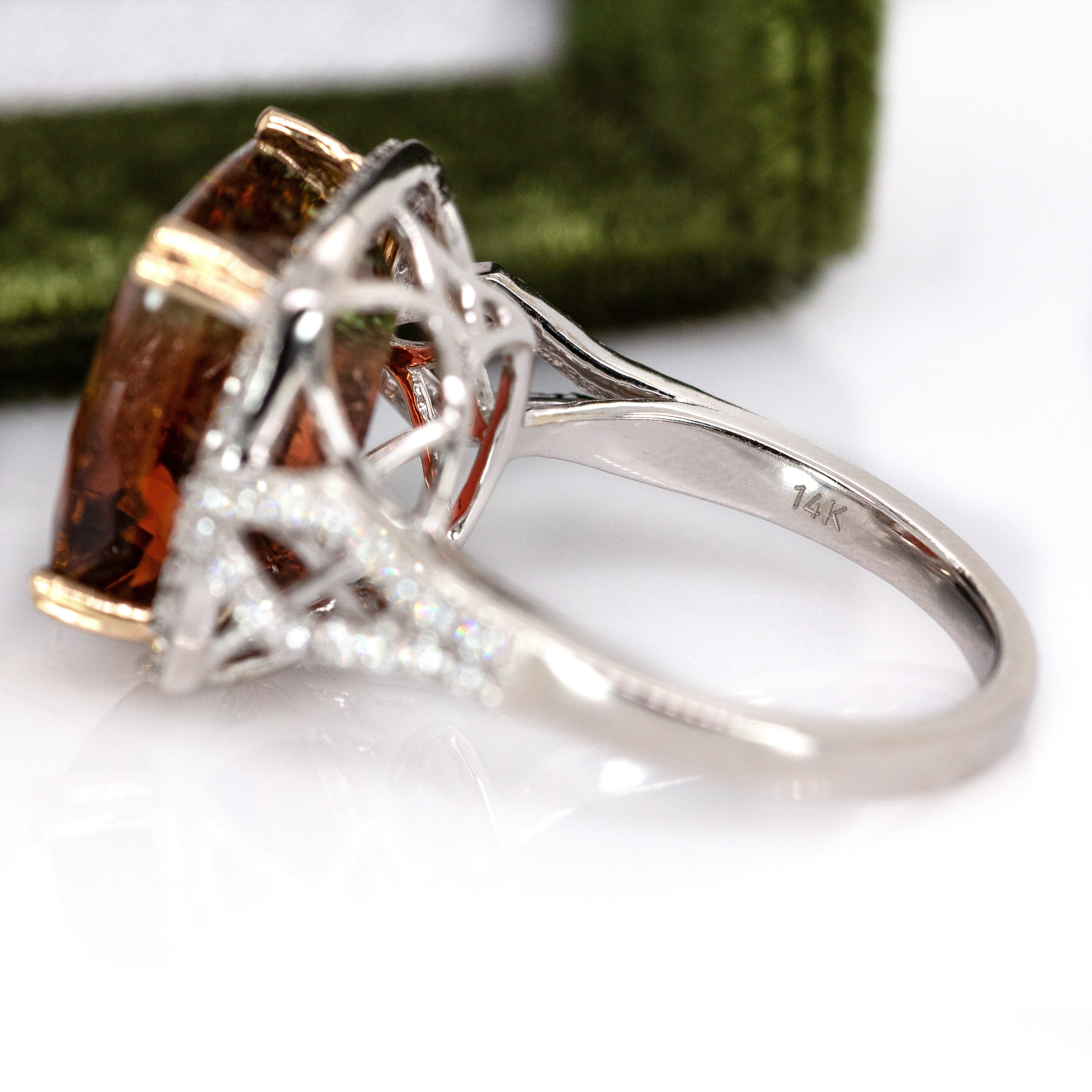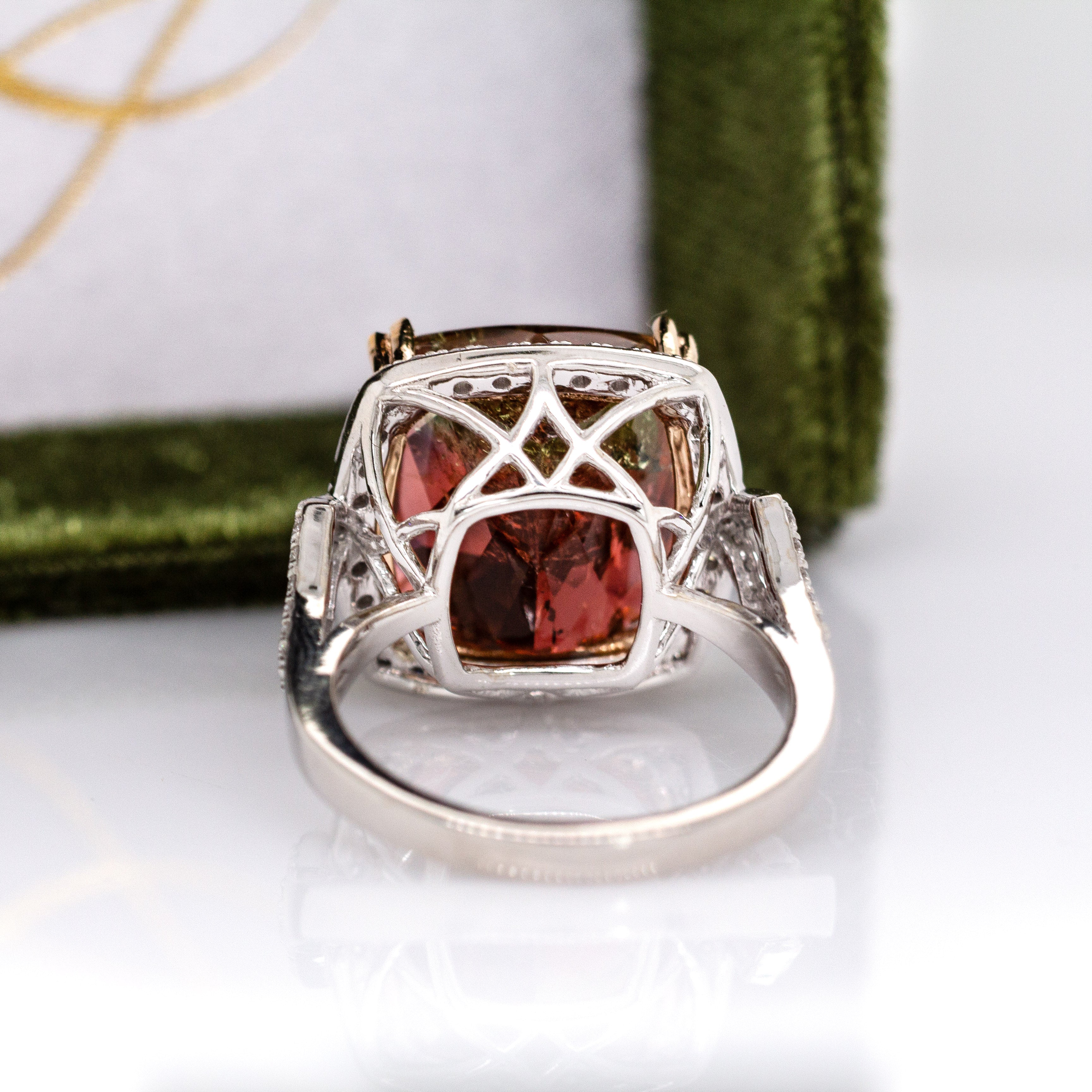 Make a bold and colorful statement with this exquisite 14K gold ring, featuring a stunning 11.3-carat cushion-cut bi-color tourmaline sourced from Brazil. Measuring 13mm, the vibrant center stone showcases a natural blend of hues, beautifully highlighted by 64 sparkling accent diamonds totaling 0.61 carats. Crafted with 5.79 grams of fine 14K gold, this ring combines striking color, expert craftsmanship, and timeless elegance—perfect for those who appreciate unique gemstones and standout design.
