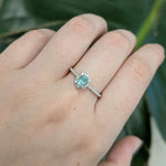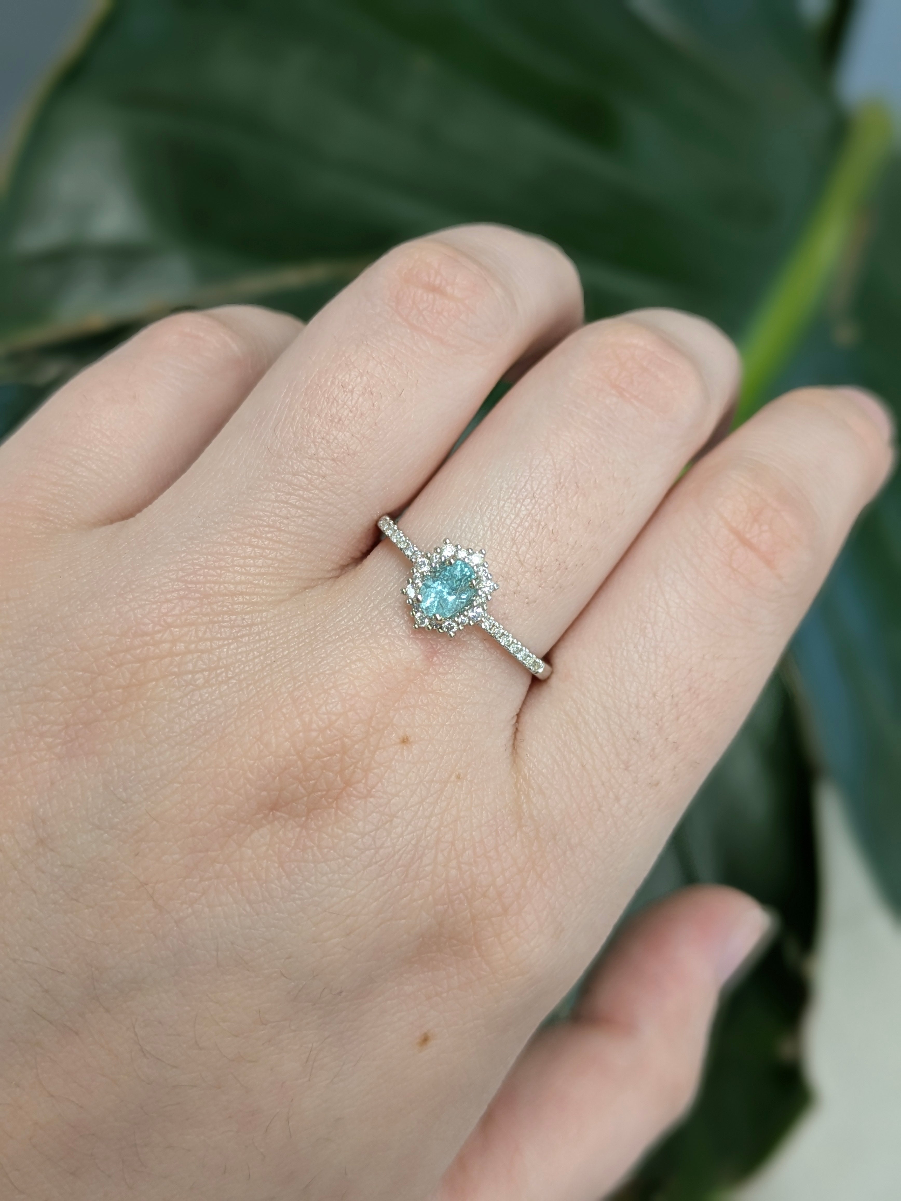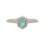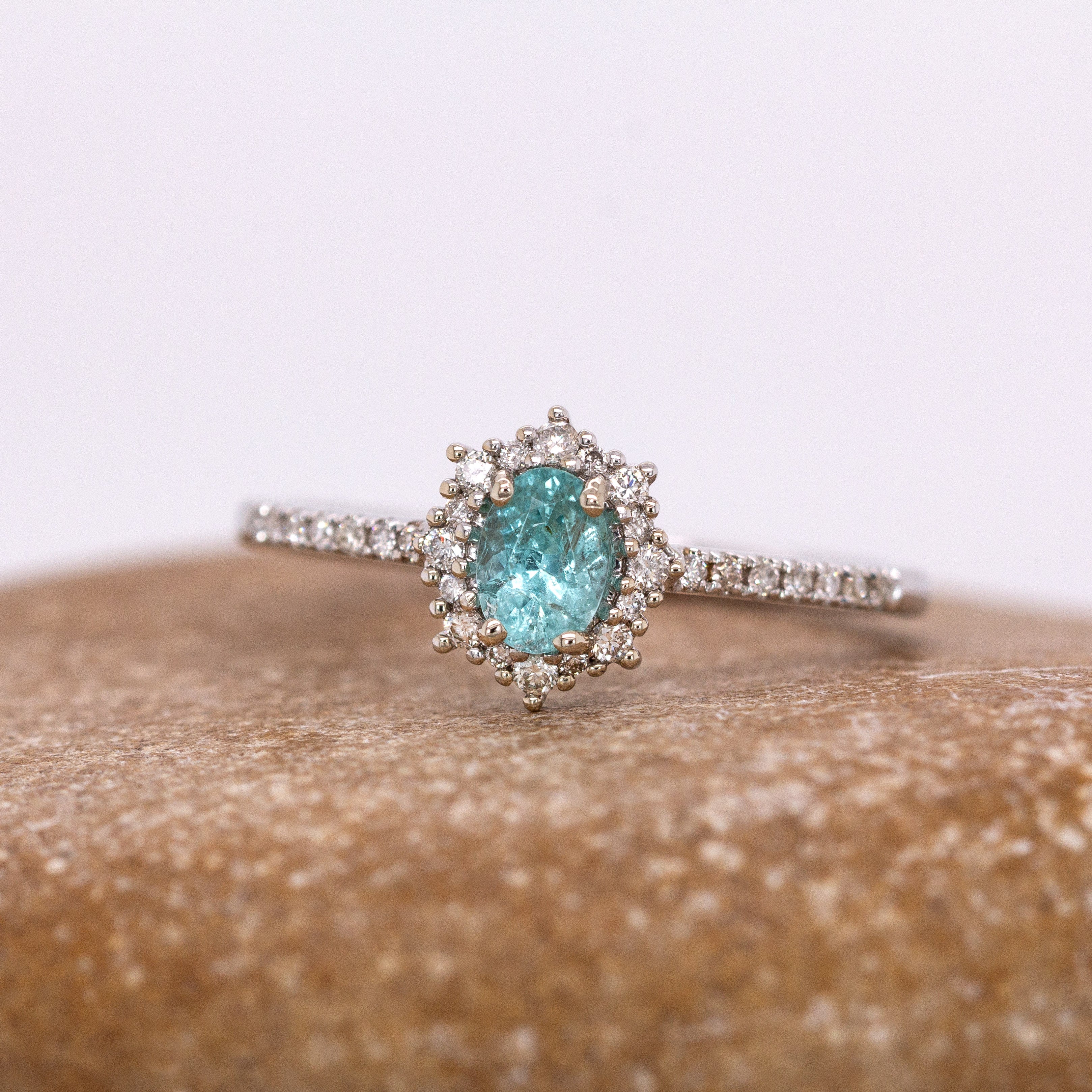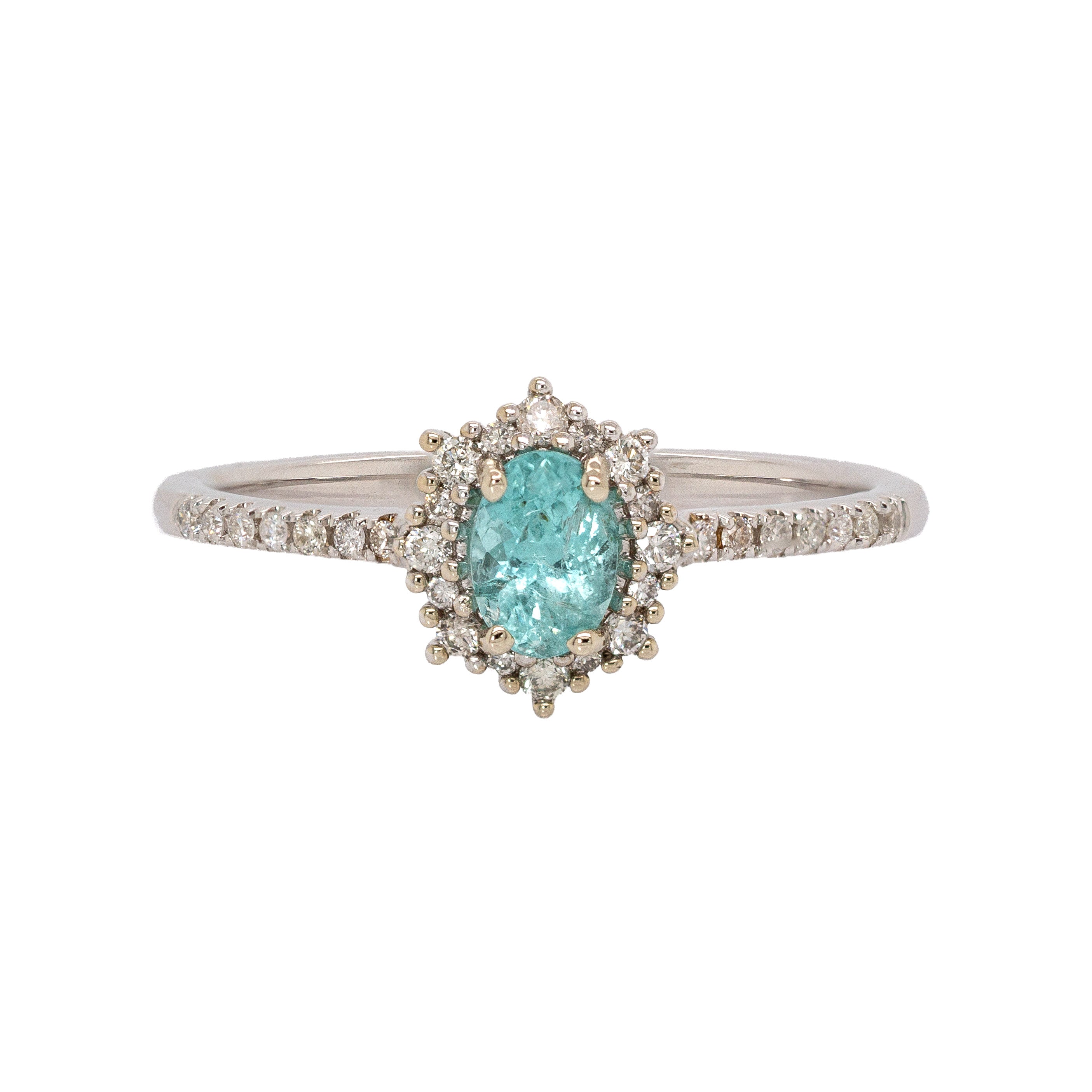 This stunning ring features a 0.34ct oval Afghan Tourmaline, untreated to preserve its natural beauty and vivid color. Sourced from Afghanistan, the 5x4mm center stone is elegantly framed by 32 sparkling diamonds totaling 0.21cttw. Crafted in 14k gold (2.02g), the setting balances sophistication and durability. A refined piece that highlights the rare charm of Afghan Tourmaline with a timeless, elegant design.