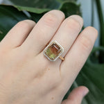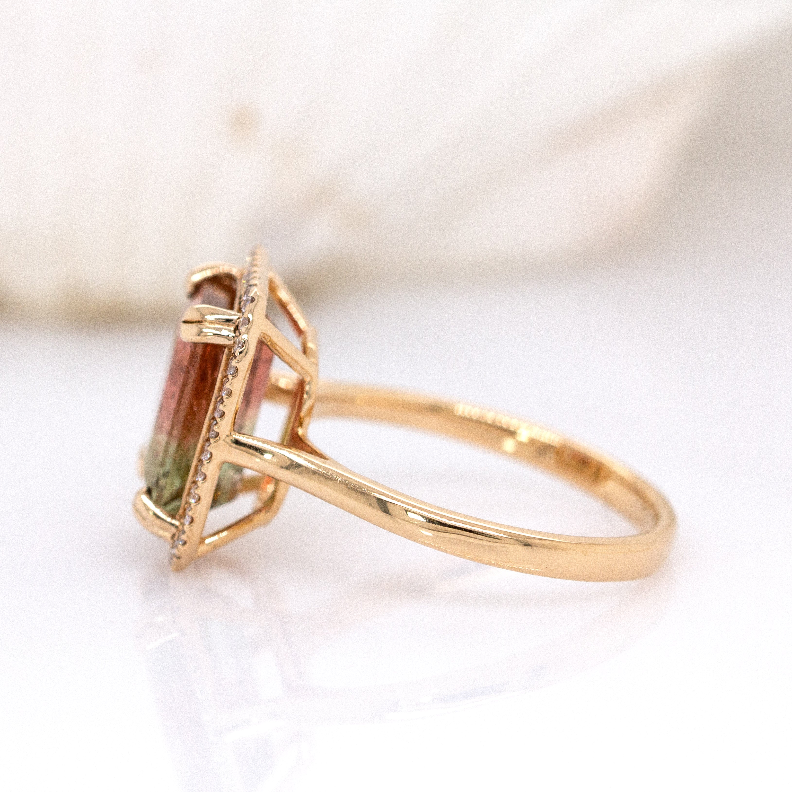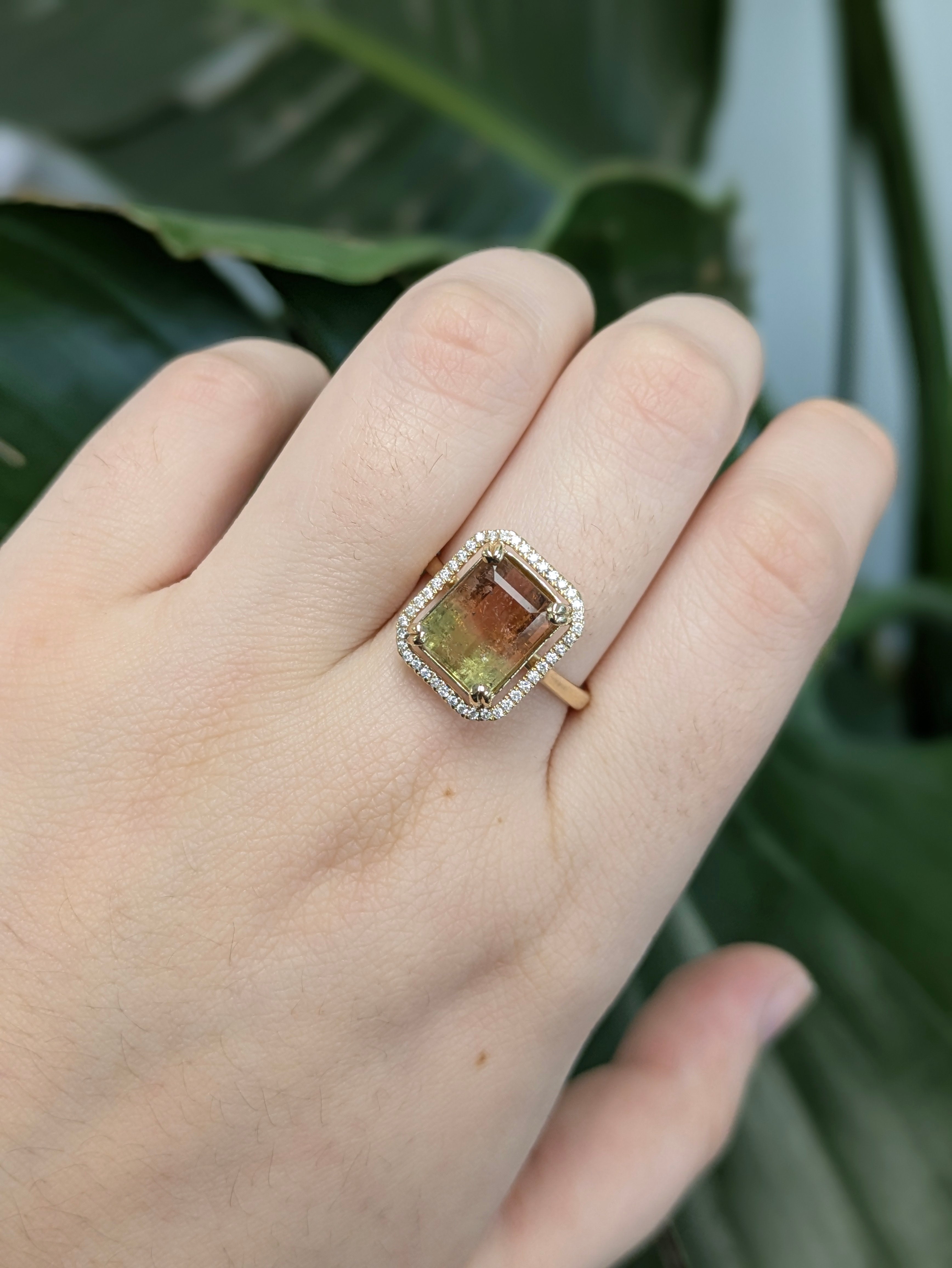 This eye-catching ring features a 3.48-carat emerald-cut bi-color tourmaline from Brazil, measuring 11x9mm. The unique blend of colors within the tourmaline creates a natural gradient effect, adding depth and character to the piece. Set in 2.96 grams of 14k gold, the center stone is surrounded by 42 delicate diamonds totaling 0.15 carats. With its striking contrast of color and sparkle, this ring is a perfect balance of bold design and refined elegance—ideal for those who appreciate one-of-a-kind gemstones.
