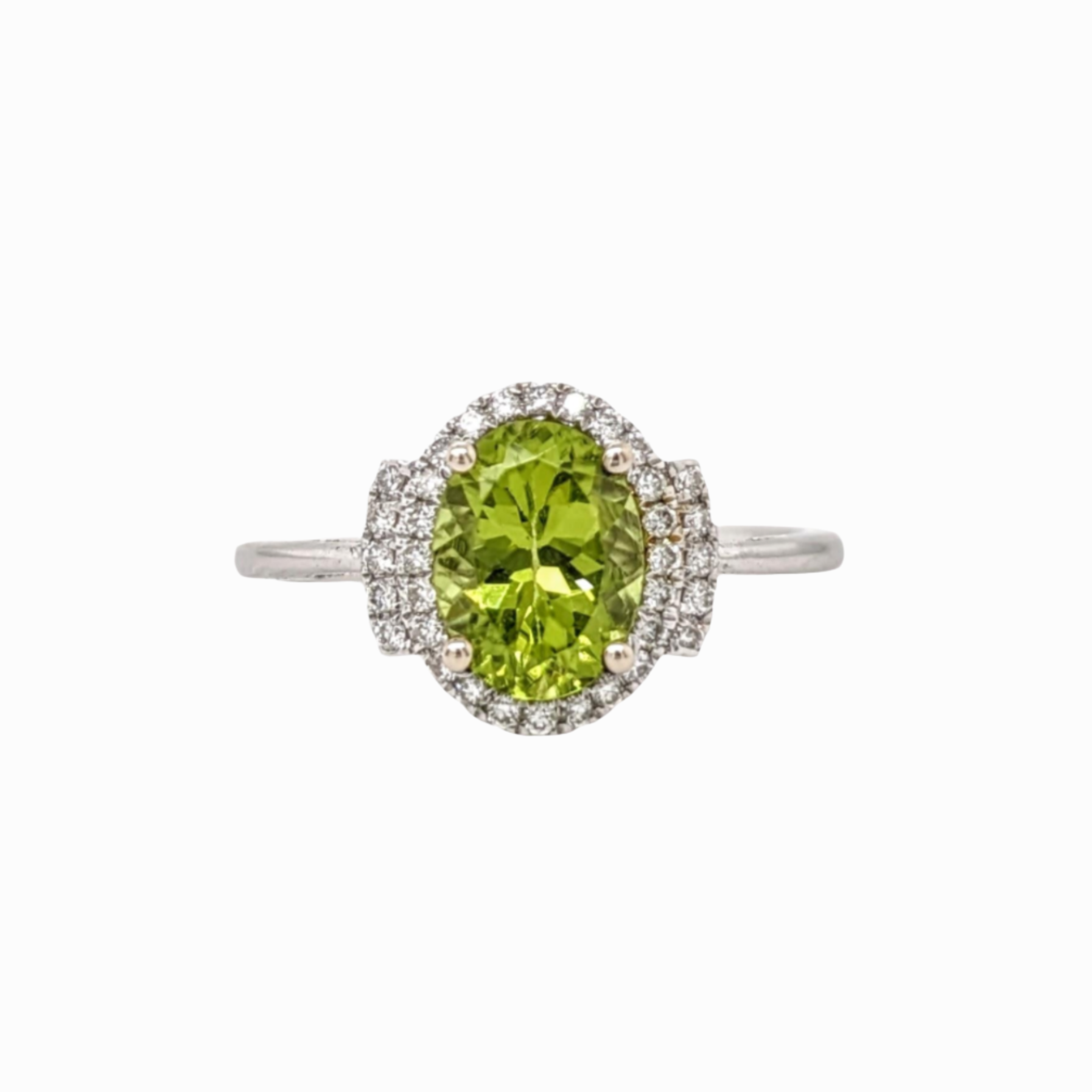 1.3ct Peridot Ring w Earth Mined Diamonds in Solid 14K White Gold | Oval 8x6mm