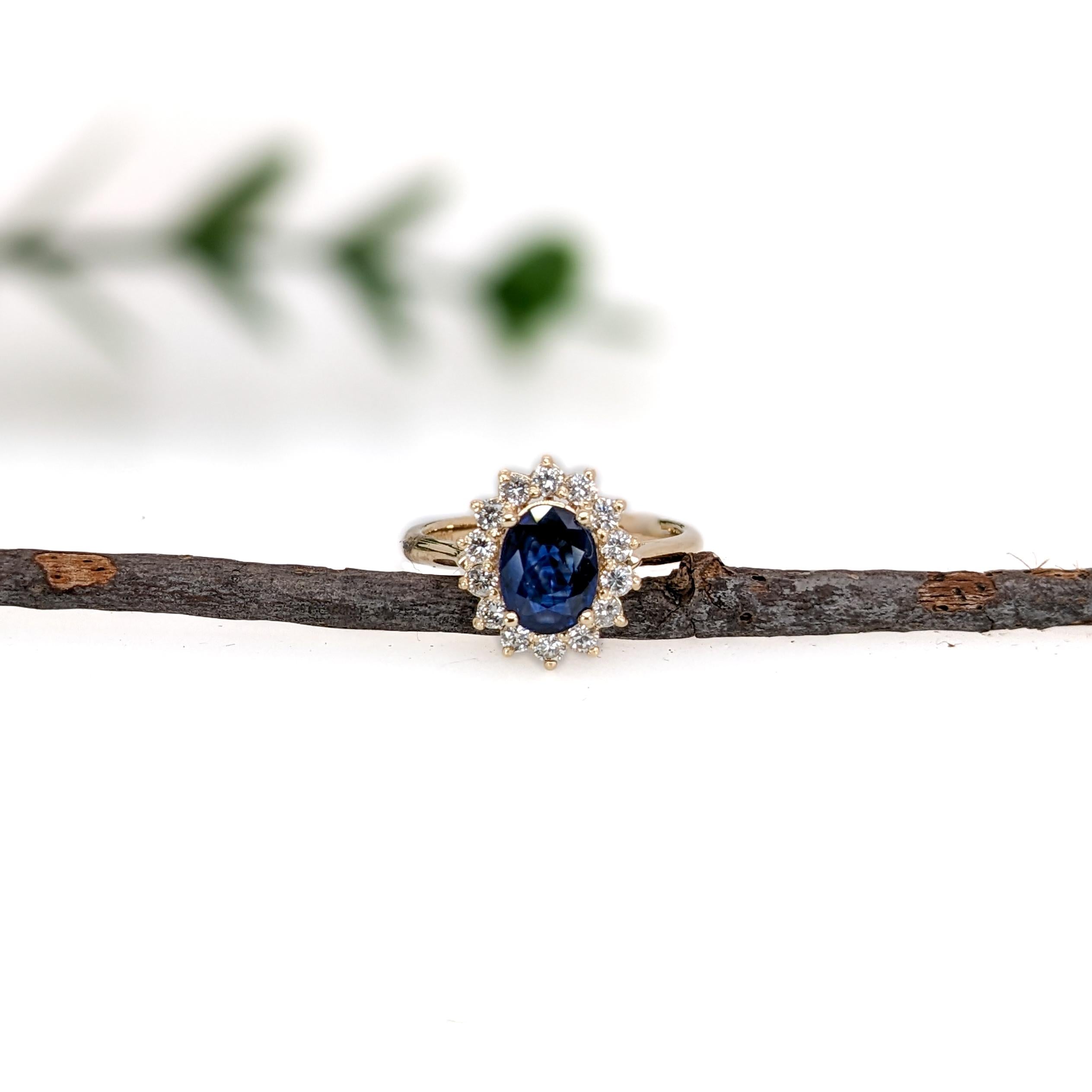 1.4ct Princess Diana Sapphire Ring w Natural Diamond Halo in 14K Yellow Gold