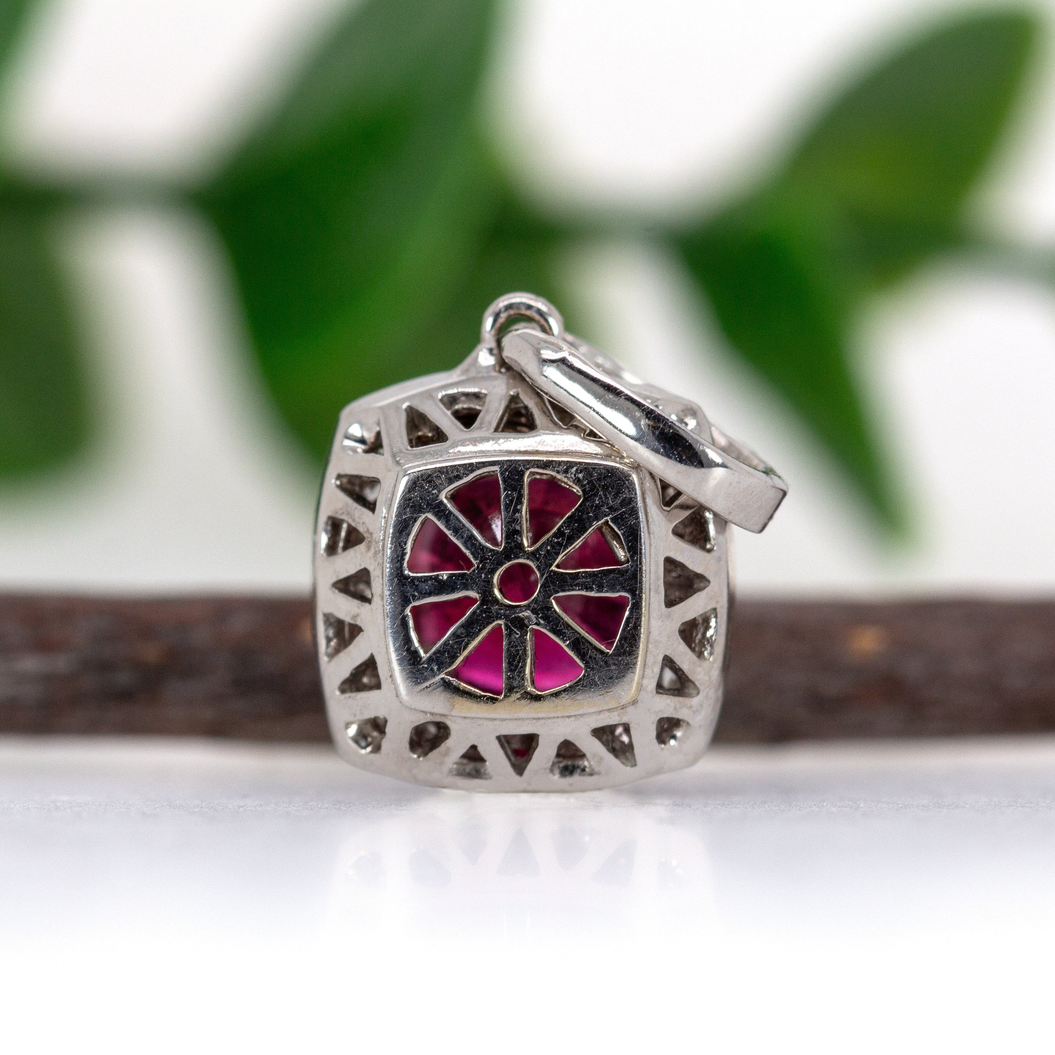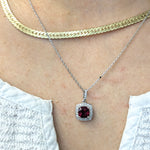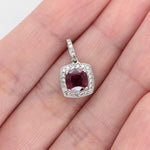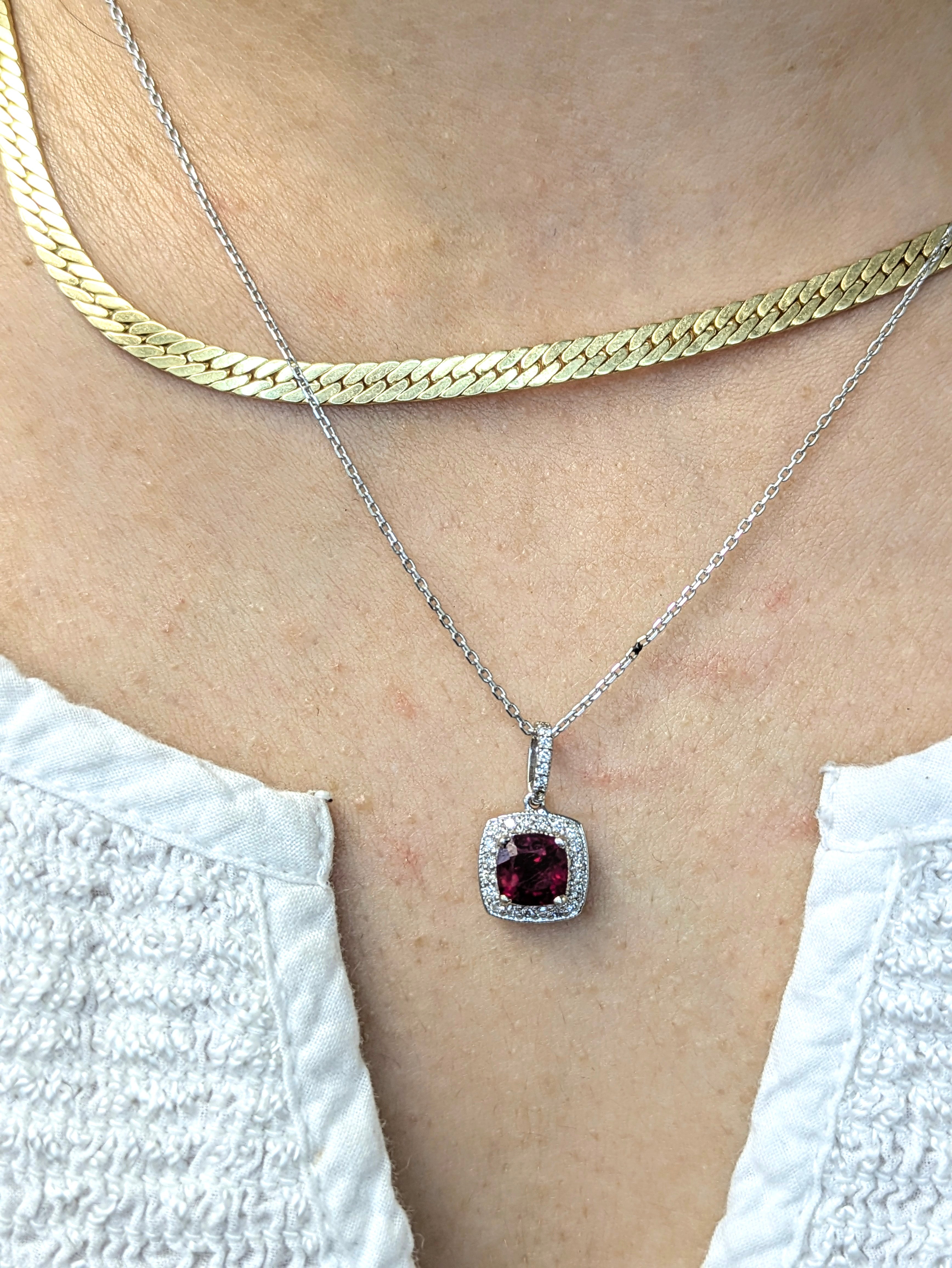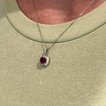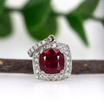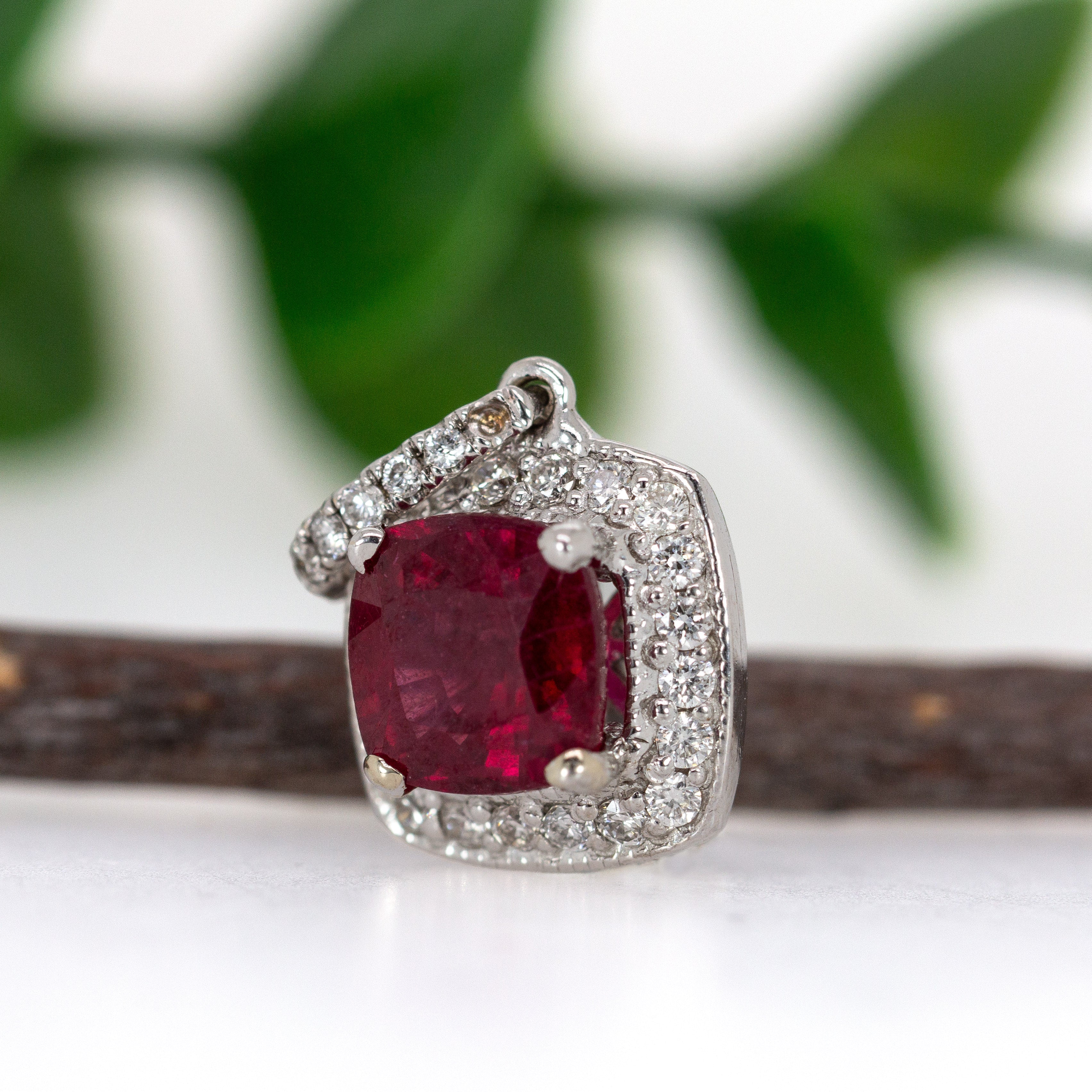 This beautiful pendant features a 1.24-carat cushion-cut ruby gemstone with a halo of natural earth-mined diamonds and a diamond-studded bail, all set in solid 14K gold. This pendant can be a lovely July birthstone gift for your loved ones!