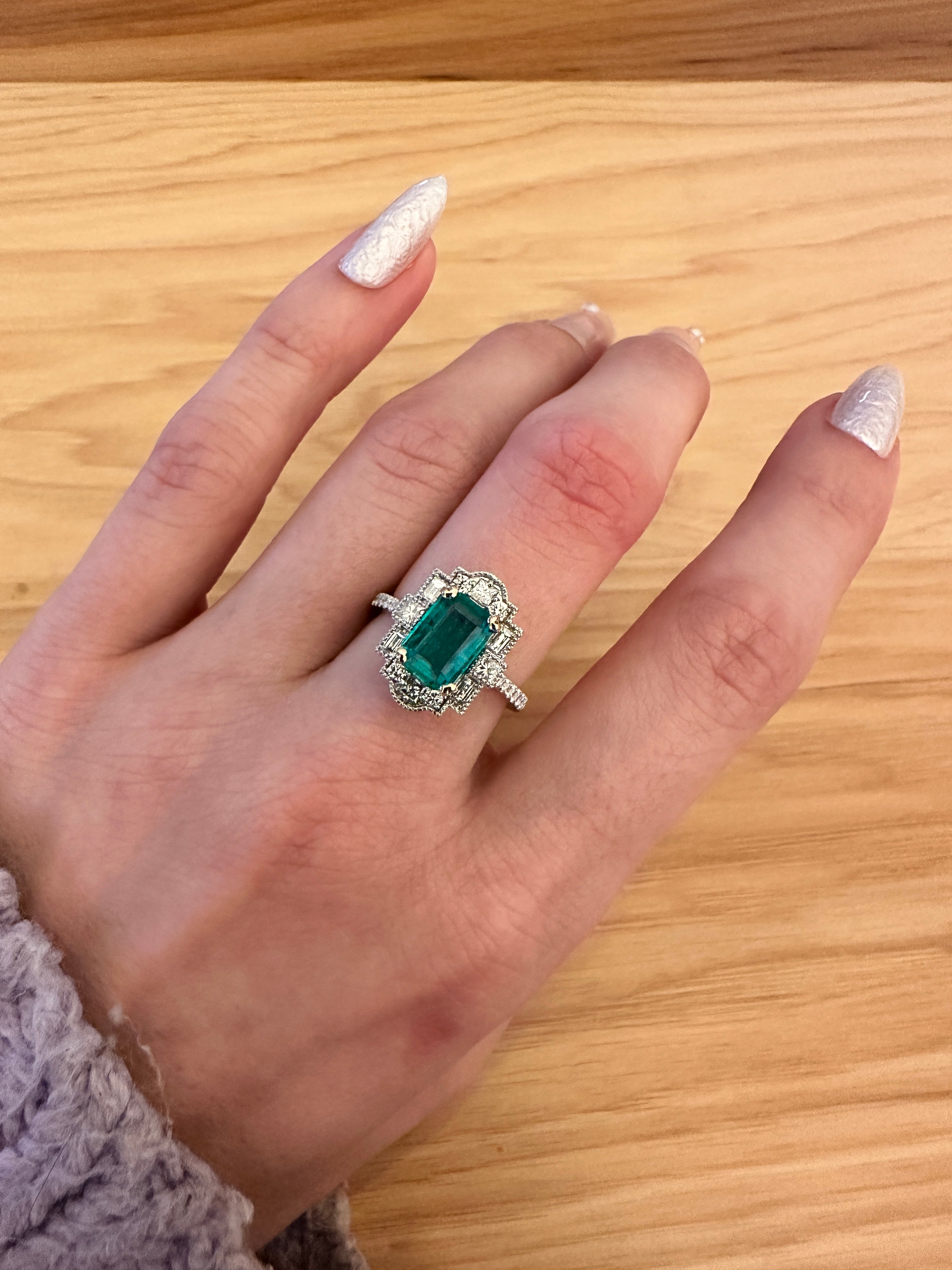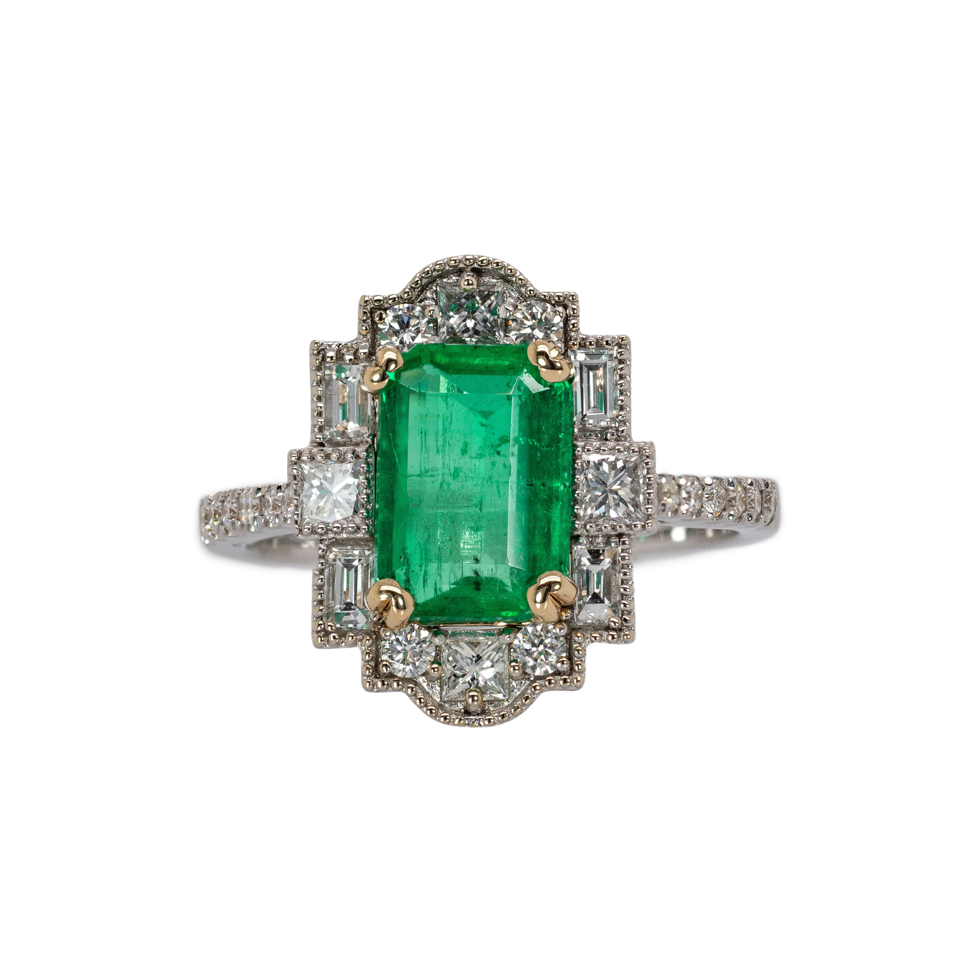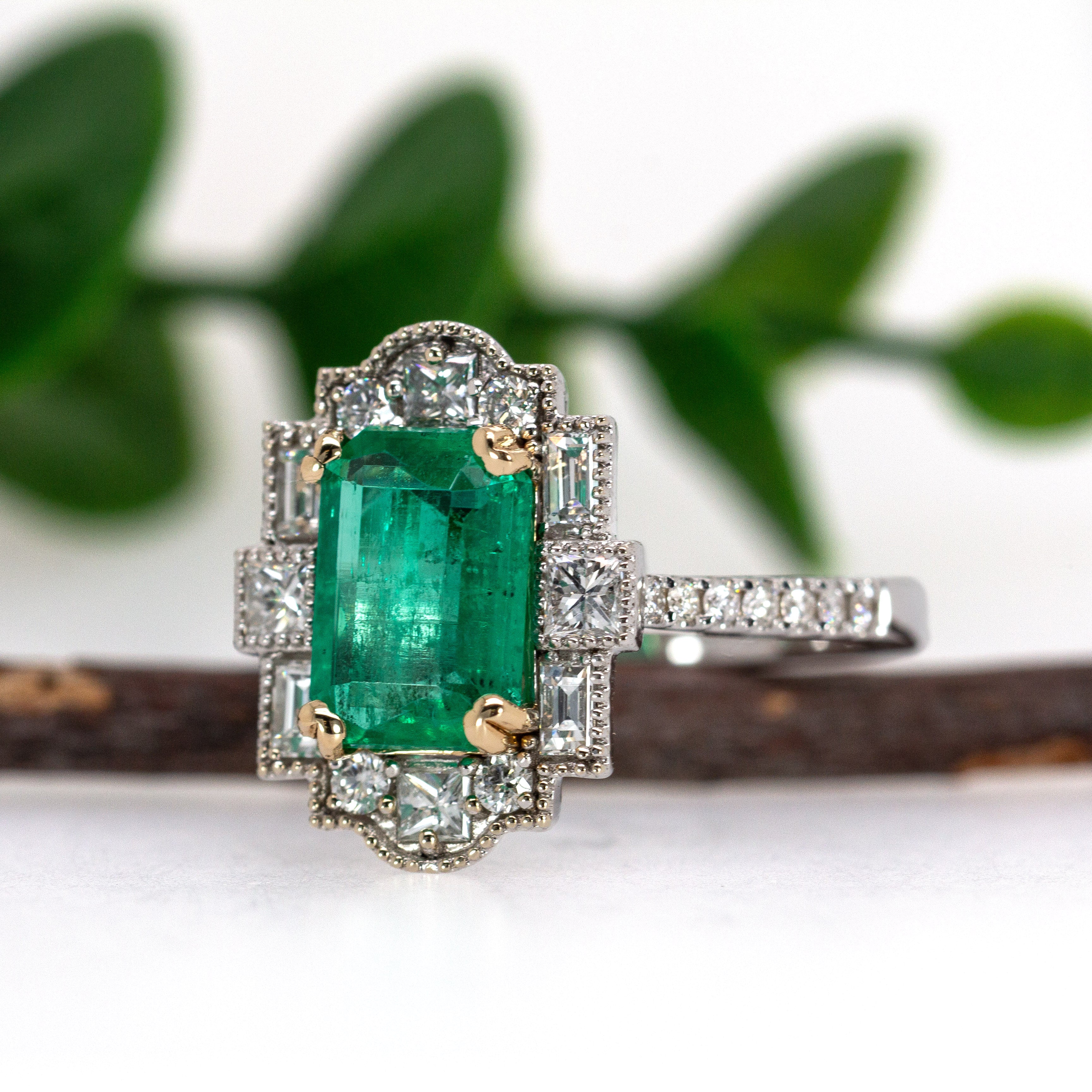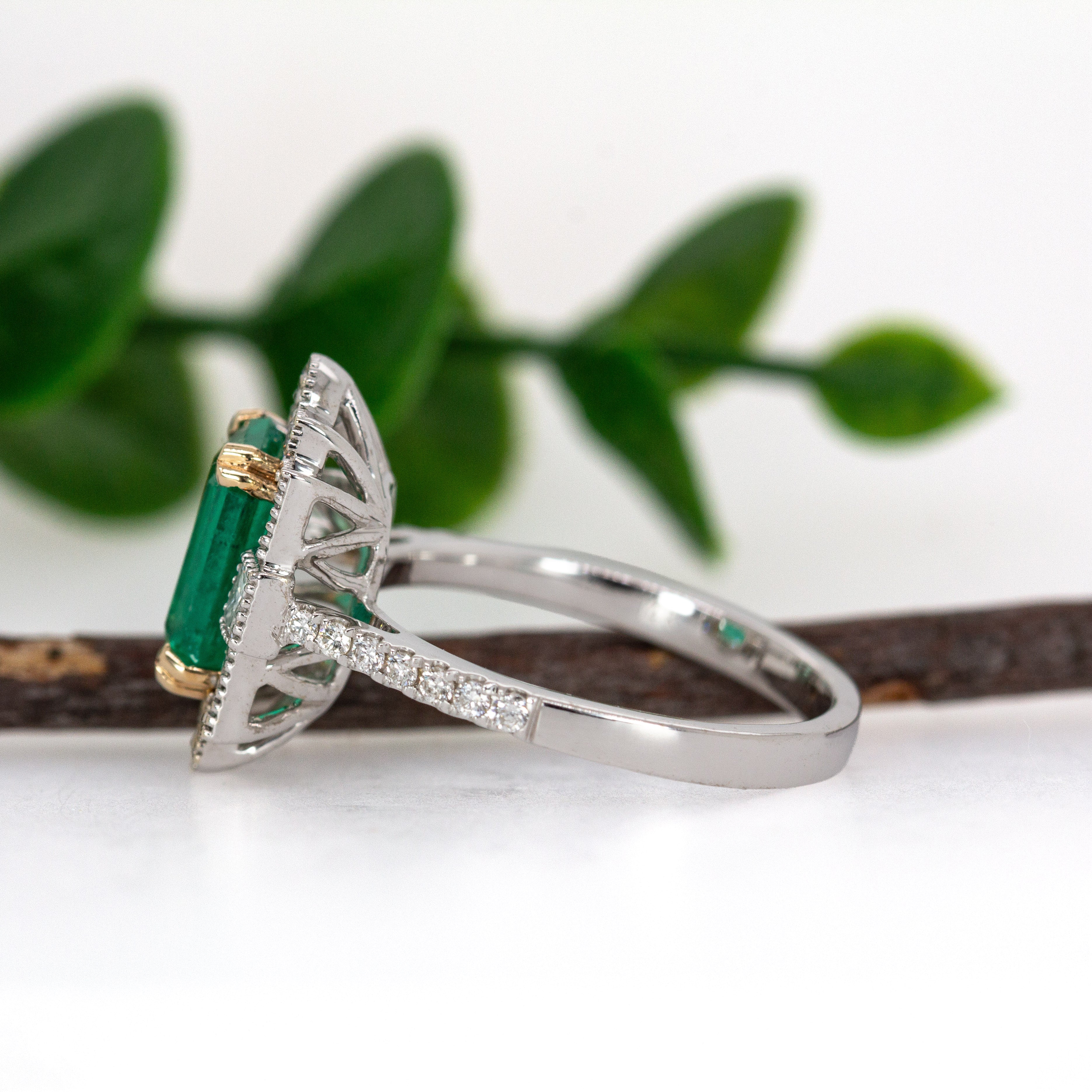 This beautiful ring features a 1.84 carat Colombian Emerald gemstone with milgrain details and natural earth mined diamonds, all set in solid 14K gold. This ring makes a lovely May birthstone gift for your loved ones!