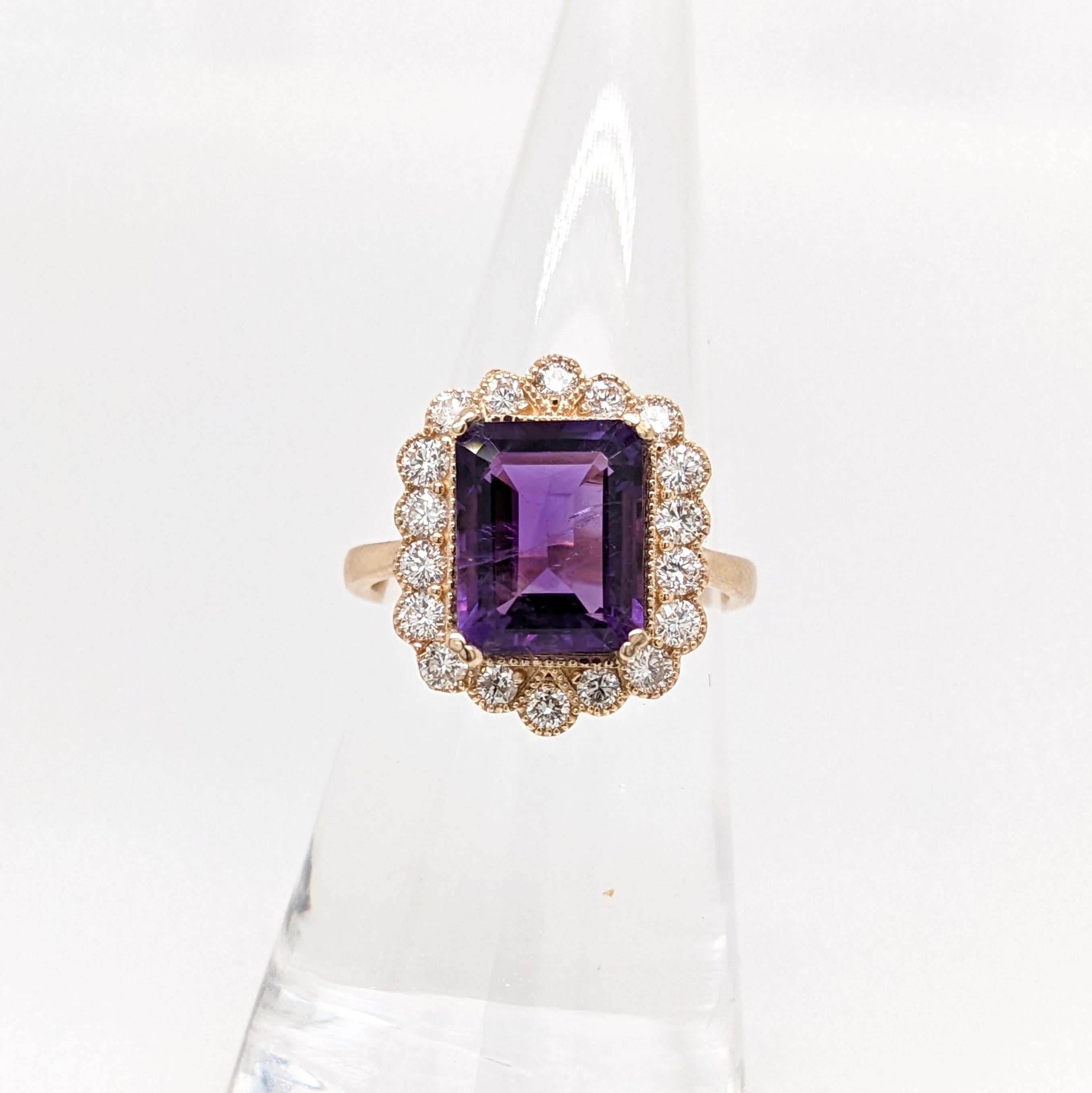 This gorgeous ring features a 3.19 carat emerald cut amethyst and a halo of natural earth mined diamonds with milgrain detail all set in solid 14K gold. This statement ring can be a beautiful february birthstone gift for your loved ones!