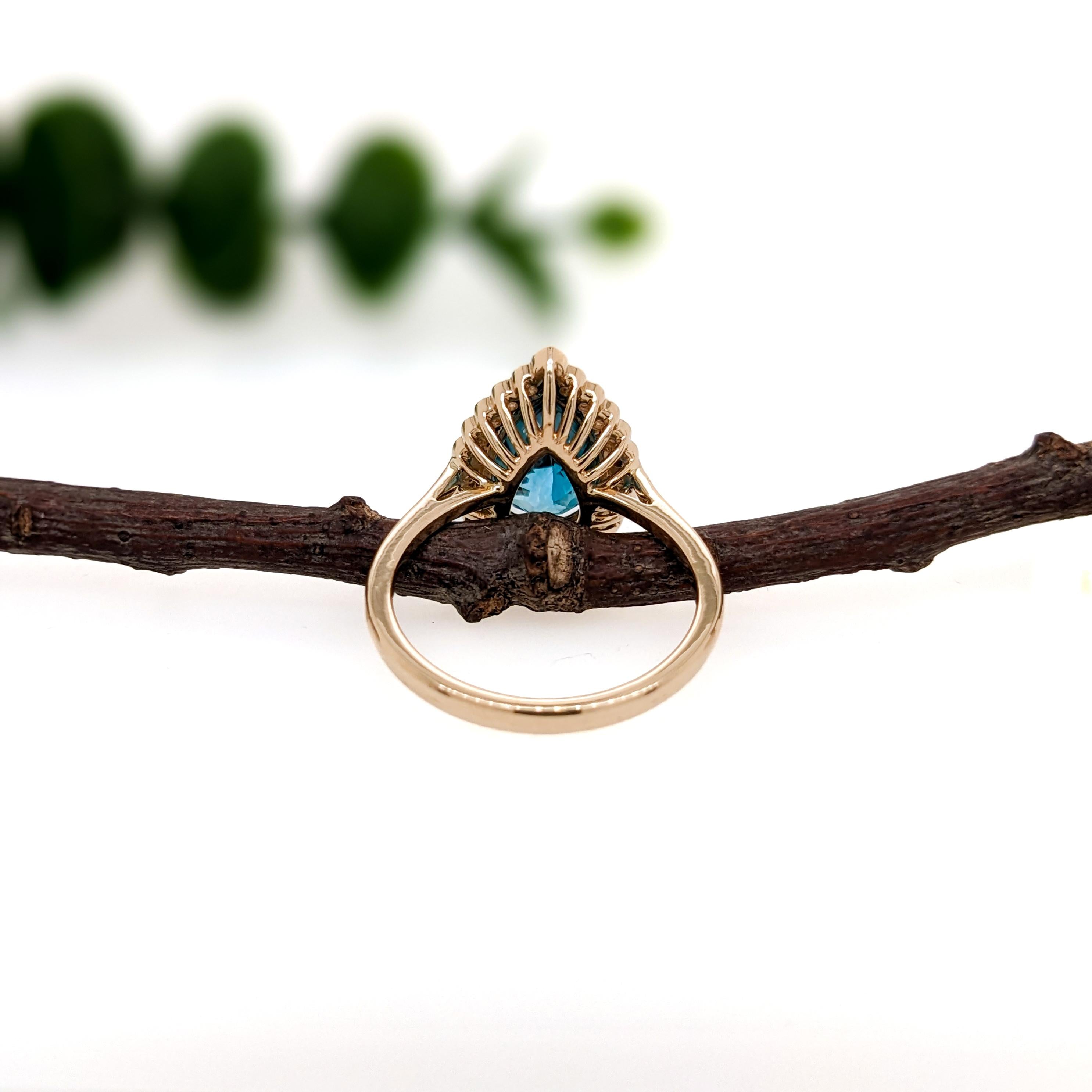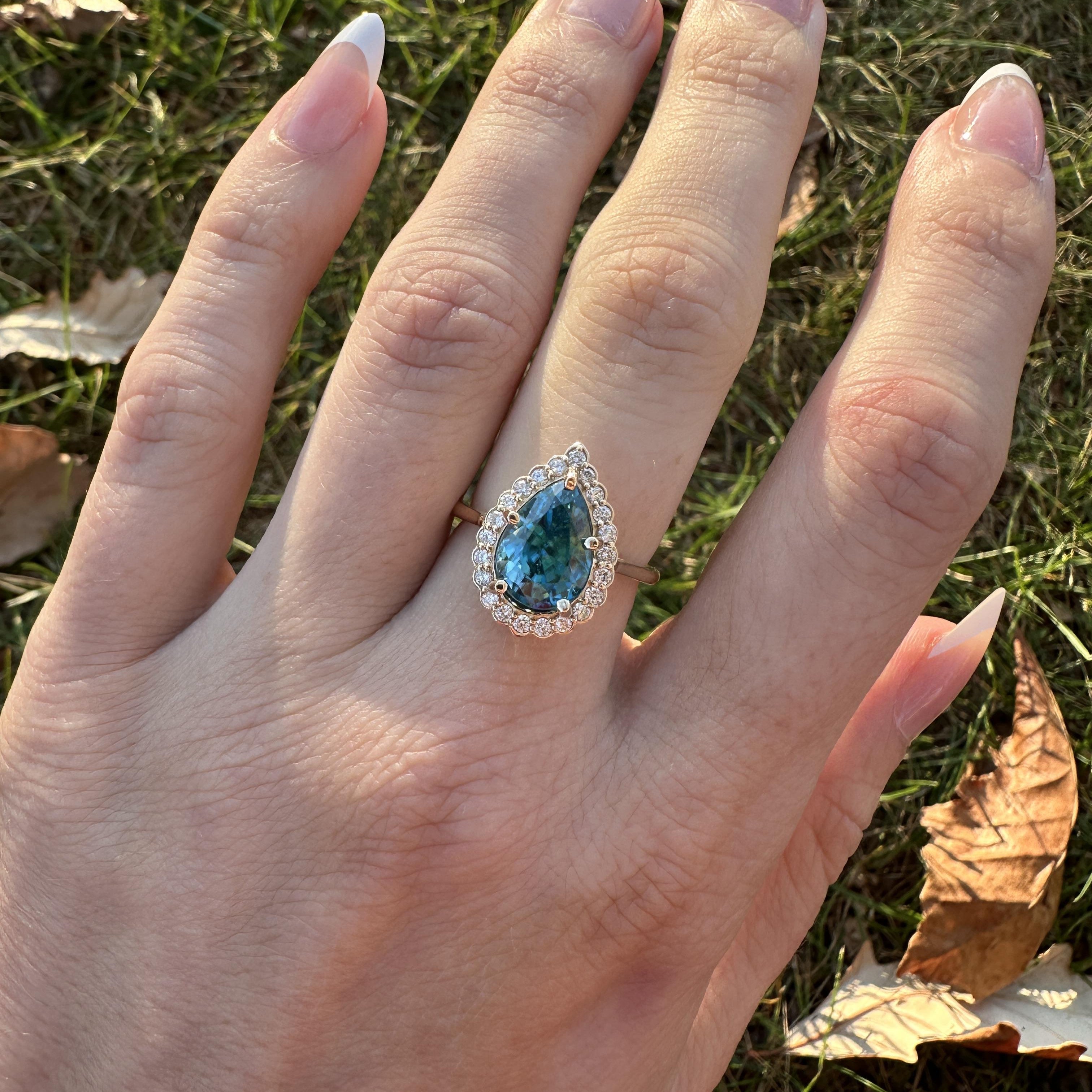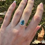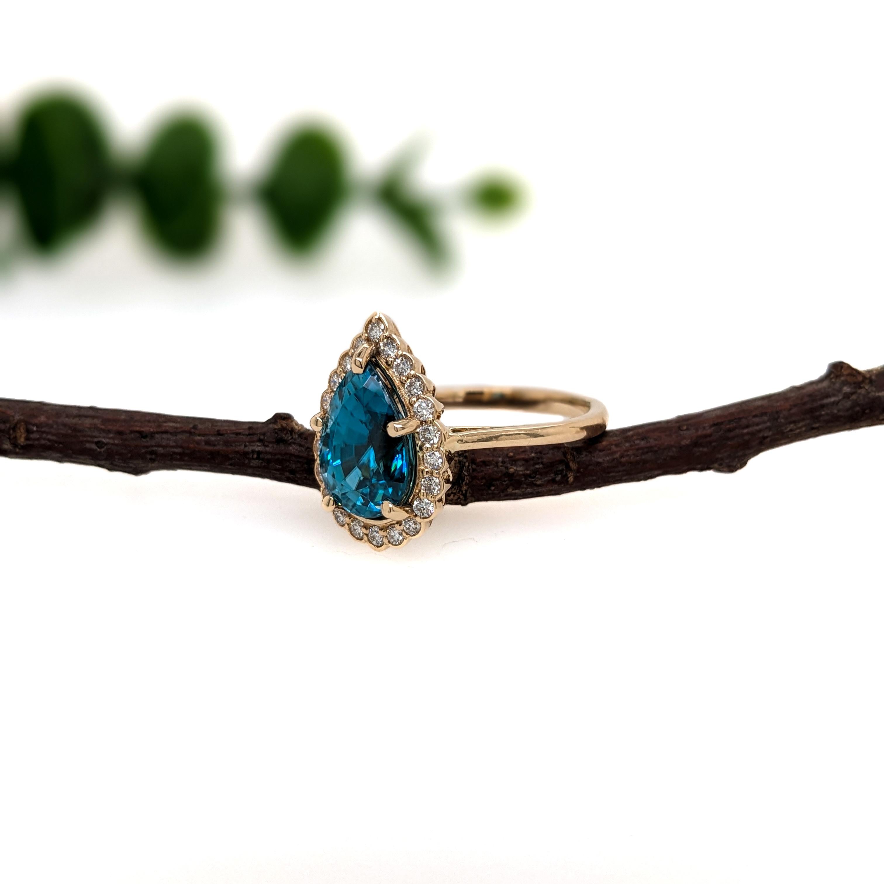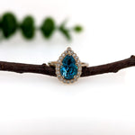 This beautiful ring features a 4.76 carat pear shaped Blue Zircon gemstone with natural earth mined diamond halo set in solid 14K white gold. This Blue Zircon ring makes a lovely December birthstone gift for your loved ones!
