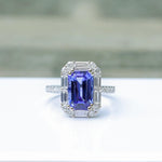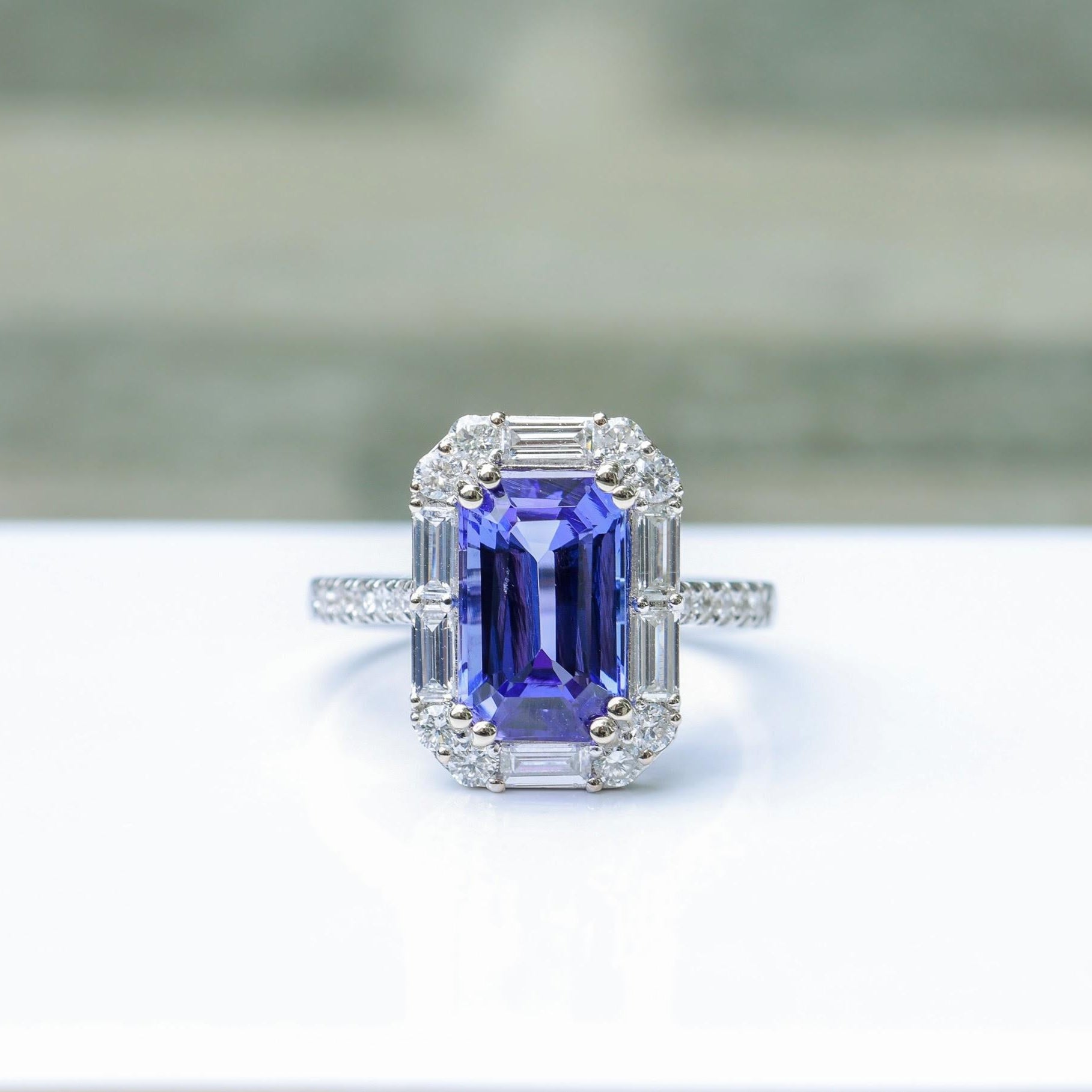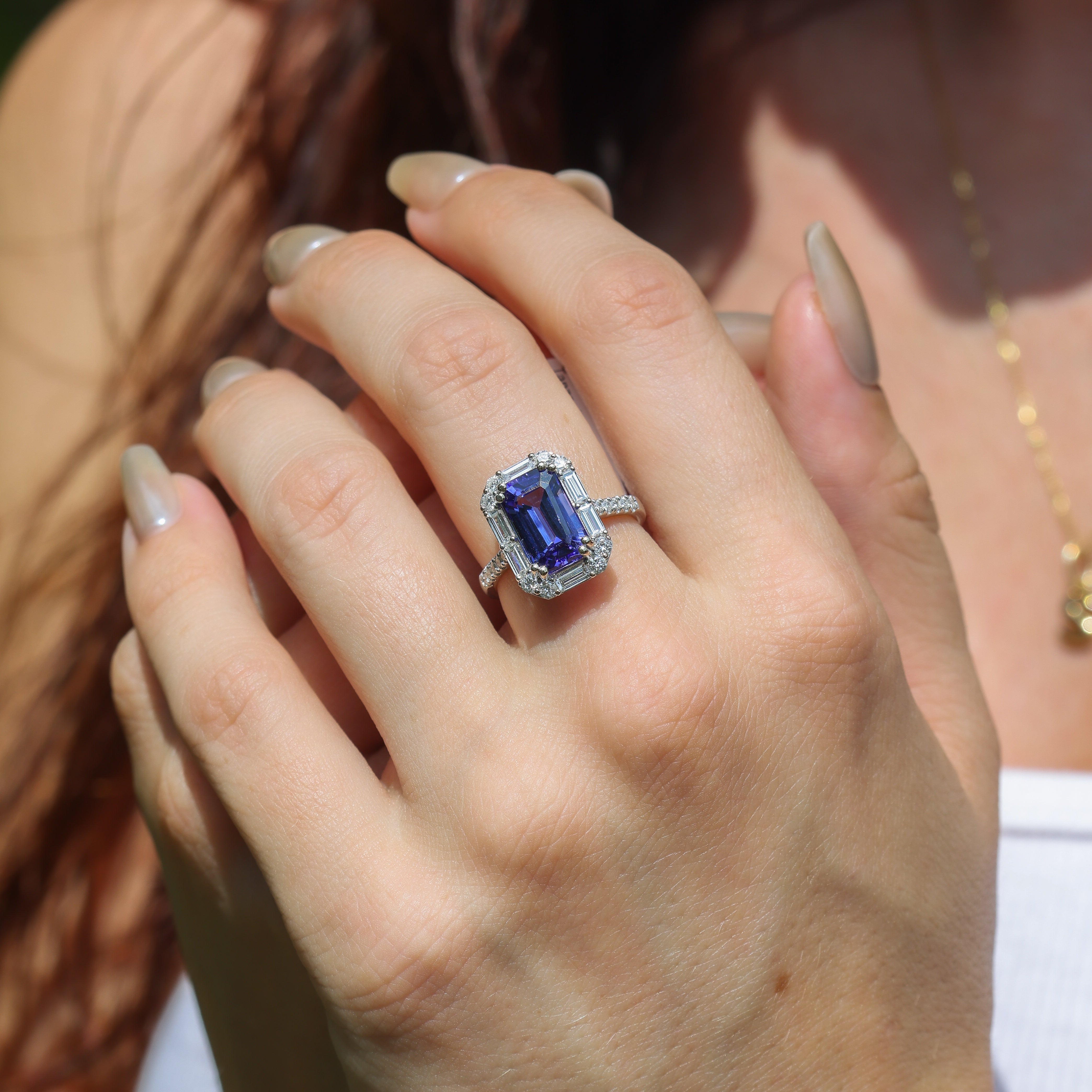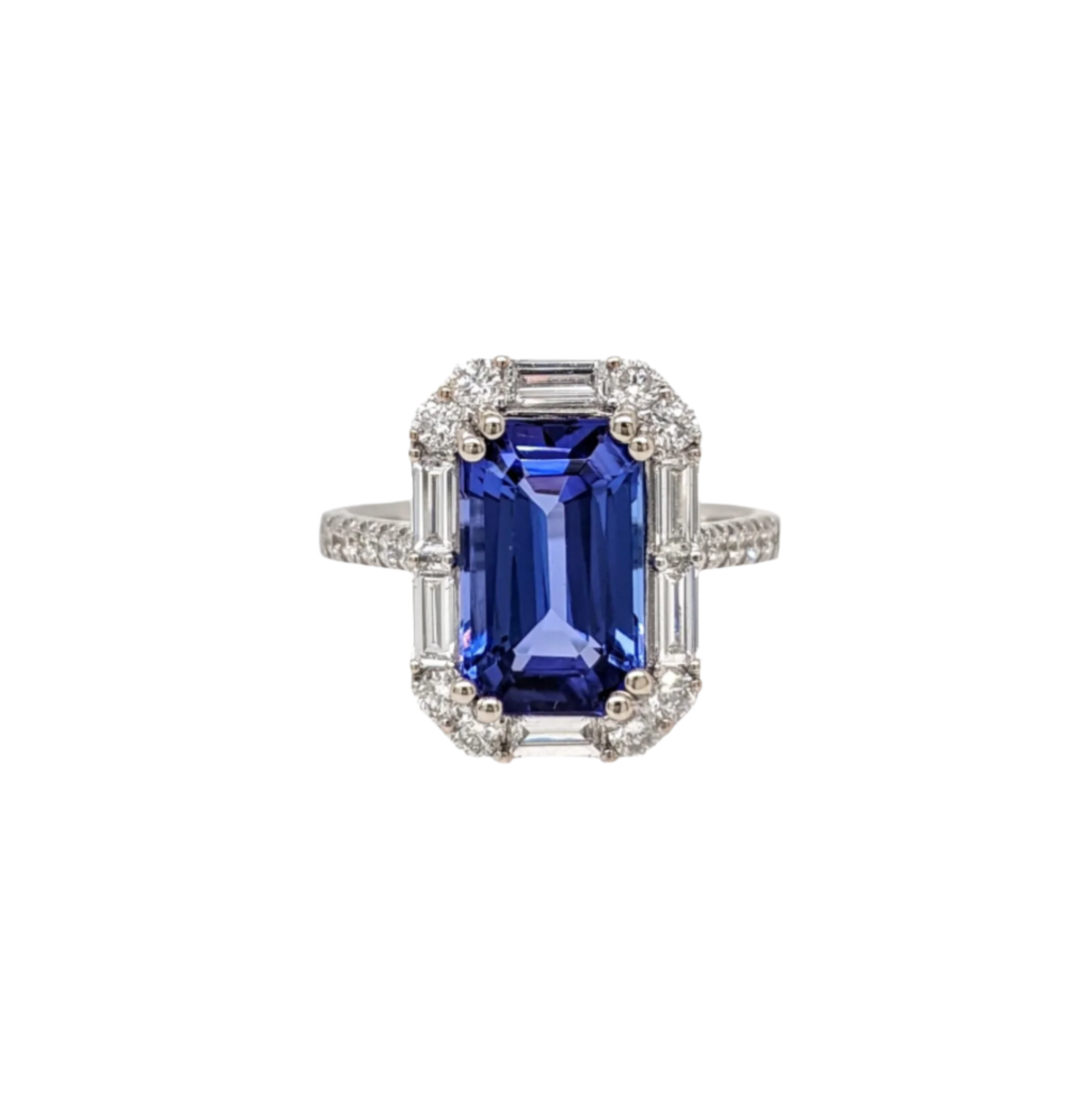 This beautiful ring features a 3.99 carat emerald cut Tanzanite gemstone with natural earth mined diamonds set in solid 14K white gold. This Tanzanite ring makes a lovely December birthstone gift for your loved ones!