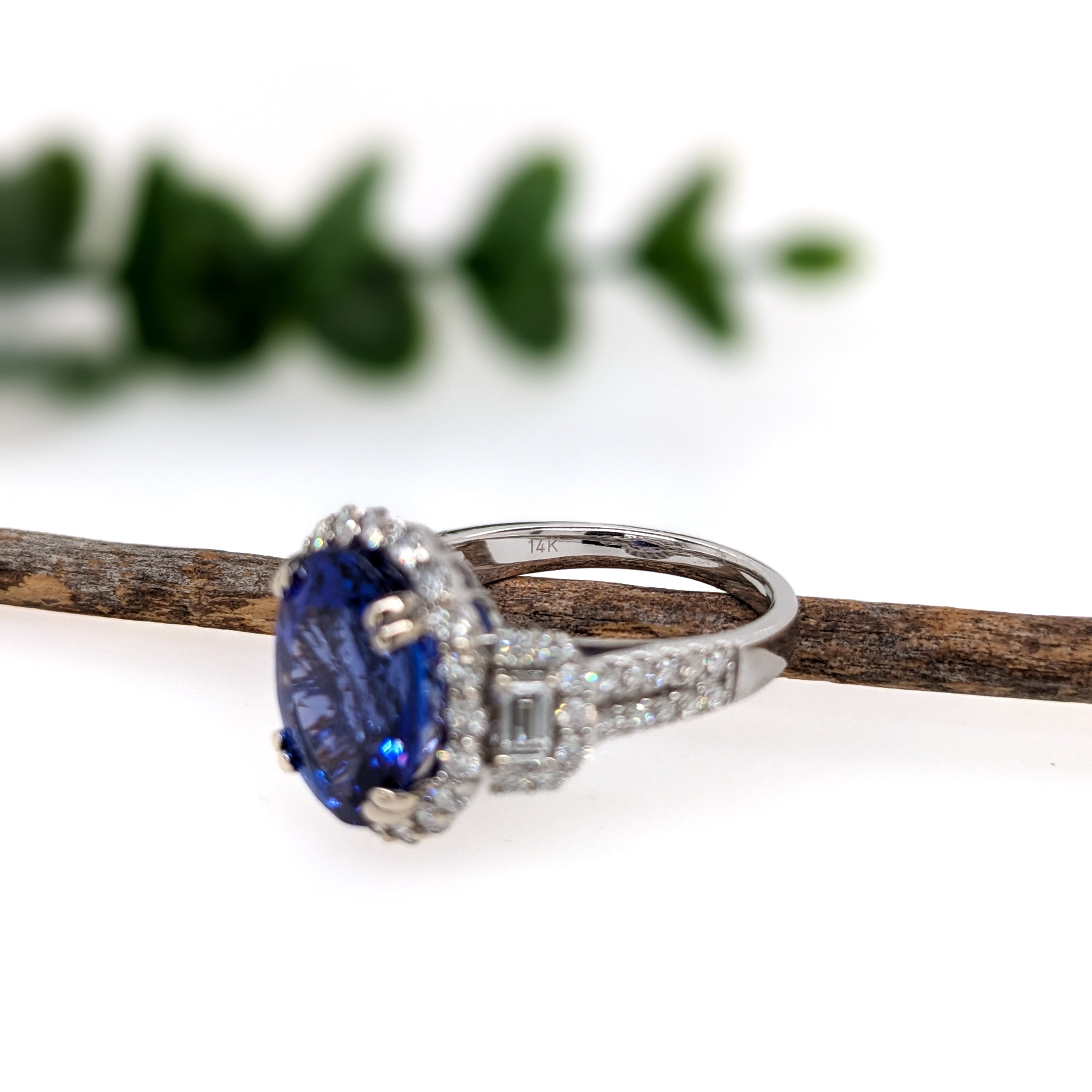 This gorgeous ring features a oval Tanzanite gemstone with a halo of natural earth mined diamonds and pave diamond shank set in solid 14K white gold. This Tanzanite ring makes a lovely December birthstone gift for your loved ones!