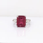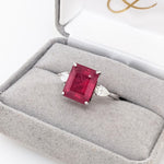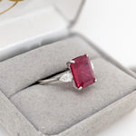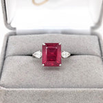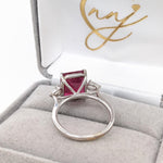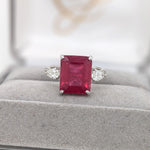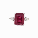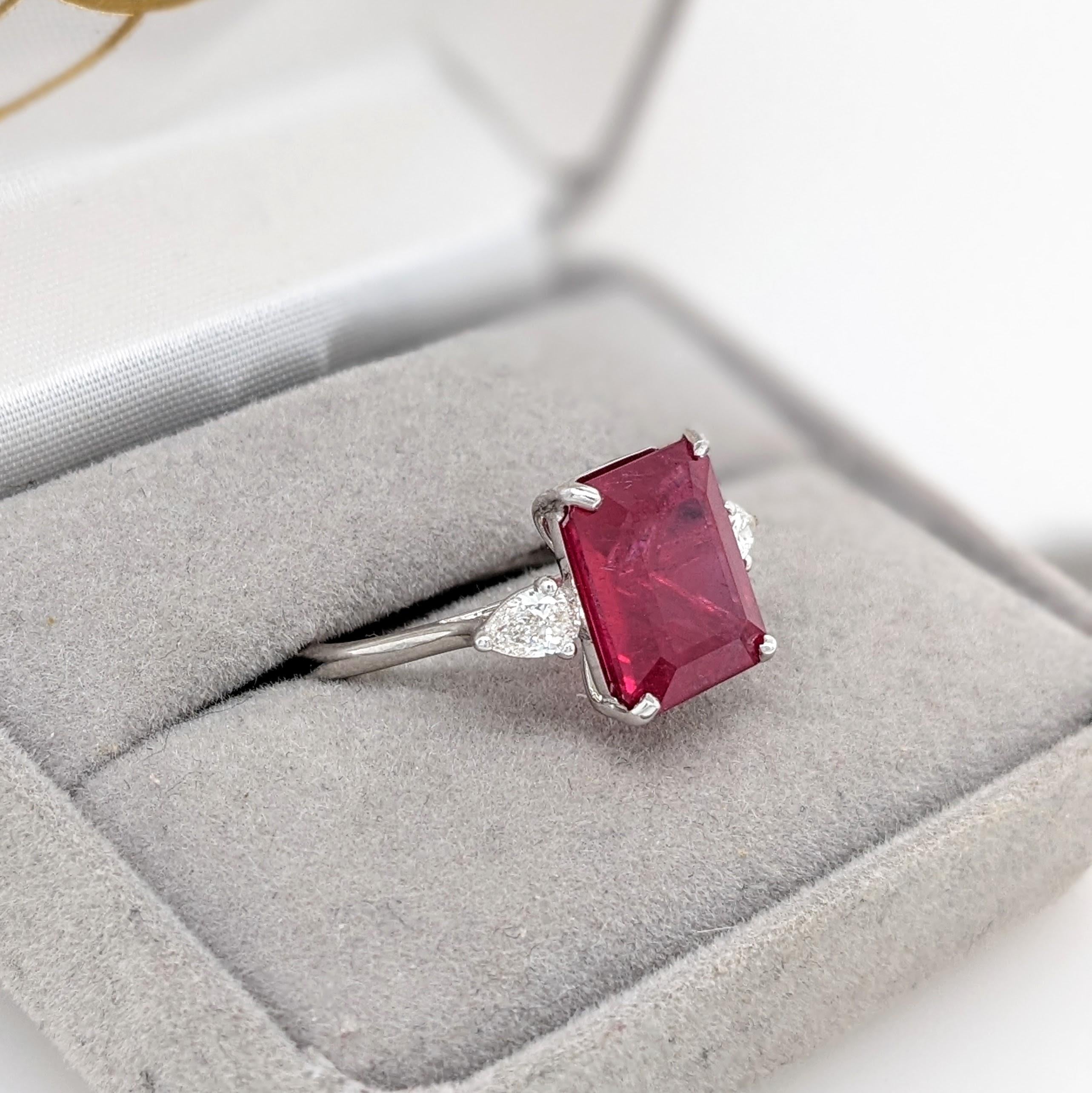 This statement ring features a stunning 5.93 carat red ruby gemstone with two natural earth mined diamonds set in solid 14K gold. This ring makes a lovely July birthstone gift for your loved ones!