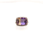 Gorgeous 6.38 carat barrel cut Ametrine with rich yellow and purple colors highlighted by a halo of sparkling natural earth mined diamonds. This ring make a great statement piece!