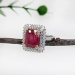 This beautiful statement ring features a 6.68-carat emerald-shaped Ruby gemstone with a halo of natural earth-mined diamonds set in solid 14K white gold. This Ruby ring makes a lovely July birthstone gift for your loved ones!