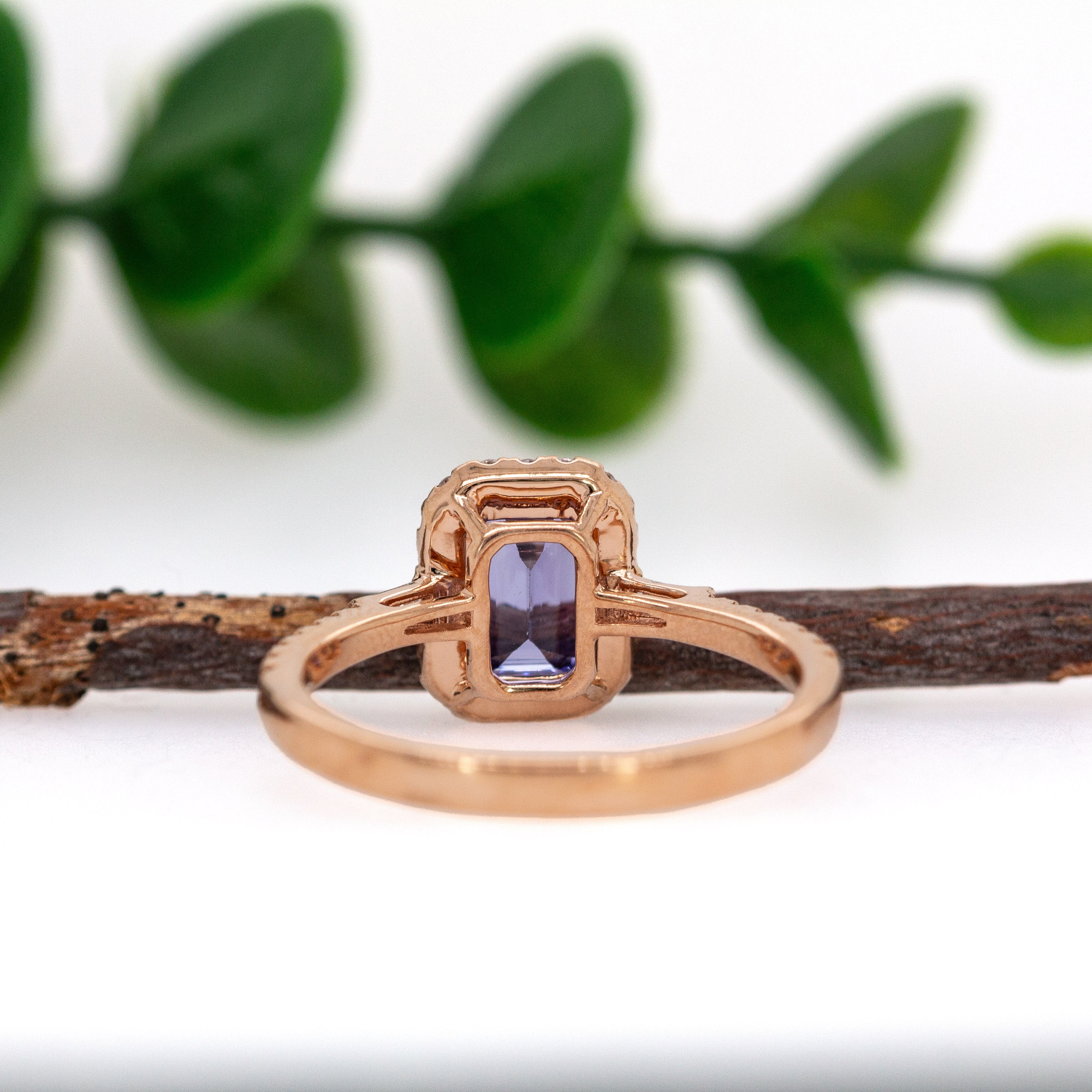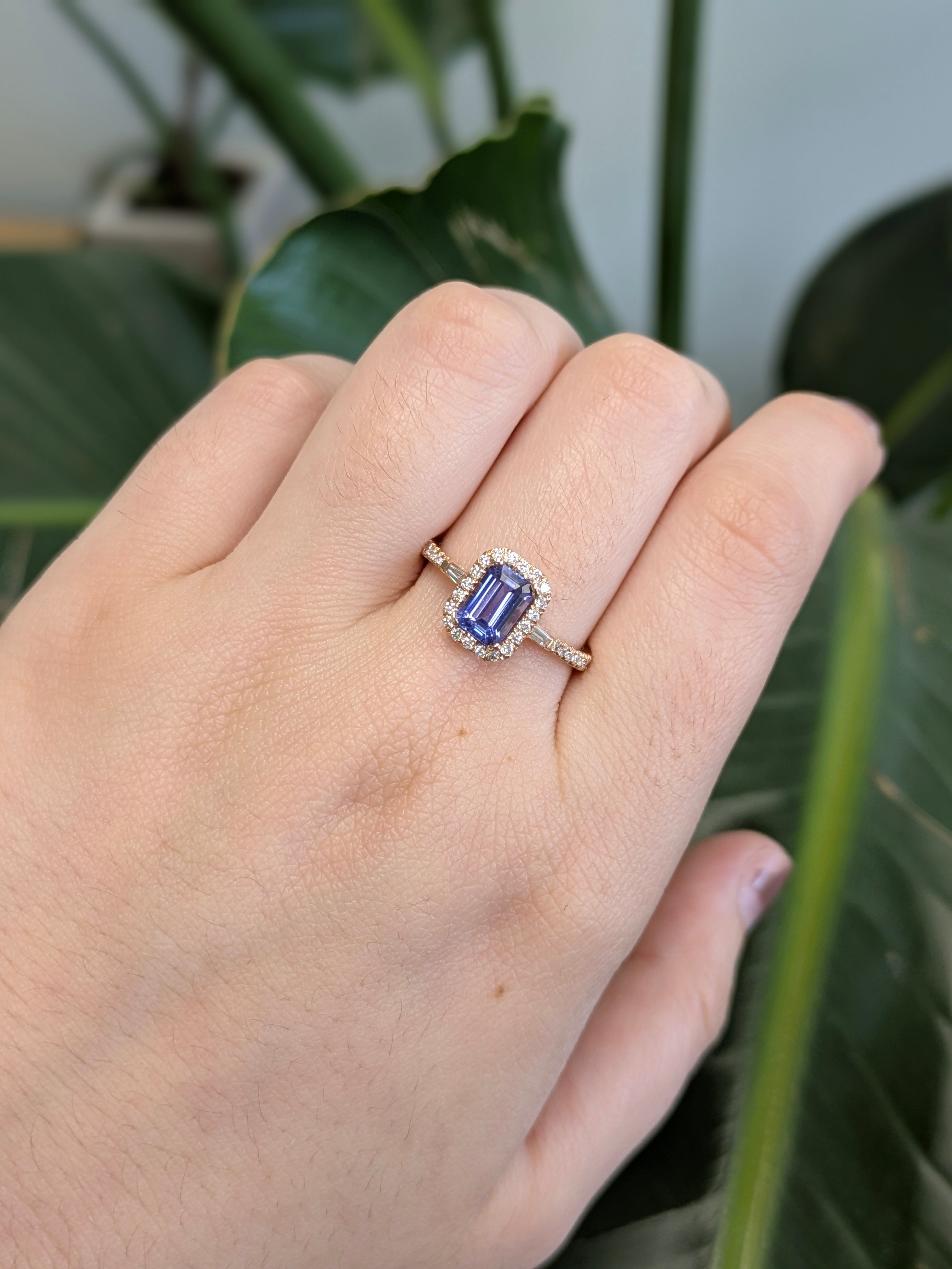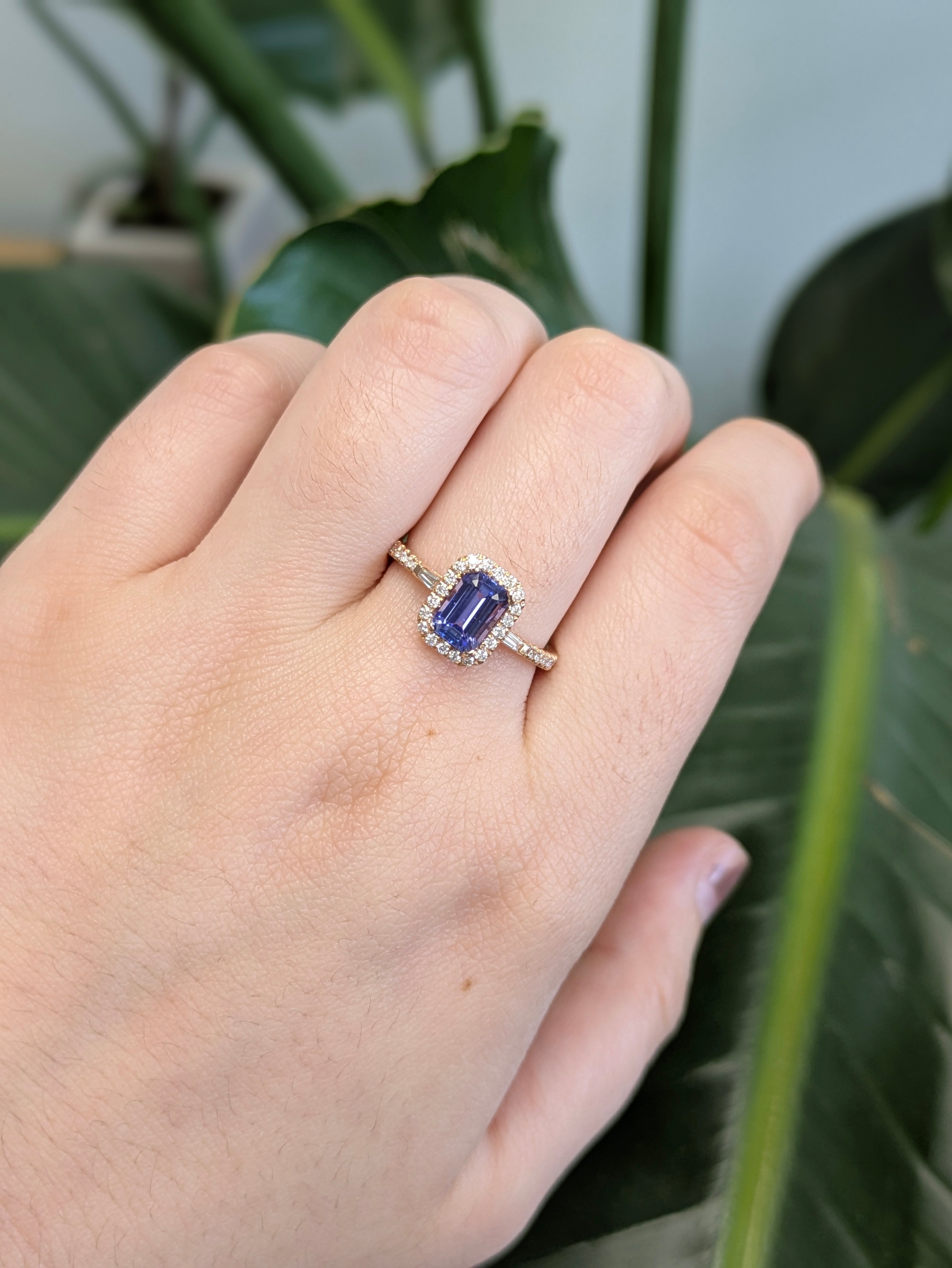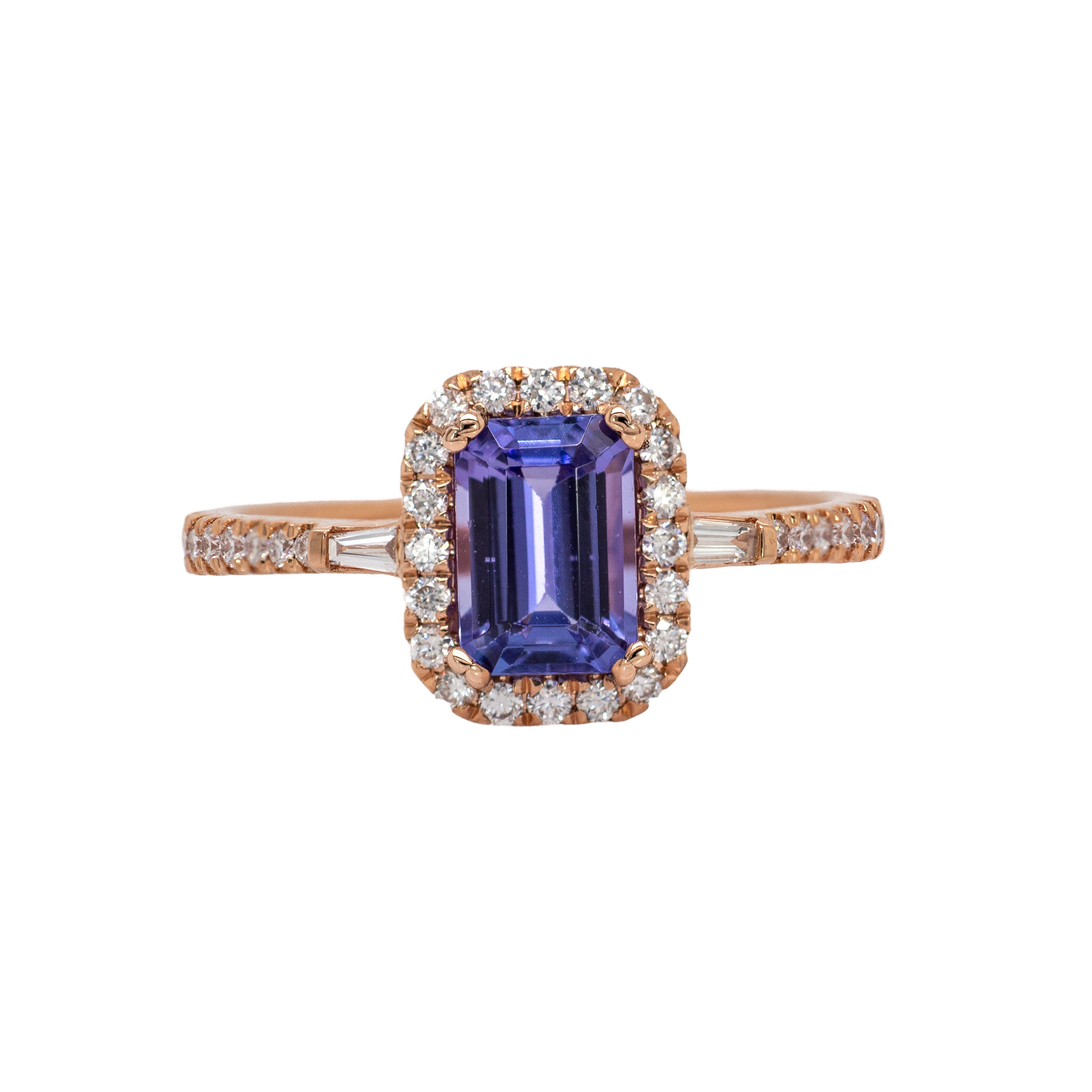 Stand out with a rare gem of the earth. This exquisite ring features a 1-carat emerald-cut Tanzanite—known for its rarity and spiritual meaning—framed by a halo of sparkling, earth-mined diamonds. The 14K rose gold setting brings a modern warmth to the piece, complementing Tanzanite’s rich, mysterious hues. More than just jewelry, it’s a celebration of individuality, elegance, and the beauty of nature.