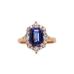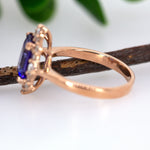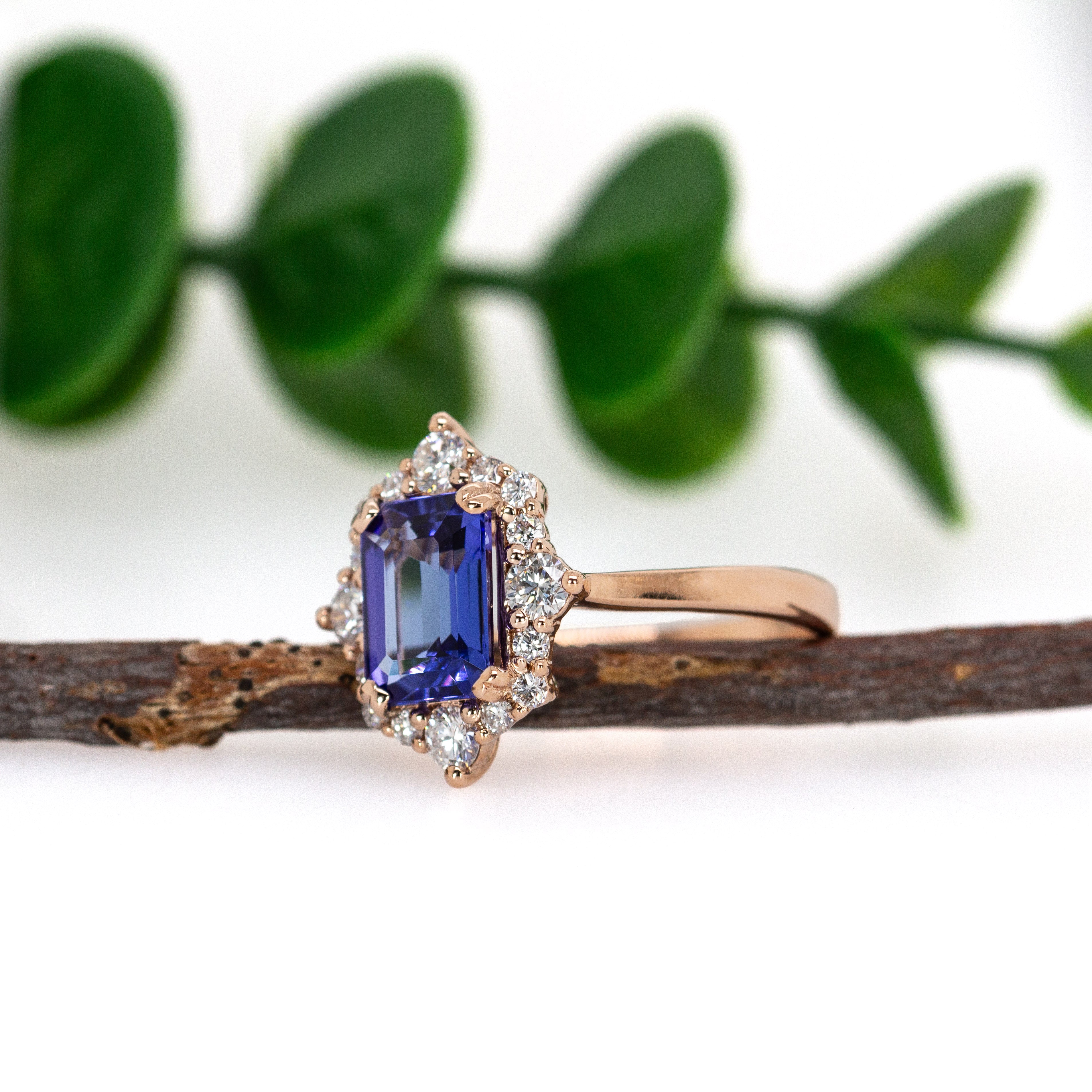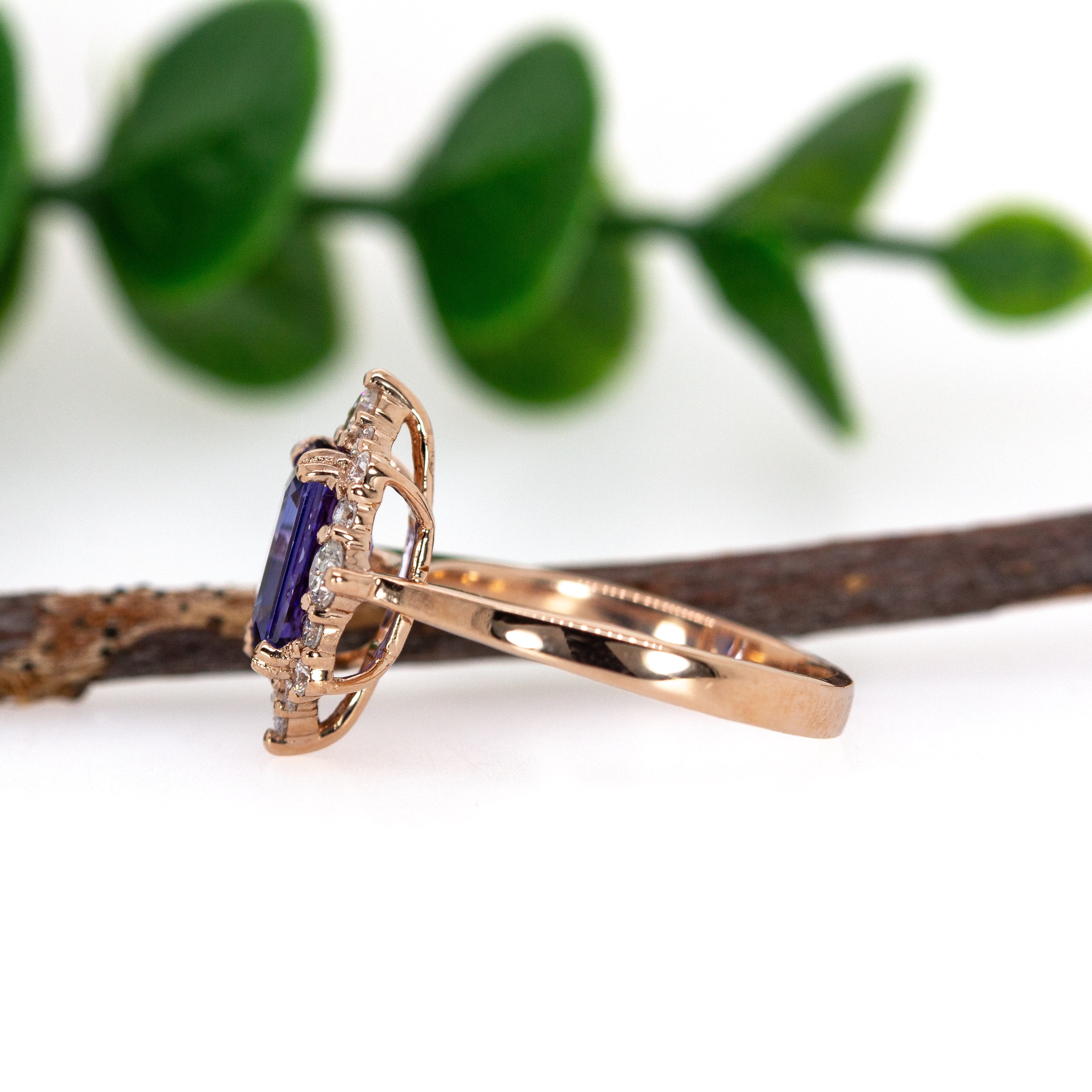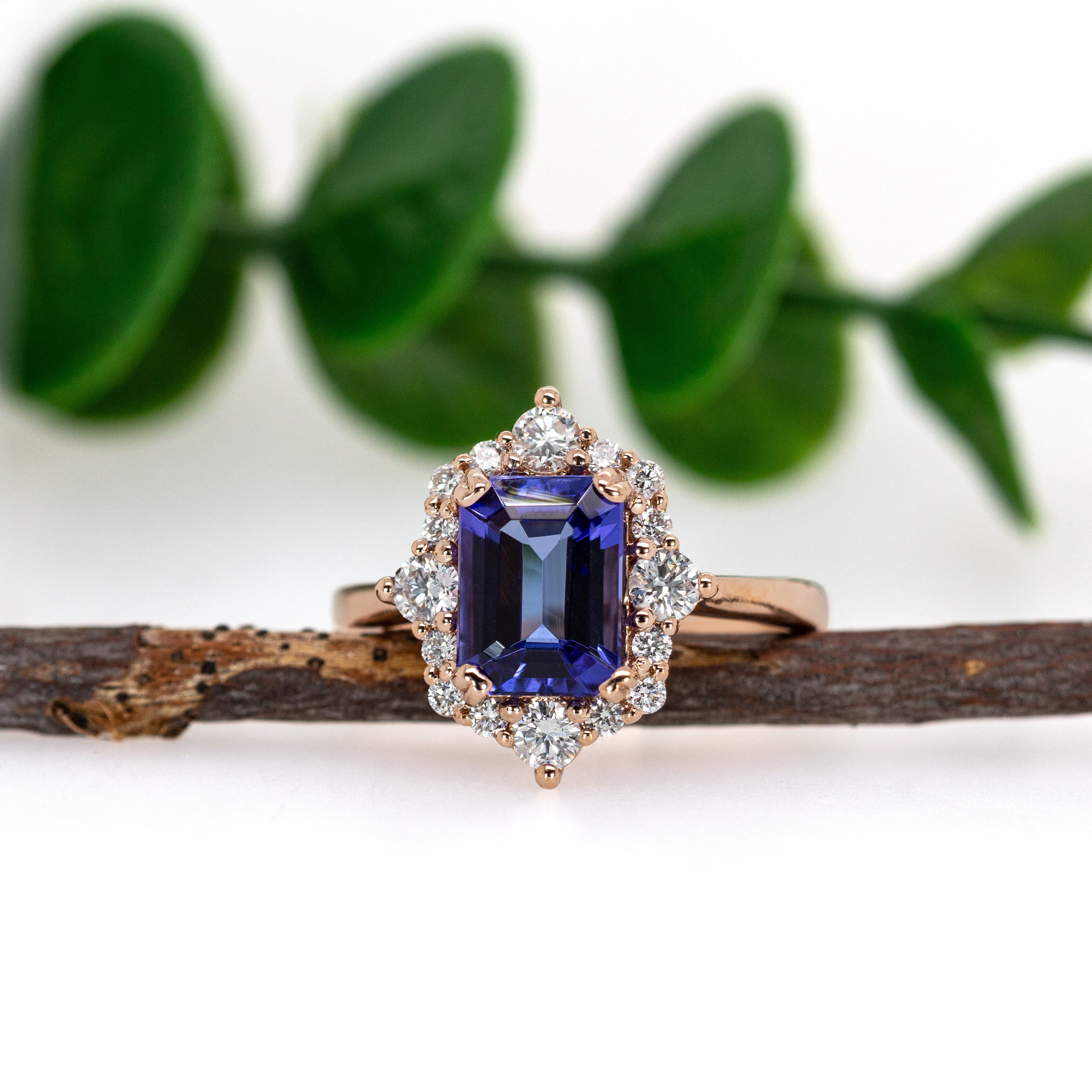 Make a lasting impression with this stunning 1.62 carat natural Tanzanite ring, elegantly framed by a halo of genuine earth-mined diamonds. Set in warm, luxurious 14K rose gold, the vivid violet-blue Tanzanite shimmers with rare brilliance—shifting from deep indigo to soft lavender in the light.