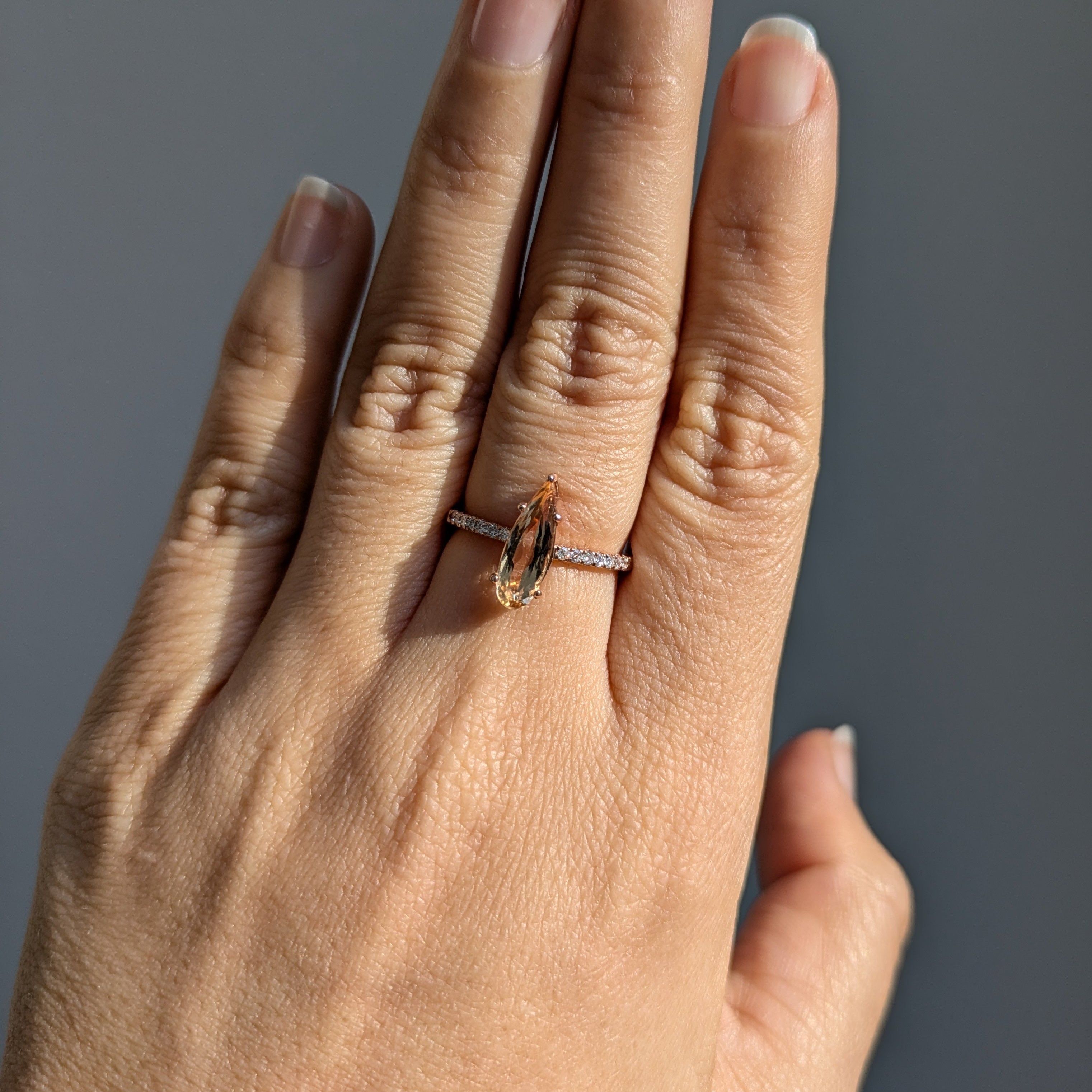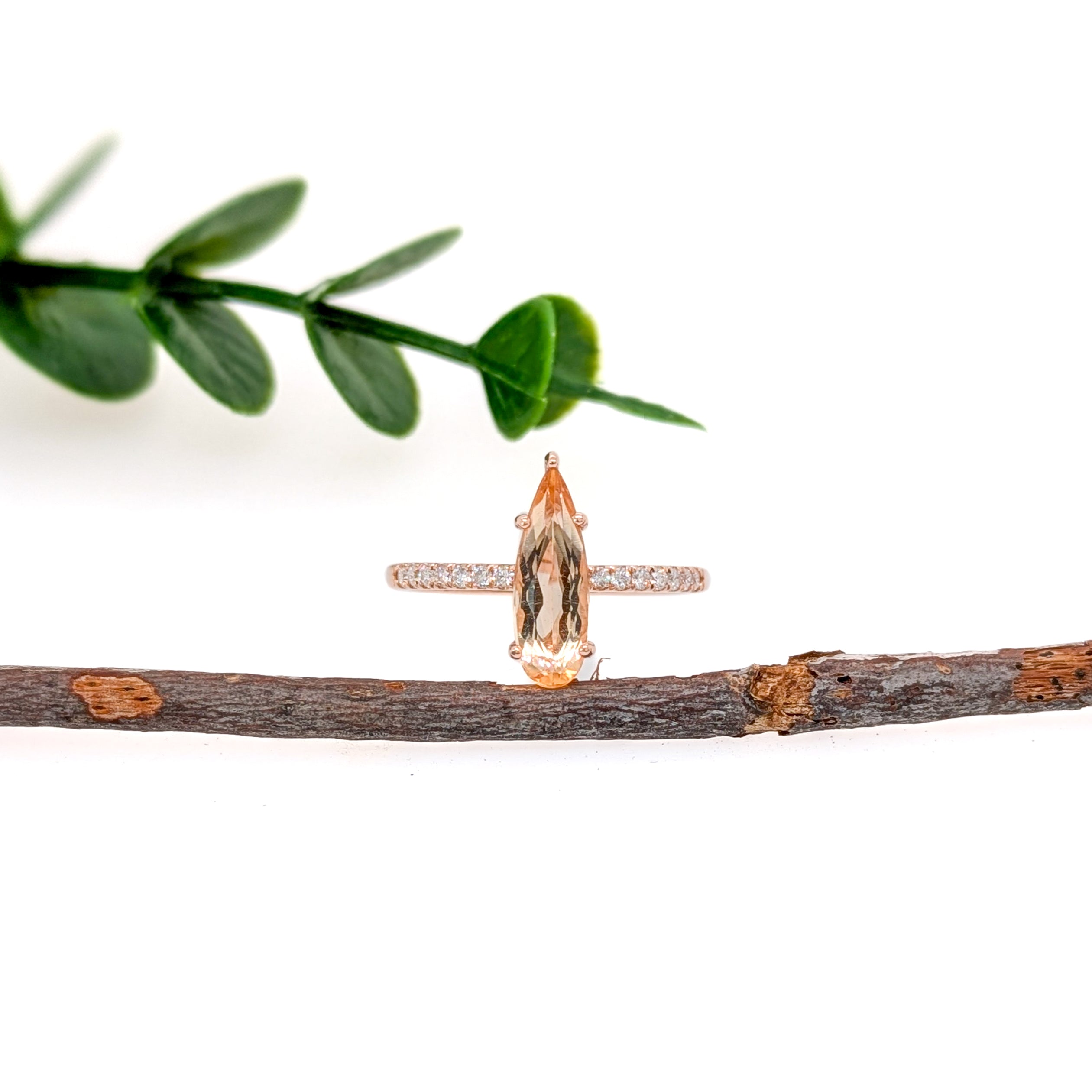 This beautiful statement ring features a 1.53 carat pear cut pink Imperial Topaz gemstone with natural earth mined diamonds set in solid 14K gold. This ring makes a lovely November birthstone gift for your loved ones!