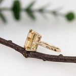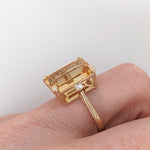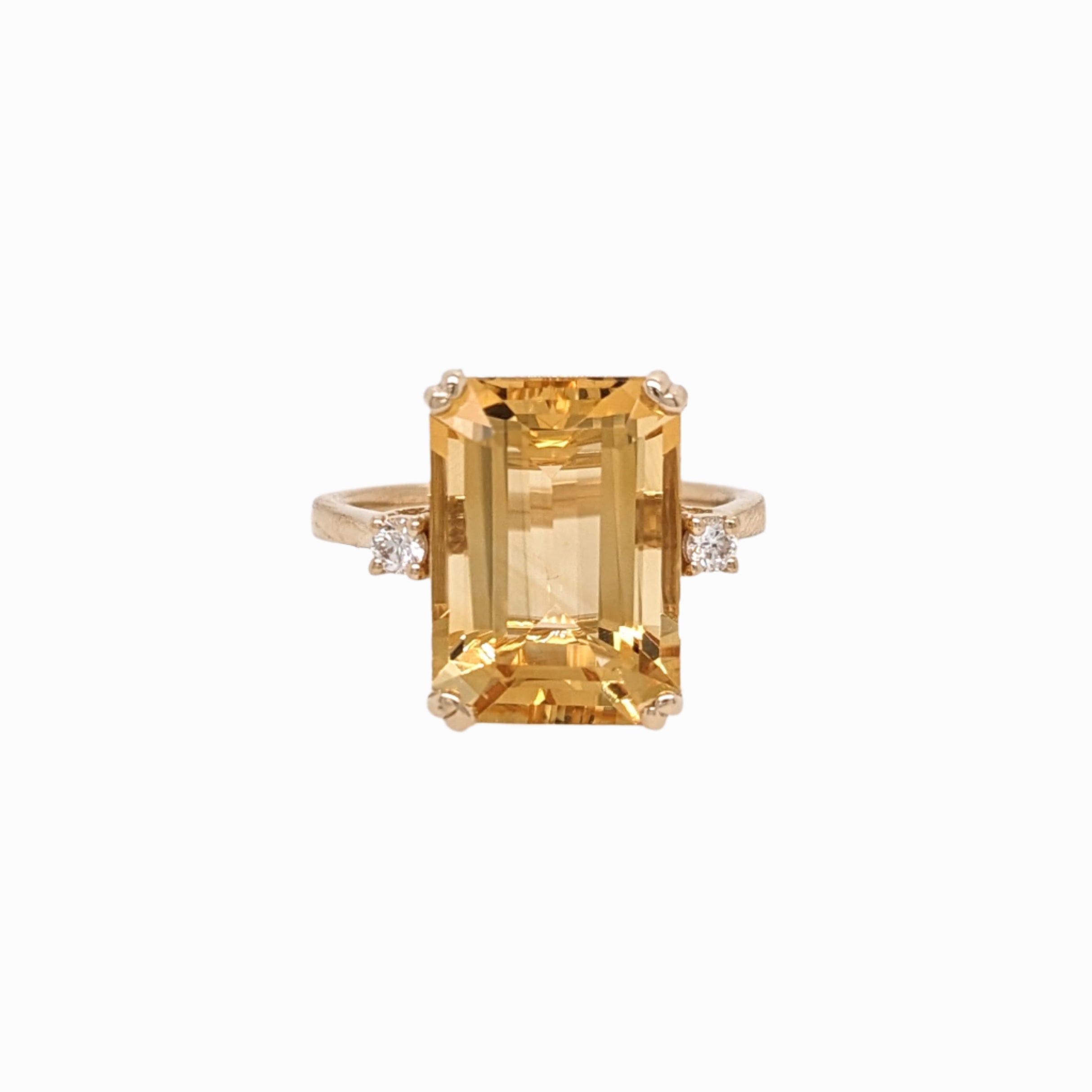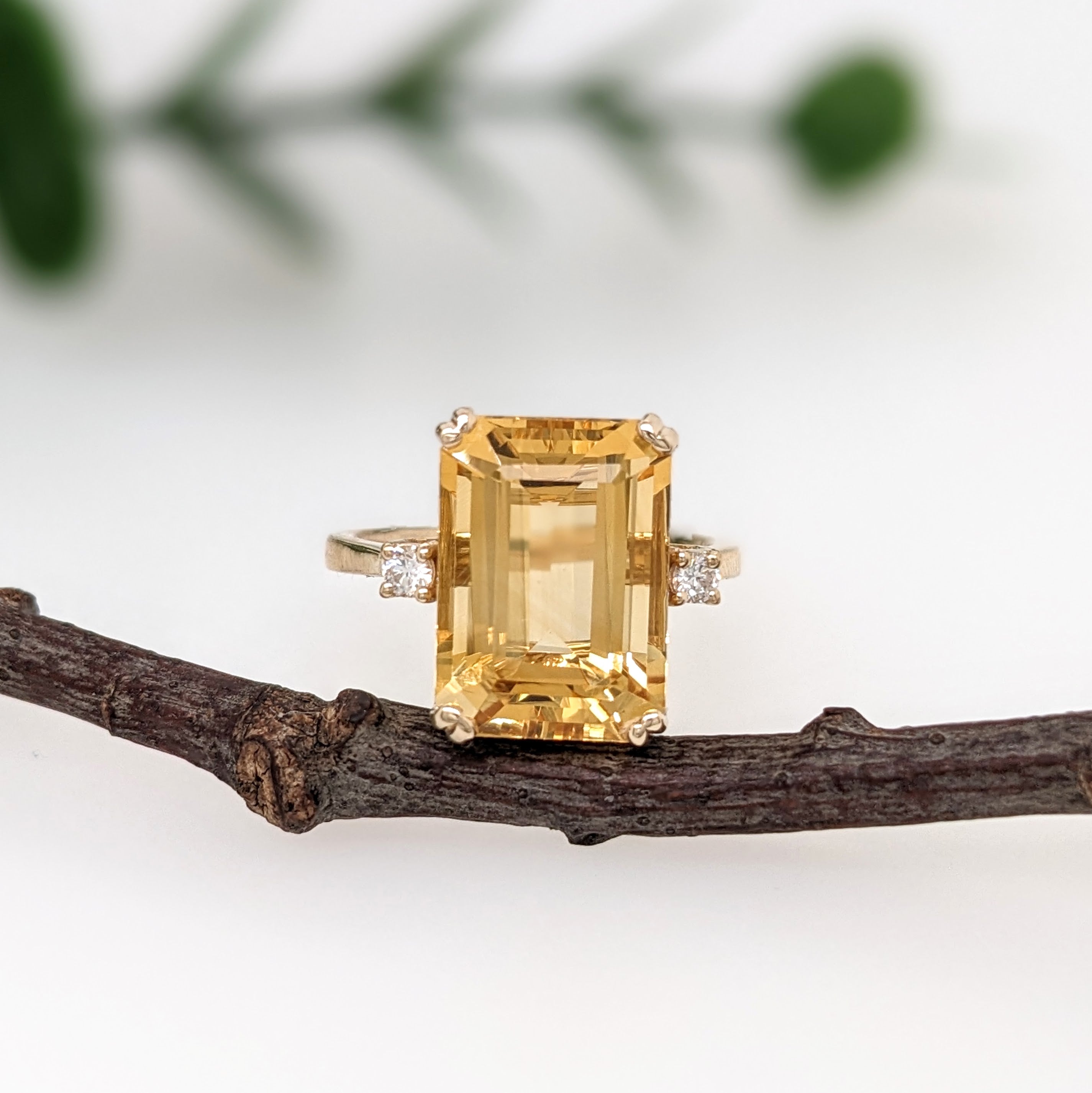 This statement ring features a 7 carat emerald cut citrine with two round natural earth-mined diamond accents in solid 14k gold. This ring also makes a beautiful birthstone ring for your loved ones! Whether worn as a statement piece or for a special occasion, this citrine ring is sure to dazzle!