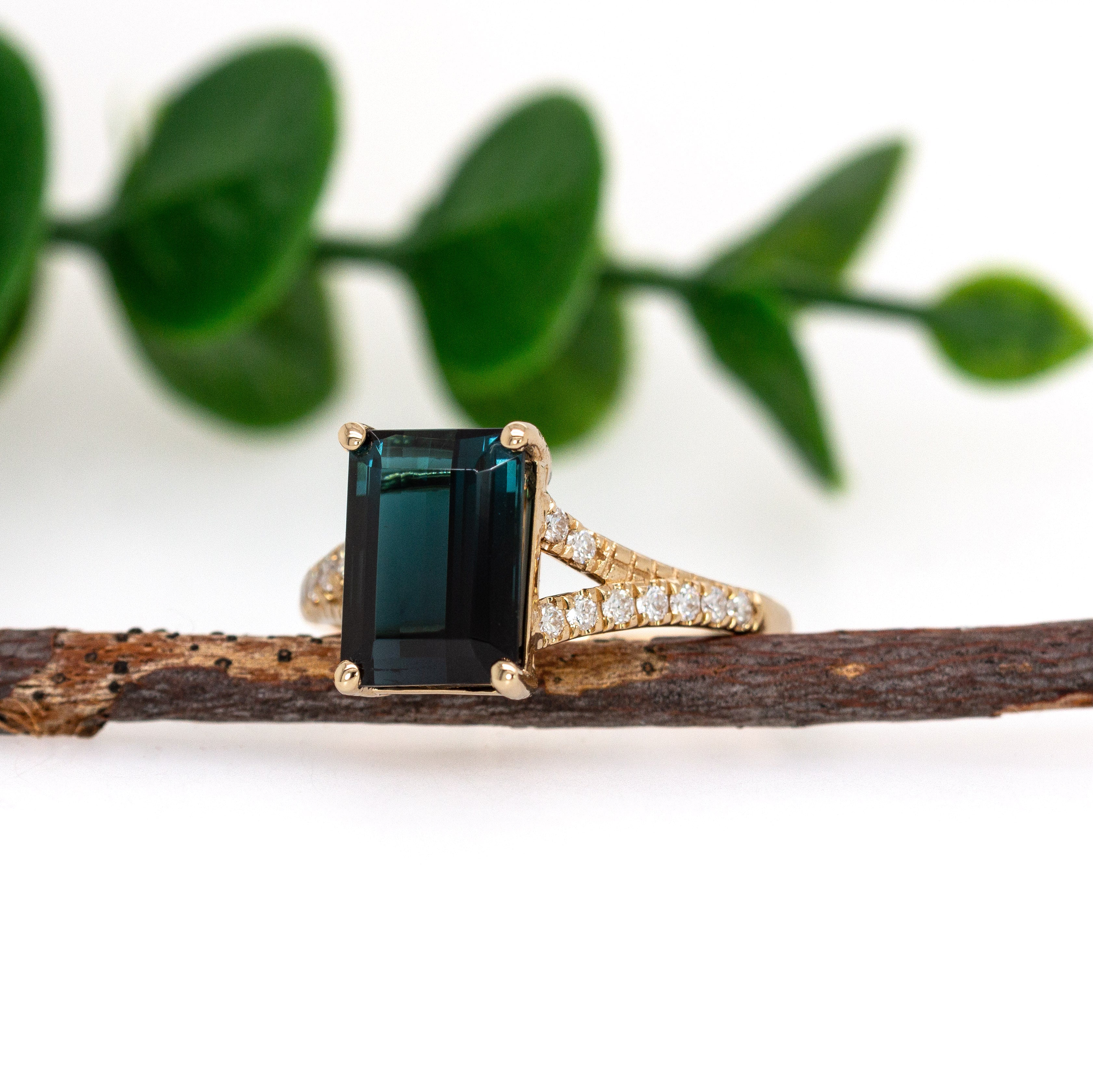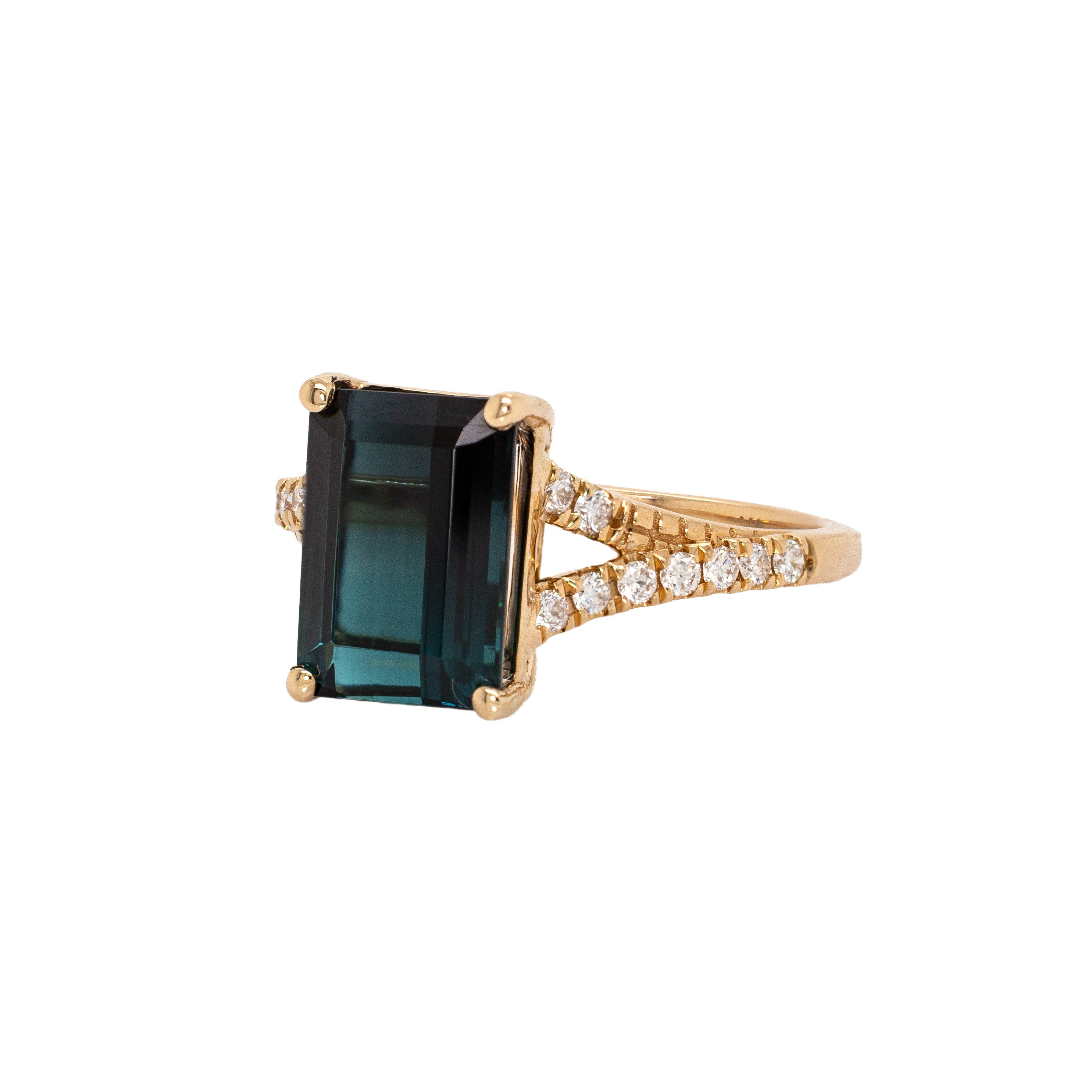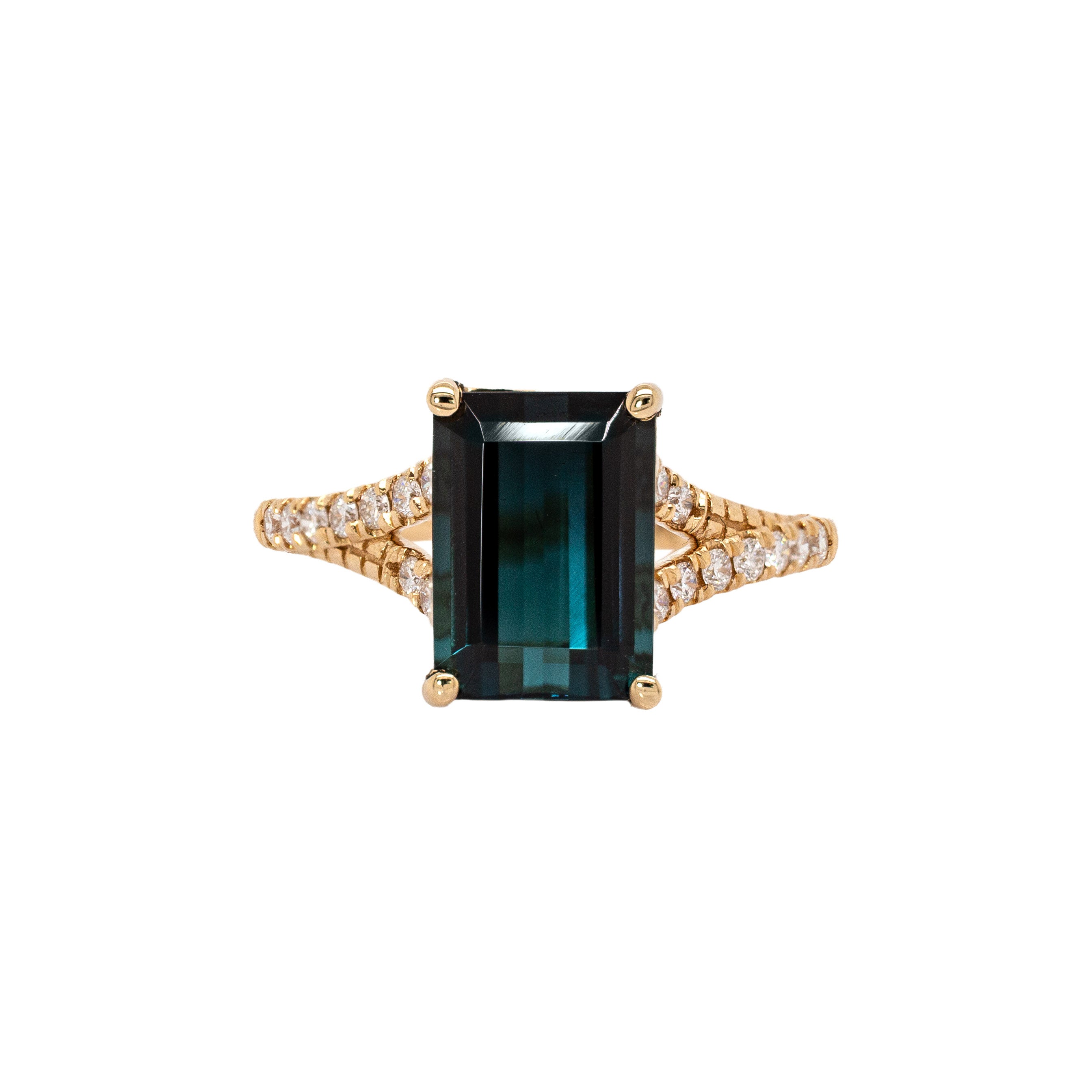 Crafted for the woman who loves to stand out, this 3.06ct Indicolite Tourmaline ring is a true testament to modern luxury and classic design. The emerald-cut center stone, with its mesmerizing ocean-inspired blue-green tones, sits proudly in a polished 14k yellow gold setting. Flanked by glittering earth-mined diamonds and supported by a chic split shank, this ring beautifully balances strength and elegance. Perfectly sized as a cocktail statement ring, it embodies sophistication and fine artistry, making it a piece that will be admired for generations to come.