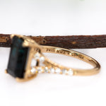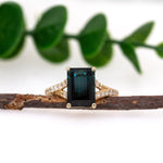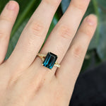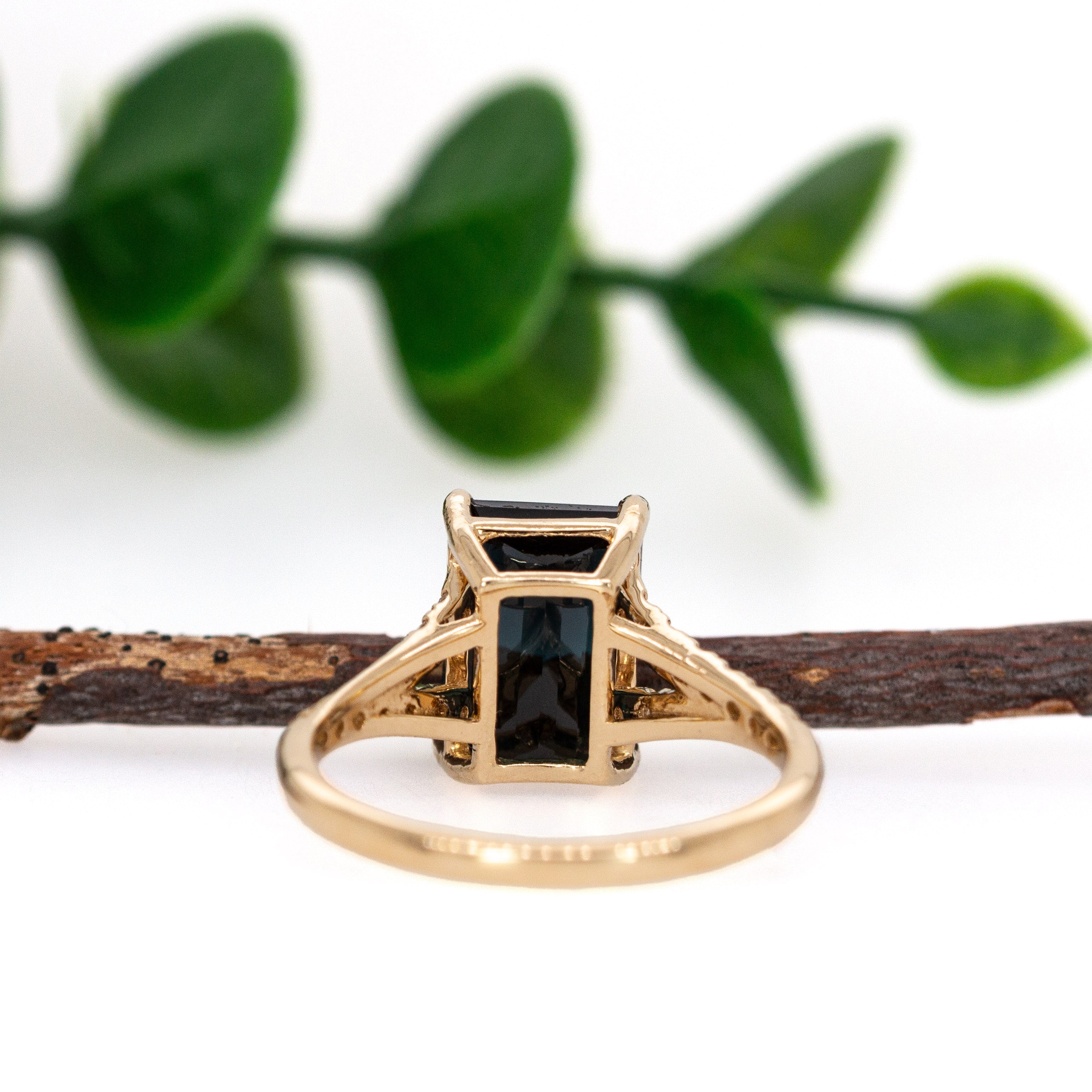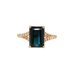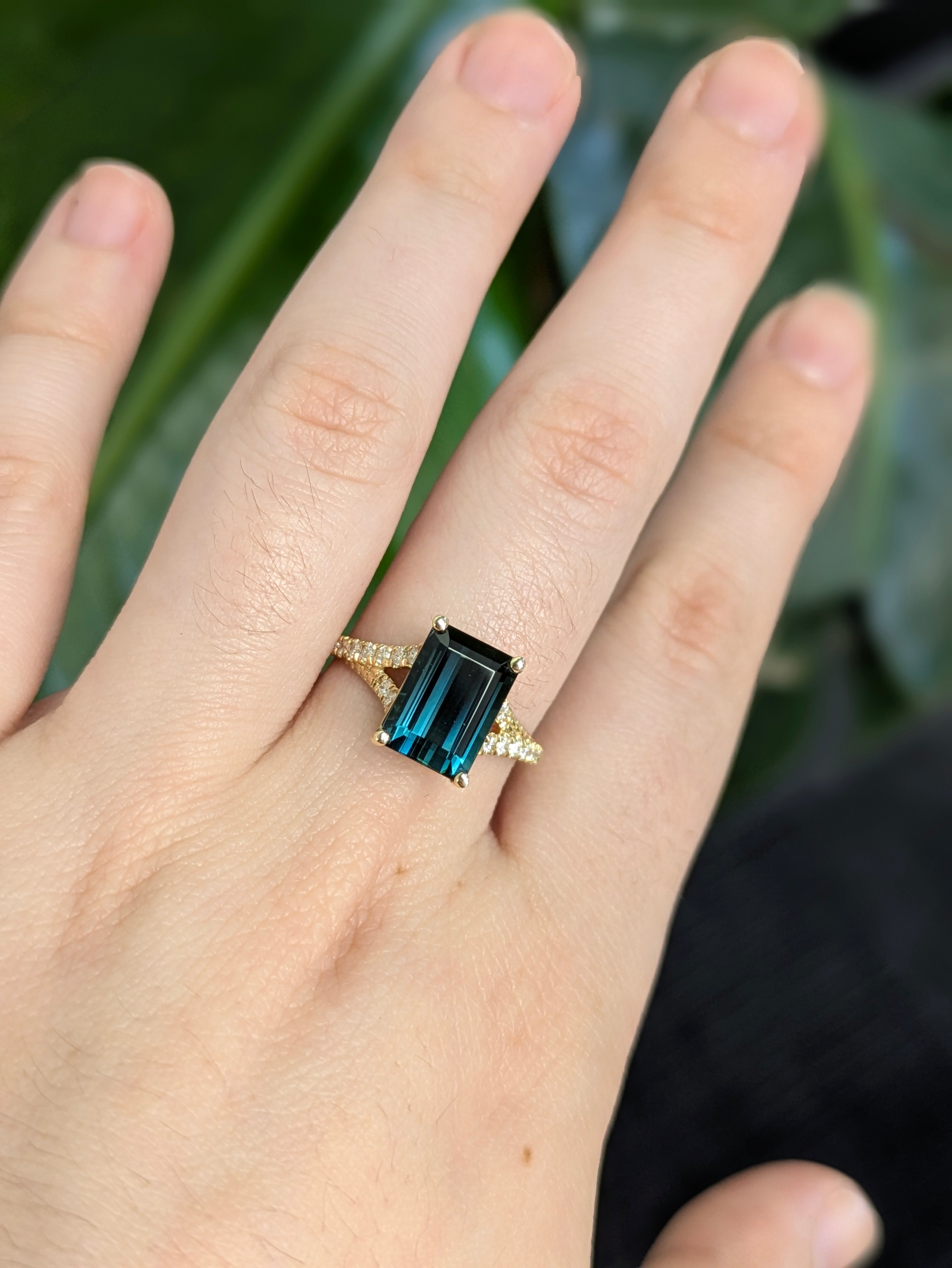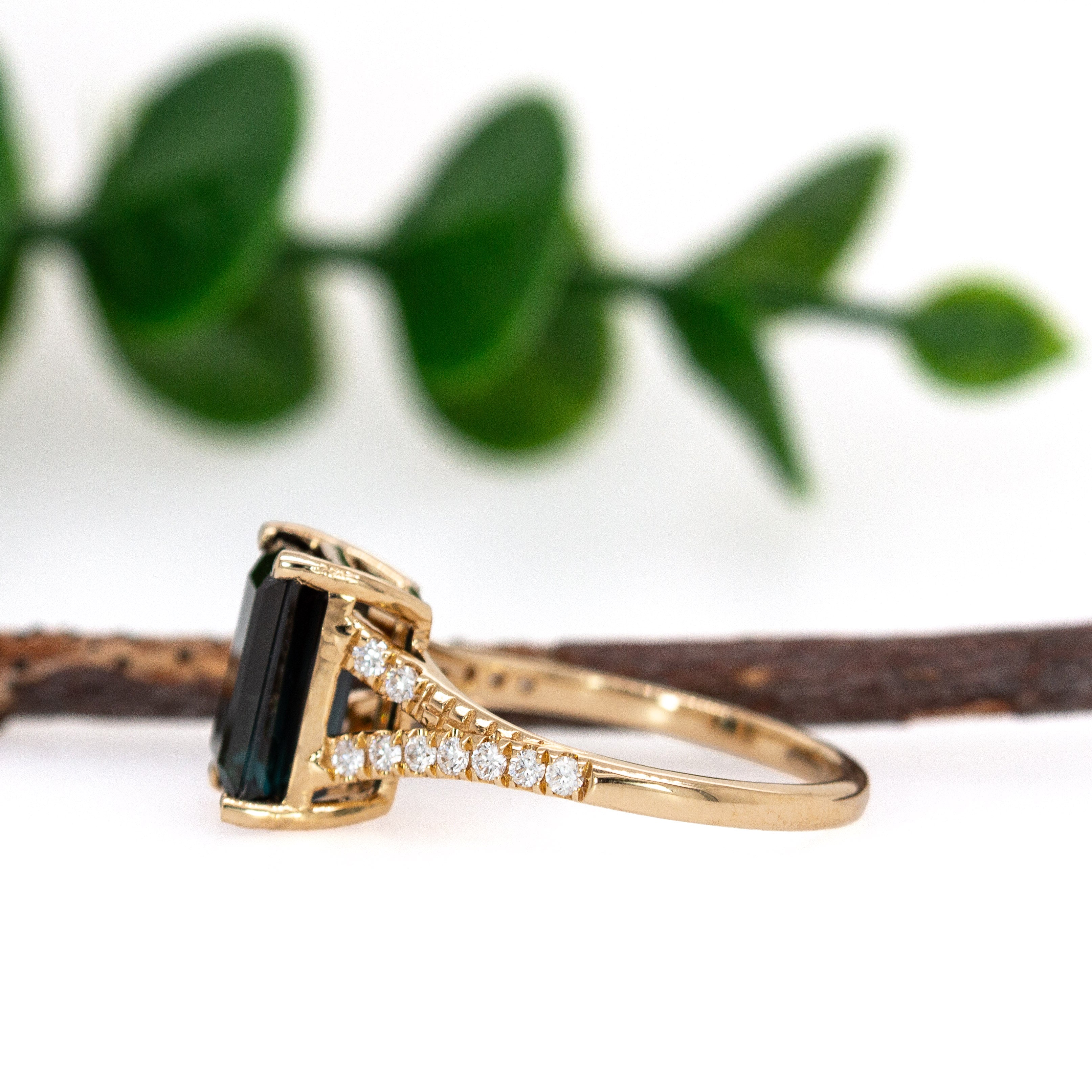 Crafted for the woman who loves to stand out, this 3.06ct Indicolite Tourmaline ring is a true testament to modern luxury and classic design. The emerald-cut center stone, with its mesmerizing ocean-inspired blue-green tones, sits proudly in a polished 14k yellow gold setting. Flanked by glittering earth-mined diamonds and supported by a chic split shank, this ring beautifully balances strength and elegance. Perfectly sized as a cocktail statement ring, it embodies sophistication and fine artistry, making it a piece that will be admired for generations to come.