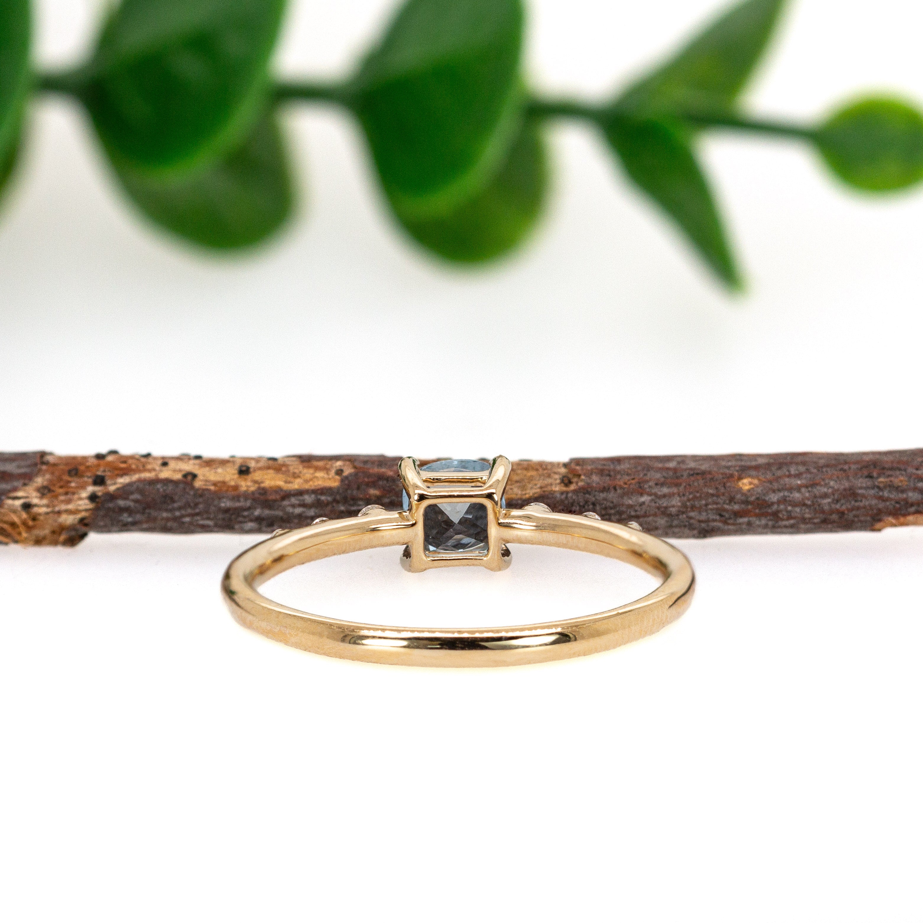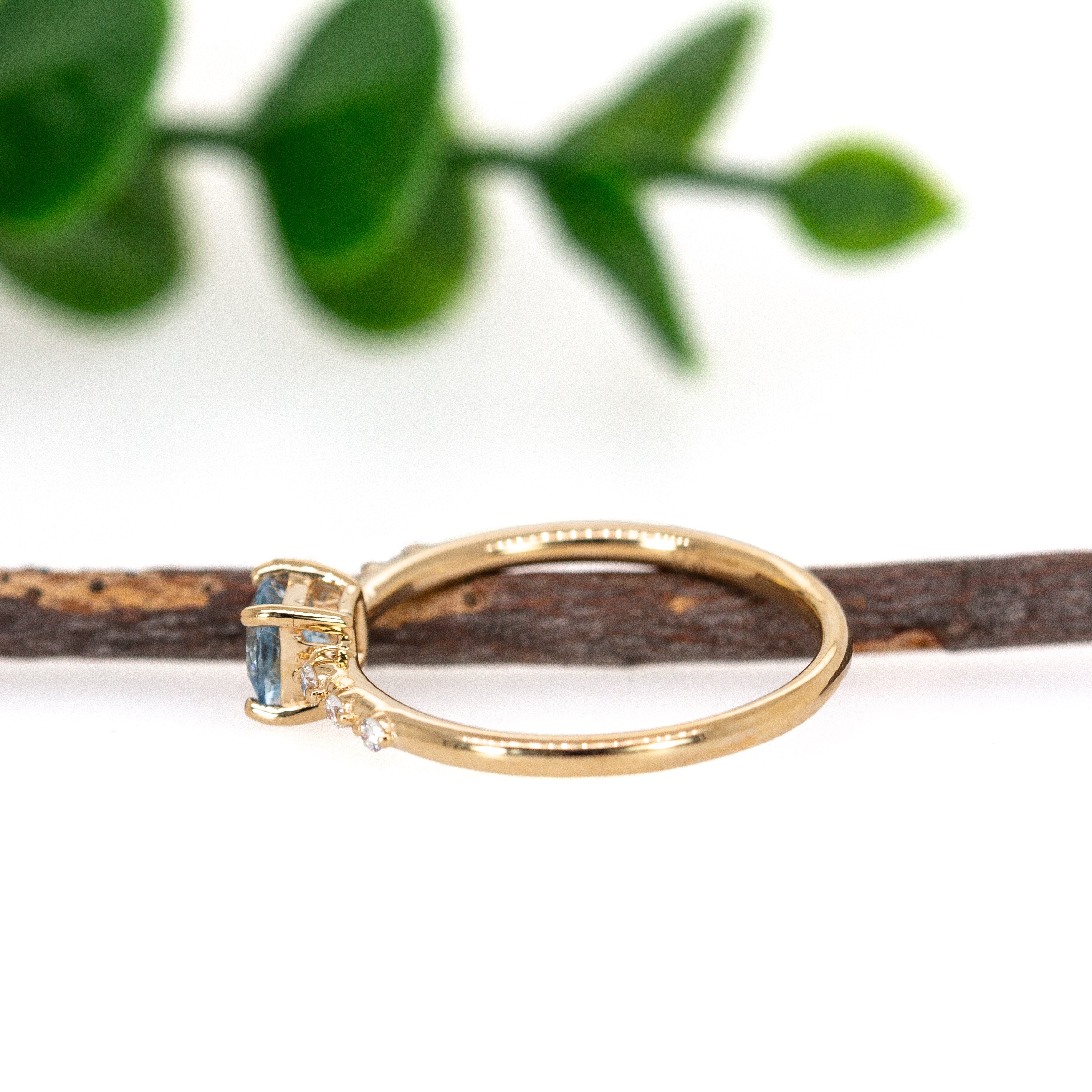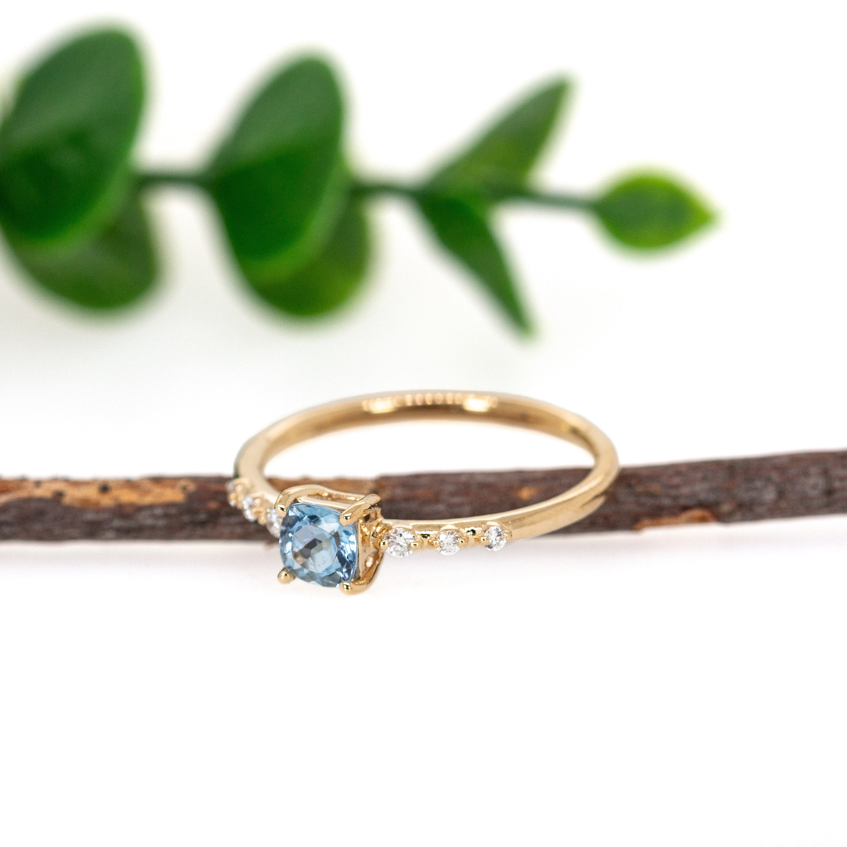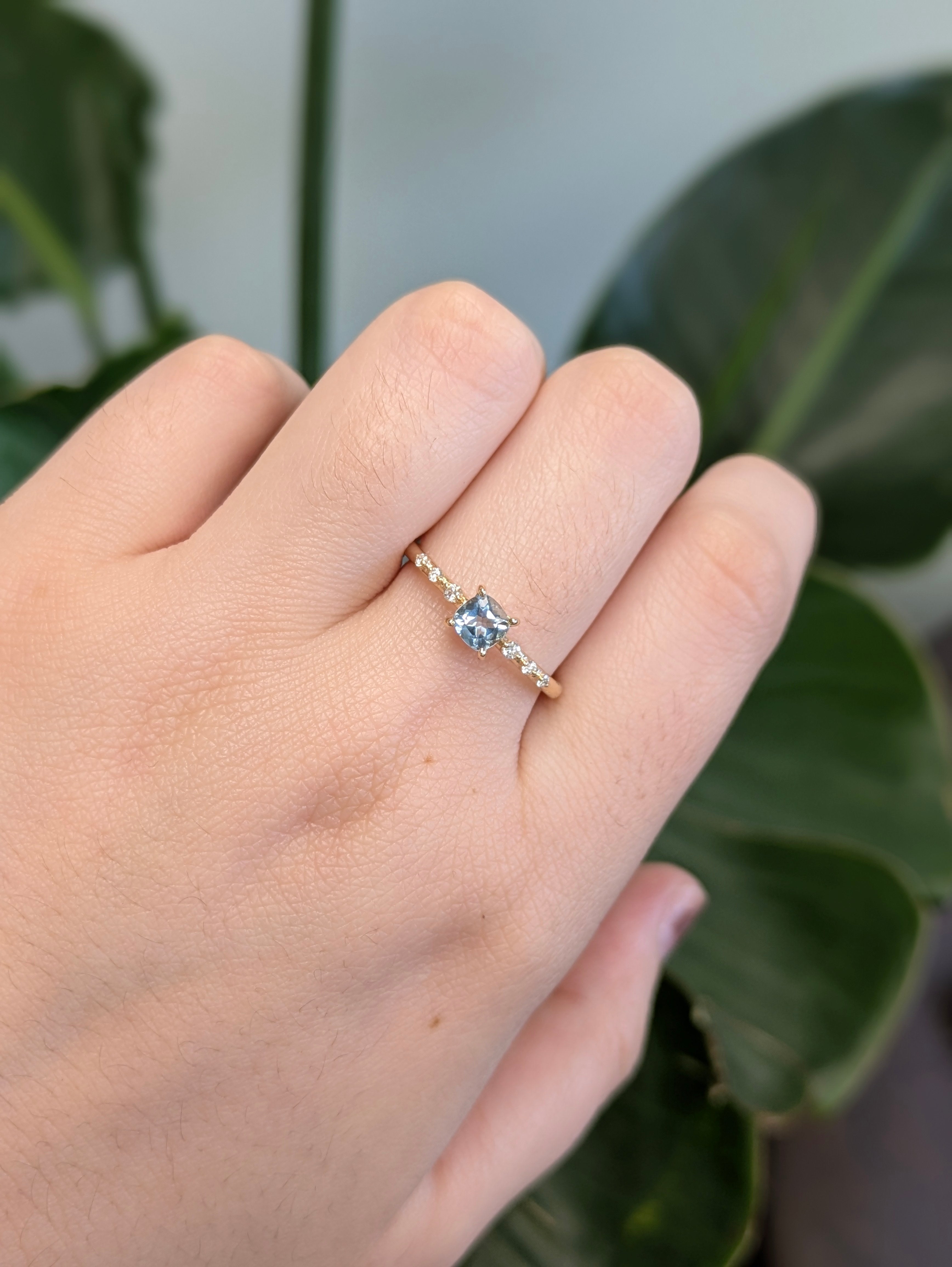 Simplicity meets sophistication in this dainty aquamarine ring, featuring a stunning 4mm Brazilian aquamarine at its center. Set in rich 14k yellow gold with genuine earth-mined diamond accents, it’s the ideal piece for everyday elegance.