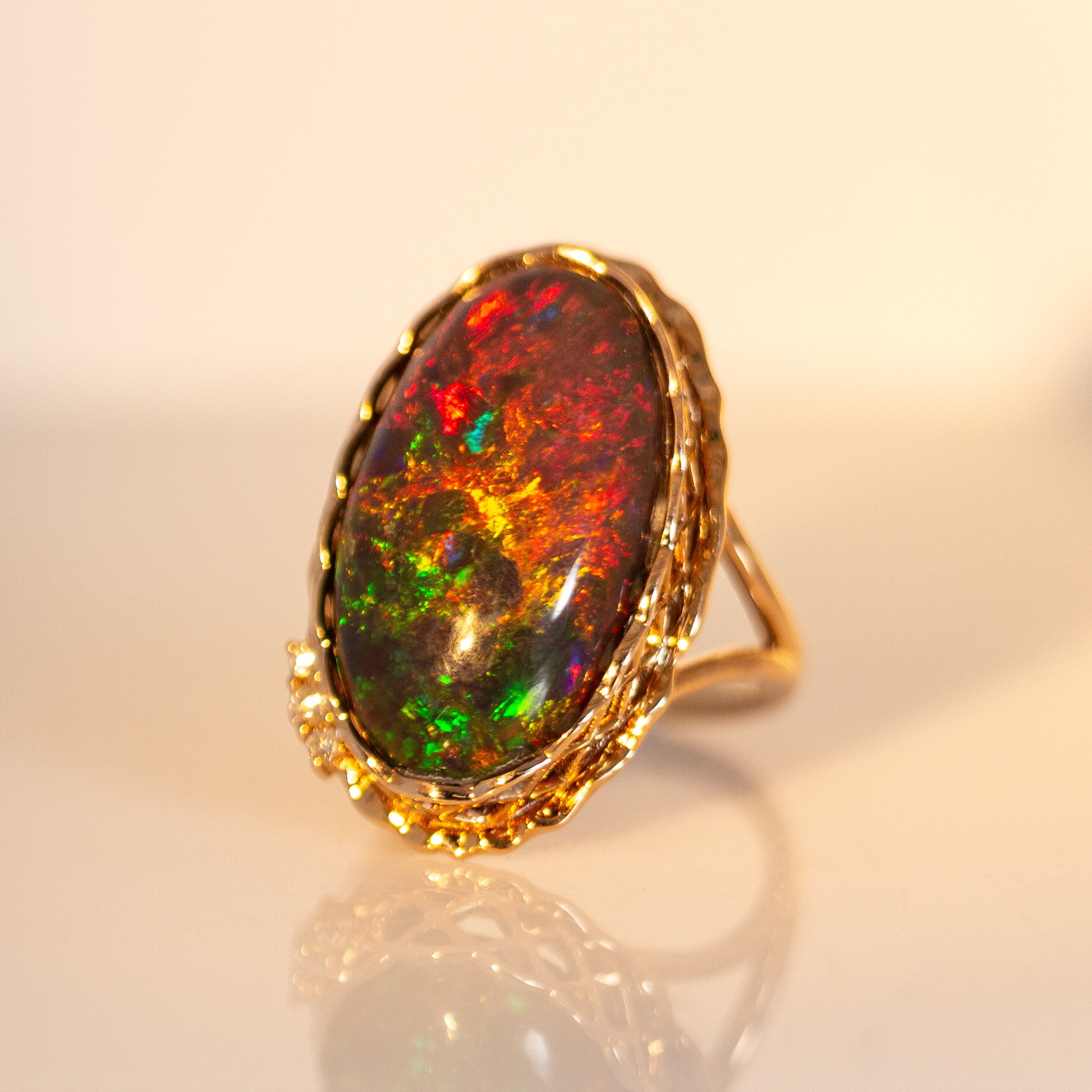 This is a ring that commands admiration. The 10.73-carat black opal, with its striking cabochon dome, exudes mystery and allure. Crafted in solid 14k rose gold, the ring features a bezel setting that offers a sleek, contemporary edge while fully protecting the gem. Natural, earth-mined diamonds sparkle on each side, lending sophistication and balance to the piece. The split shank design not only enhances its architectural presence but ensures a comfortable fit for everyday wear. Whether worn as a bold evening statement or a signature power piece, this ring embodies confidence, luxury, and timeless grace.