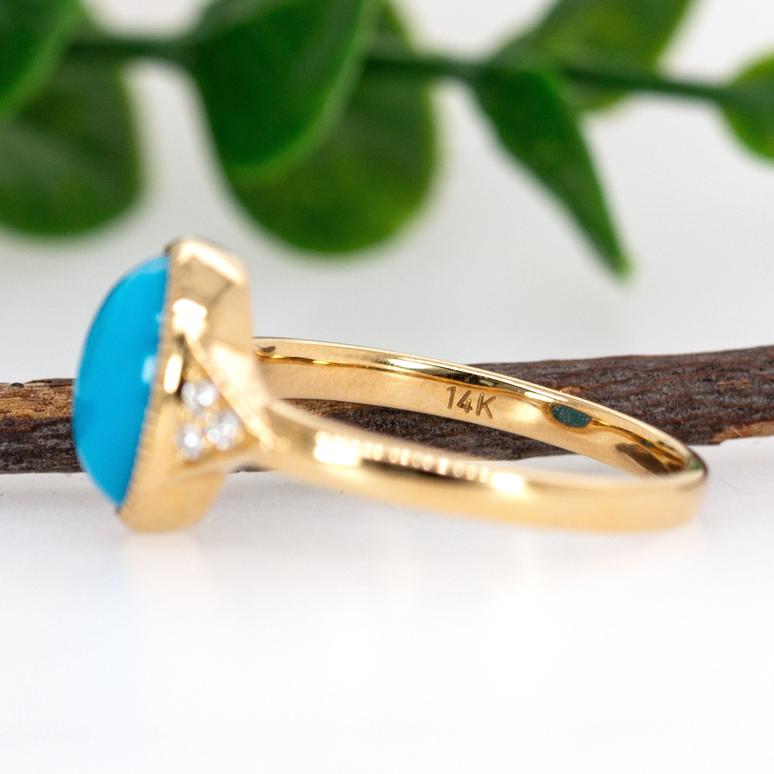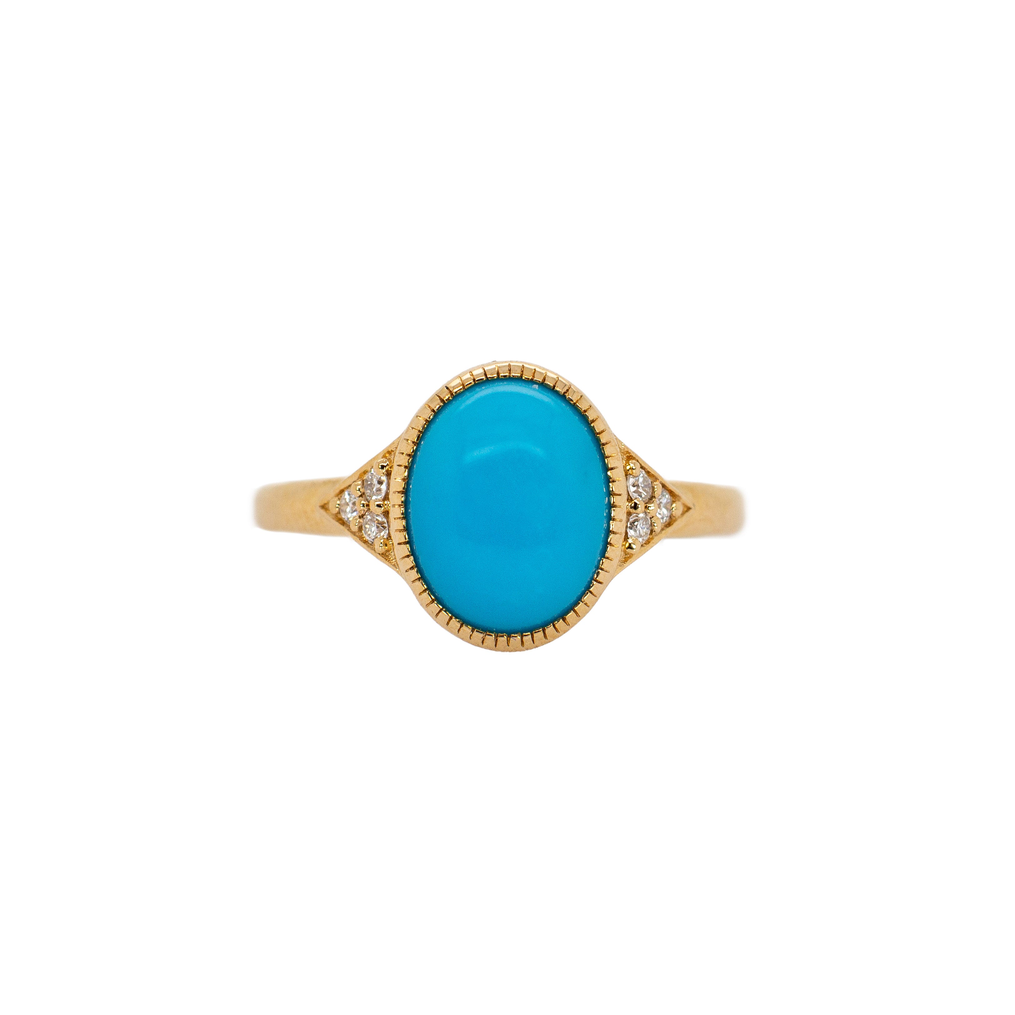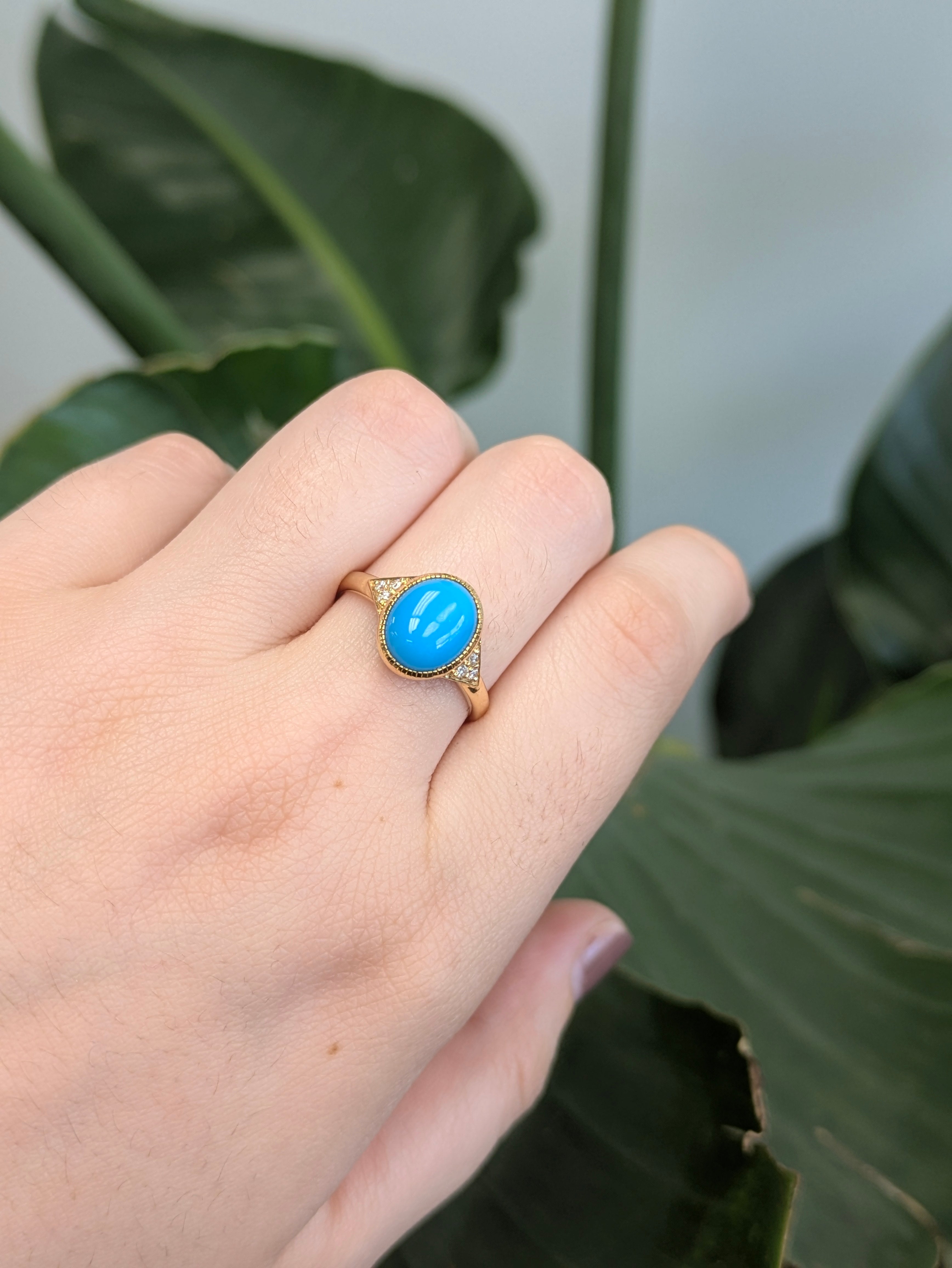 Beauty lies in the details—and this ring delivers on every one. Centered with a mesmerizing Arizona Sleeping Beauty Turquoise (3.73 carats, 10x8mm), this piece celebrates natural color and fine craftsmanship. The turquoise is securely set in a smooth bezel of 14k yellow gold, accented by twinkling earth-mined diamonds, and finished with intricate milgrain edging for a touch of vintage charm. Whether worn as a statement ring or a signature piece, it’s a timeless blend of bold color and elegant design.