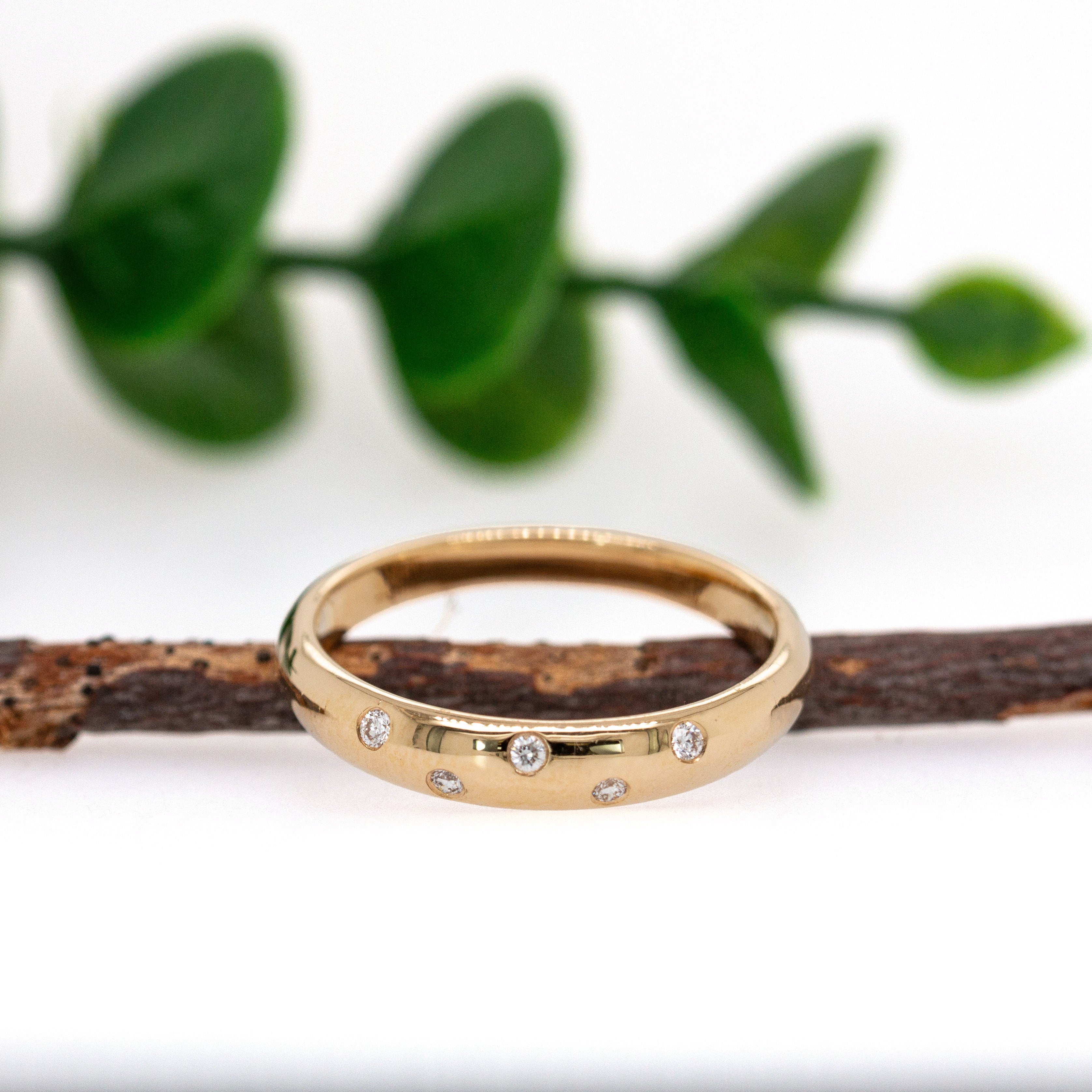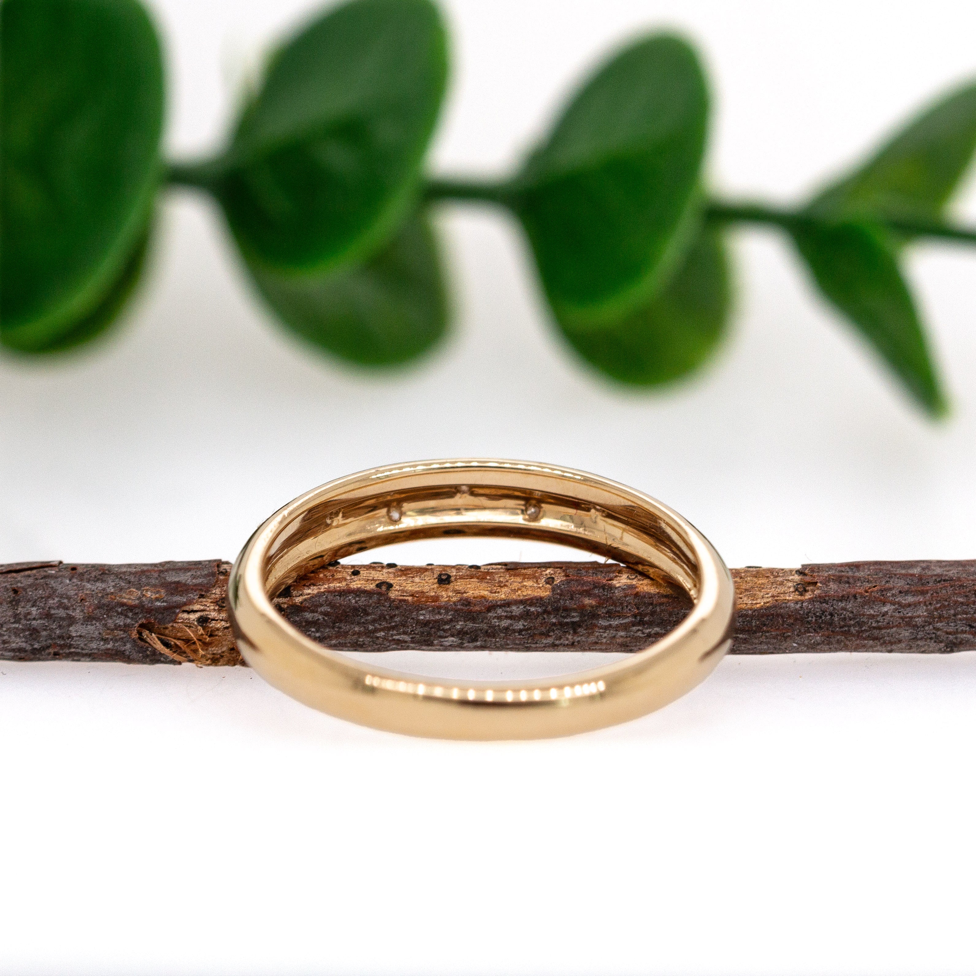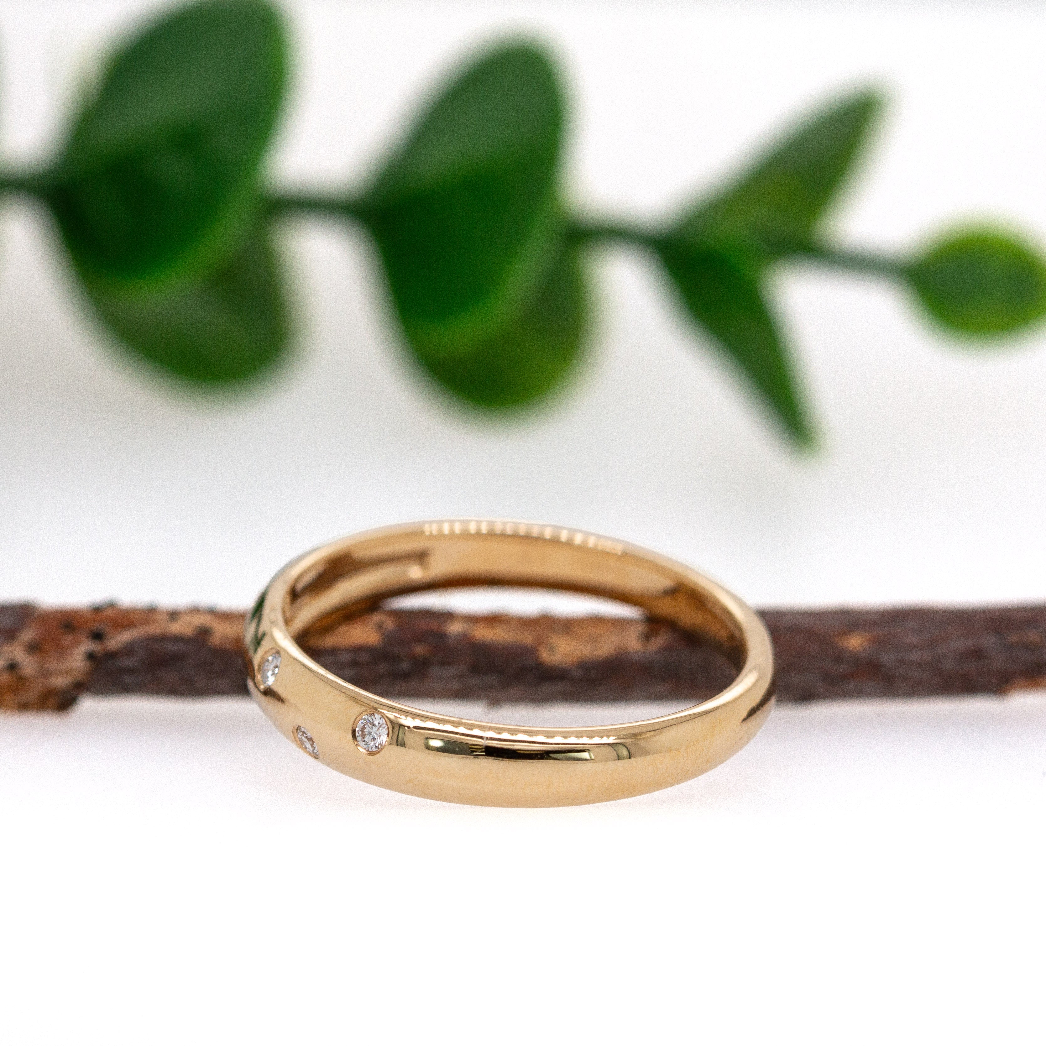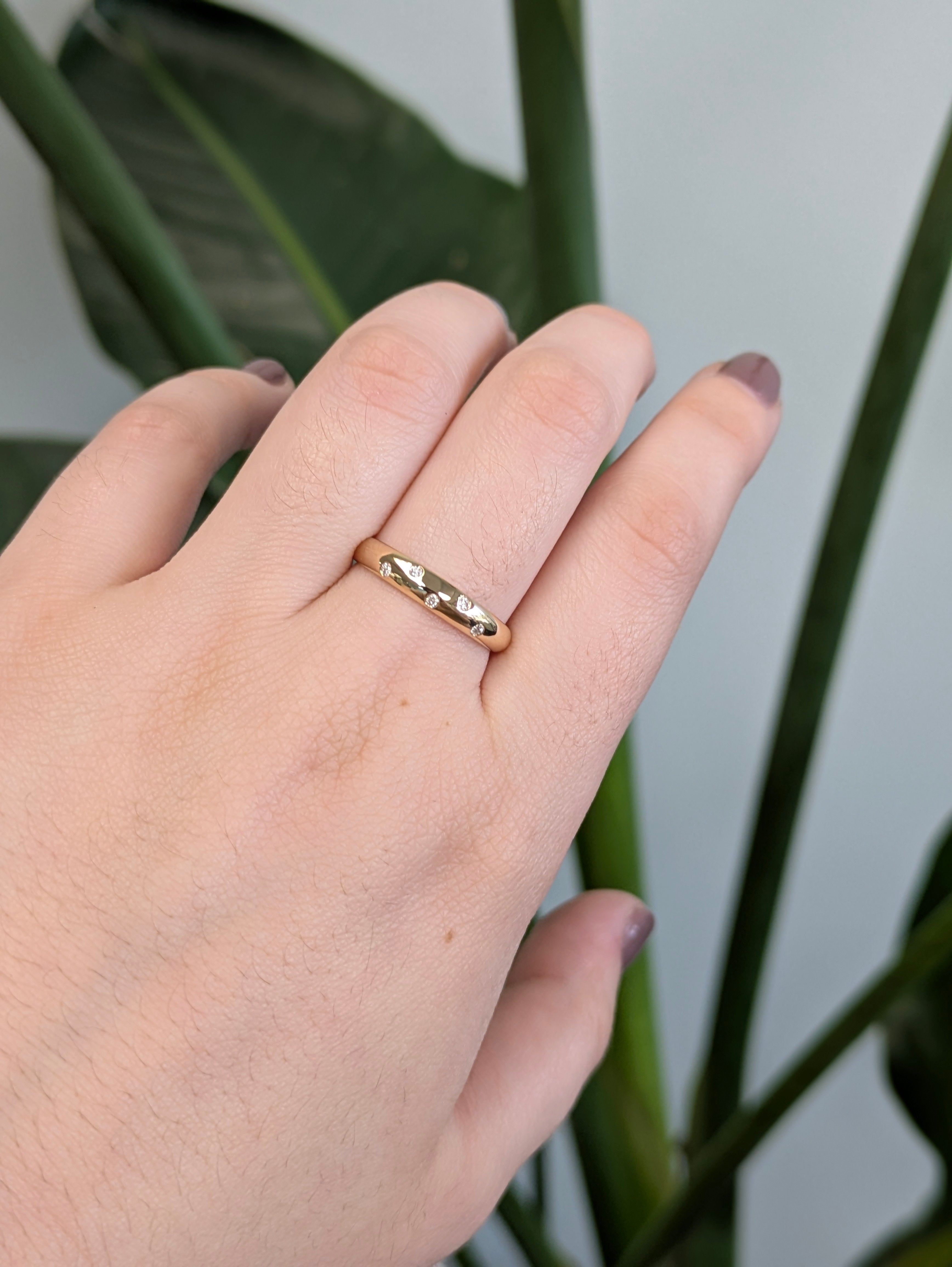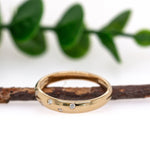 Sleek, strong, and effortlessly elegant—this solid 14k yellow gold wedding band is adorned with flush-set, natural earth-mined diamonds that catch the light with quiet brilliance.