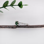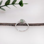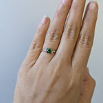 A simple dainty ring perfect for the minimalist in your life or for giving someone their first piece of jewelry :) This green garnet presents a mixture of green hues which is perfectly accentuated by diamonds on each side. The slim white gold shank provides a lightweight, effortless look!