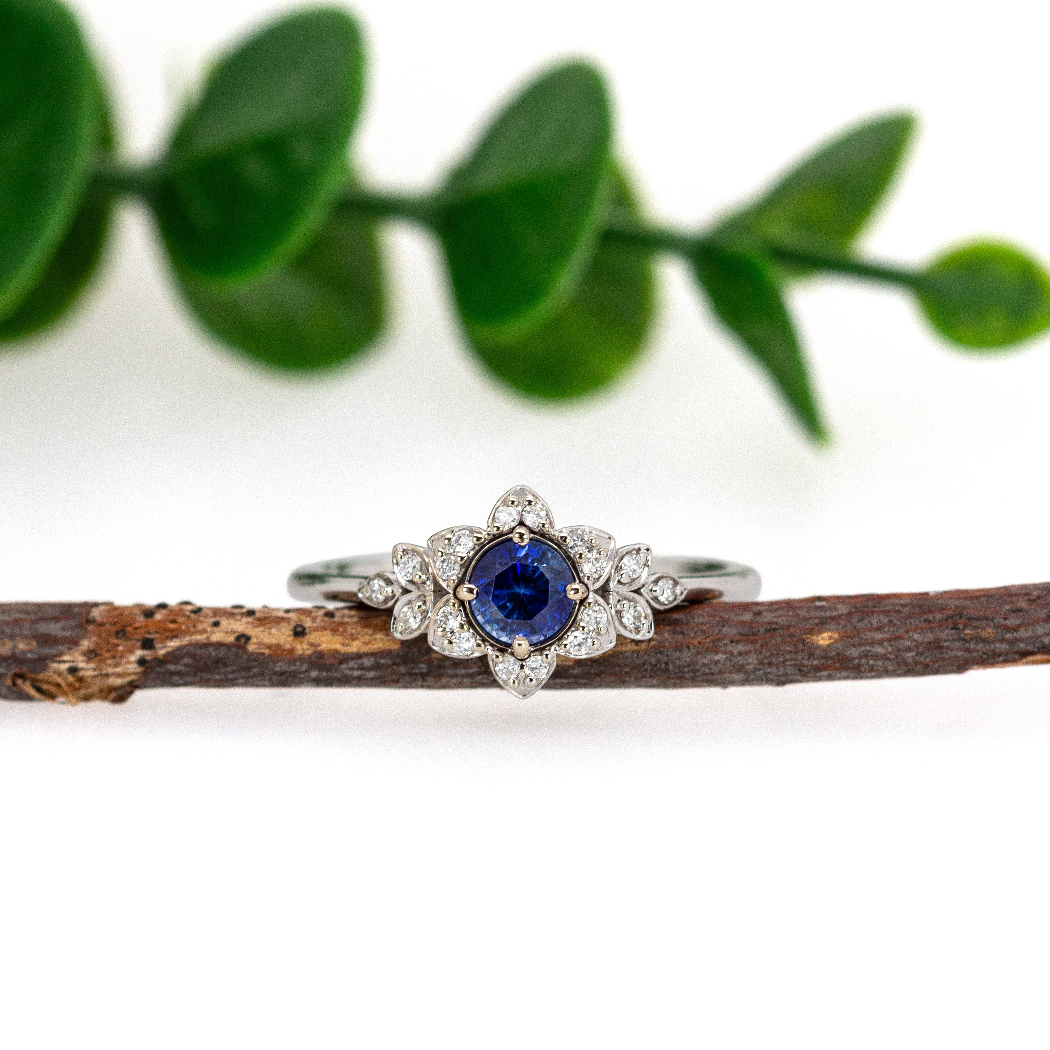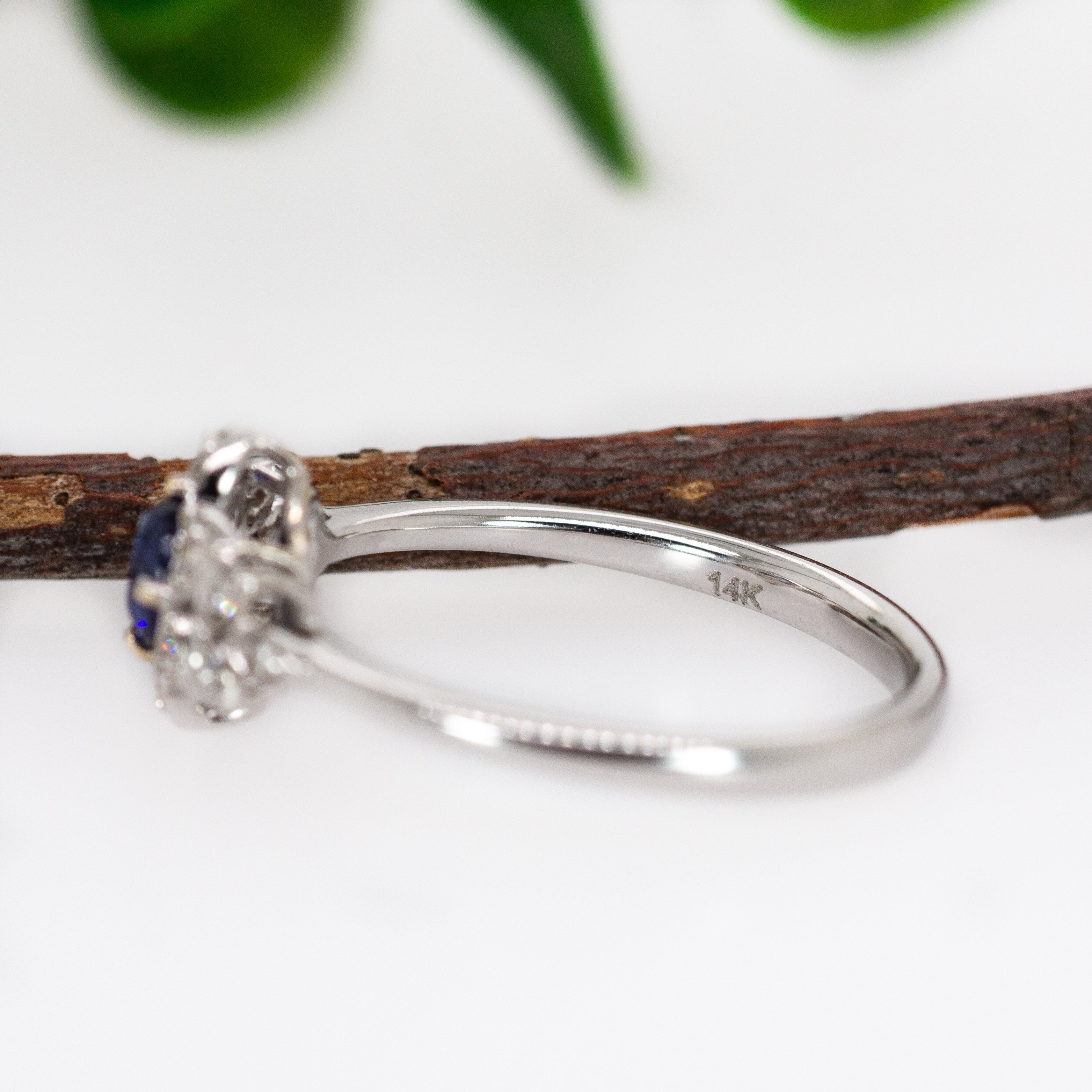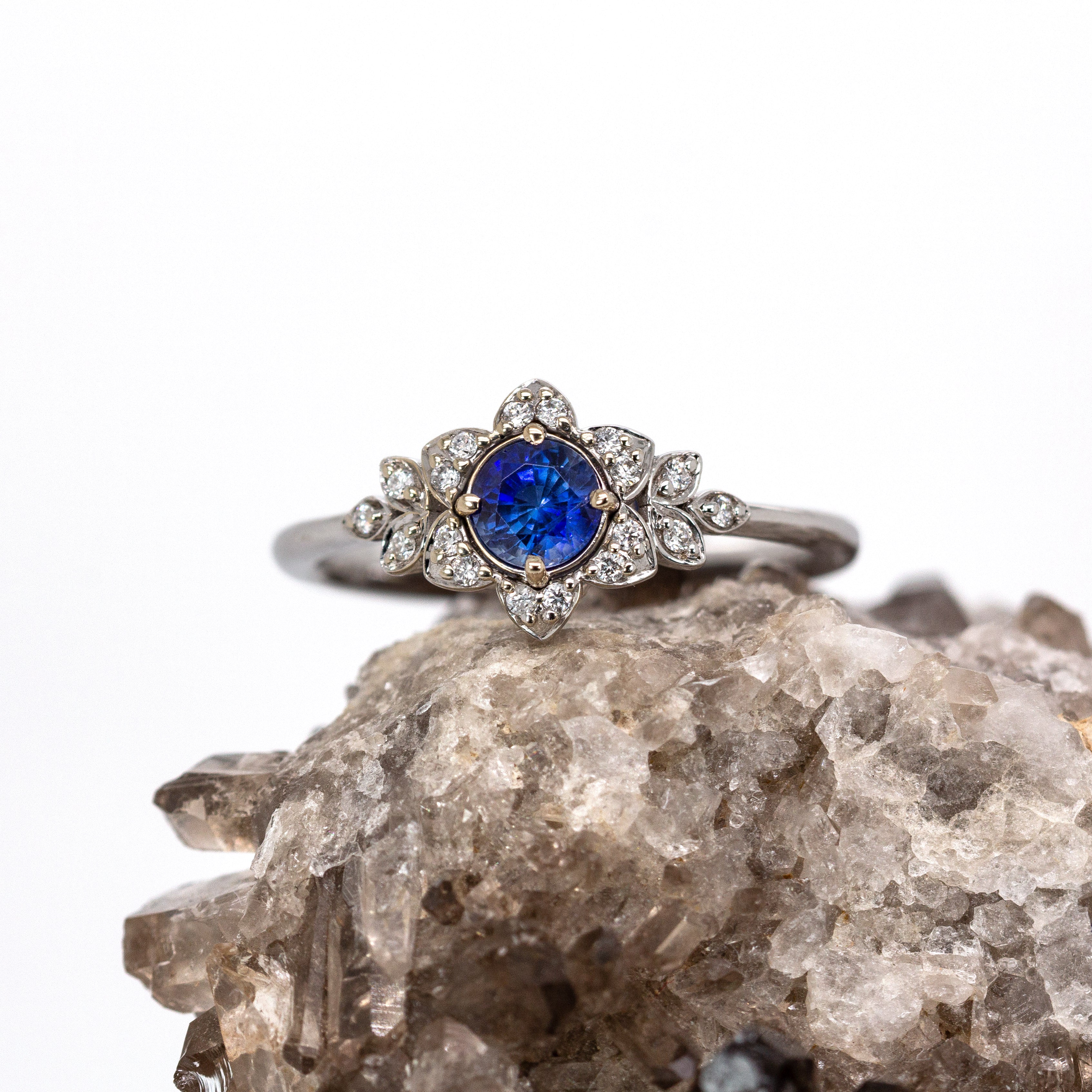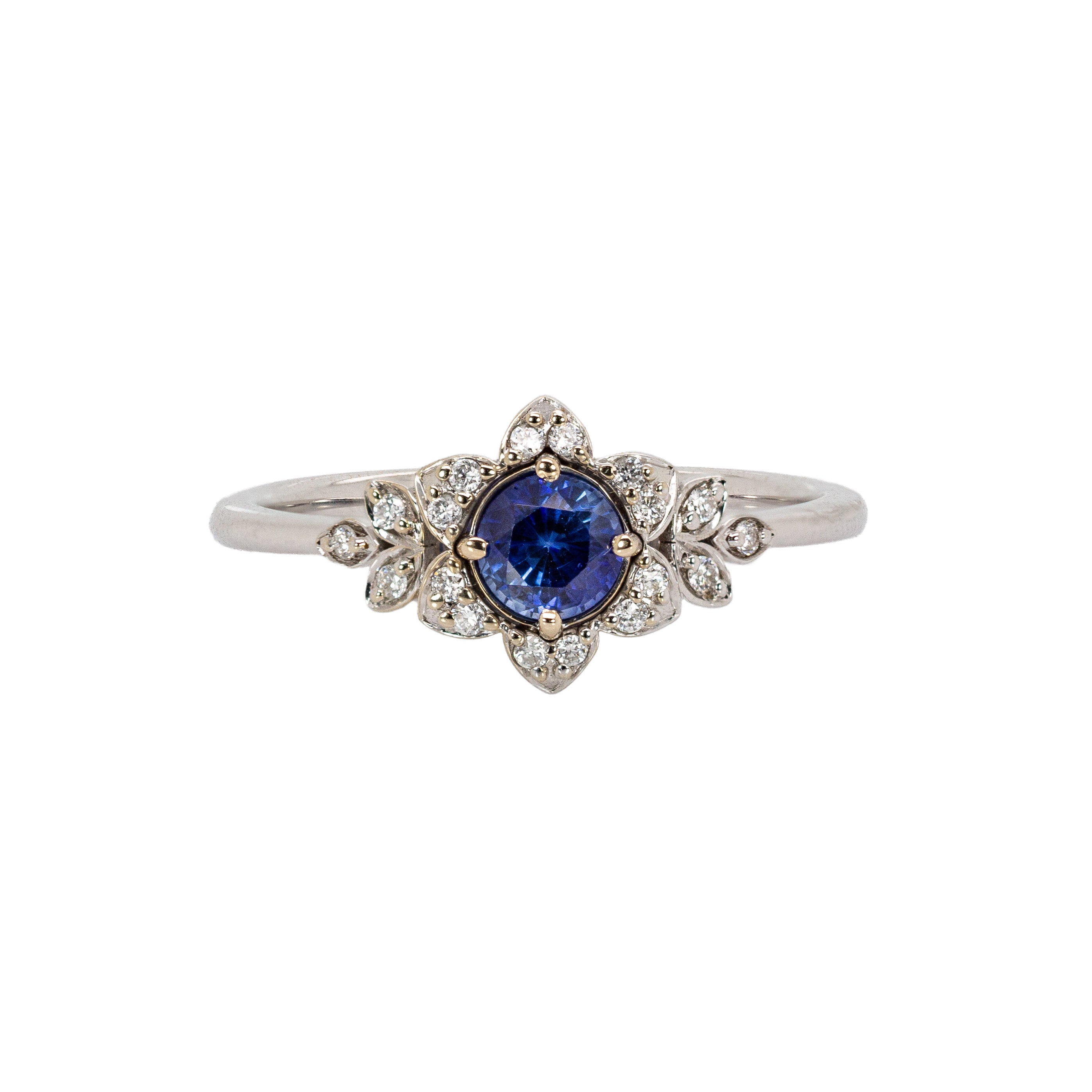 A true testament to fine jewelry artistry, this Ceylon sapphire and diamond floral ring captures light and admiration from every angle. The centerpiece—a 4.6mm, 0.48ct AAA sapphire—offers a captivating deep blue that symbolizes wisdom and sincerity. Natural earth-mined diamonds accentuate the floral design, adding a subtle yet radiant sparkle to the band. Expertly handcrafted in solid 14k white gold, this ring delivers a graceful, feminine charm that feels both modern and timeless, perfect for everyday elegance or as a treasured statement piece.