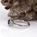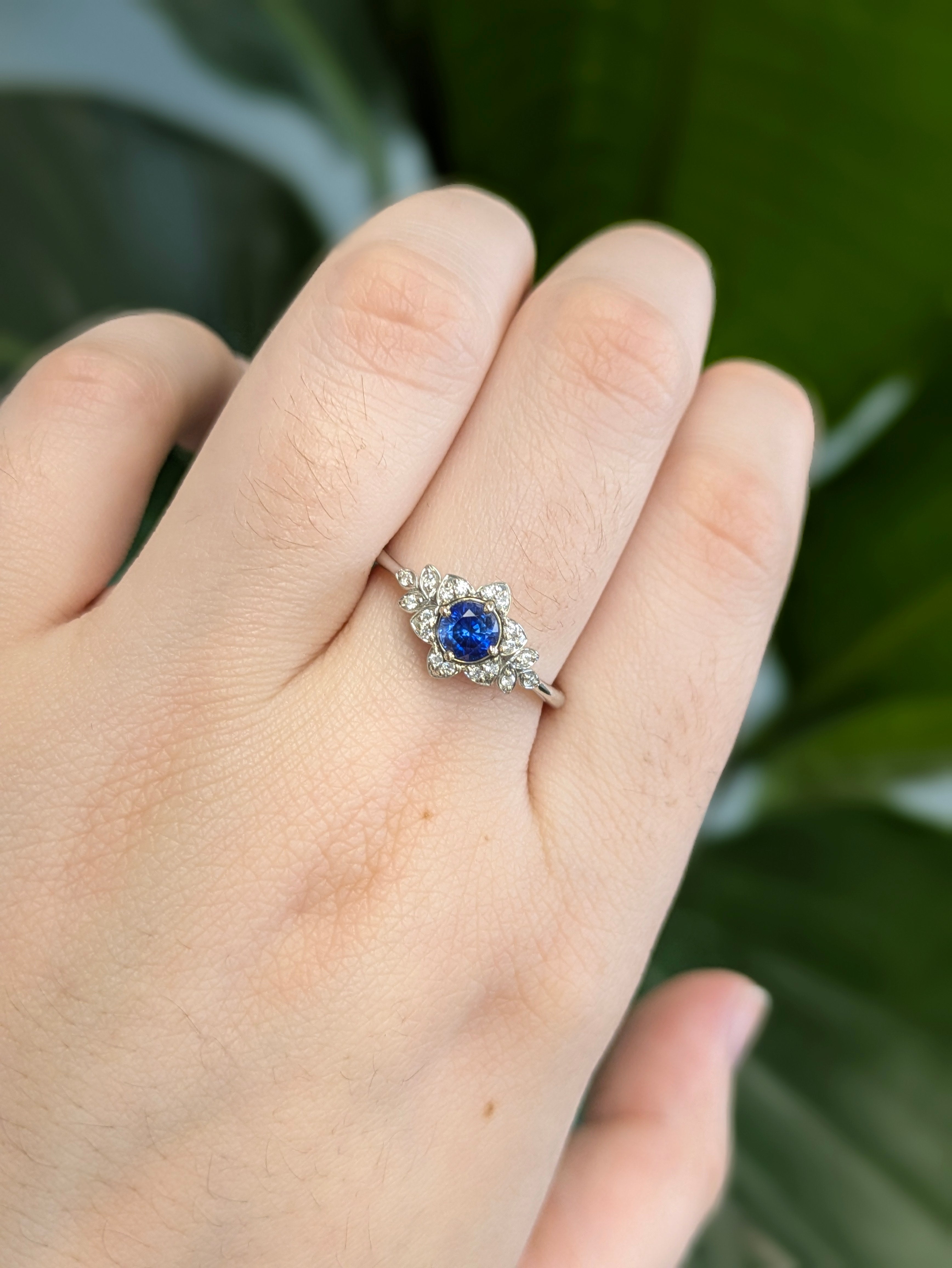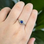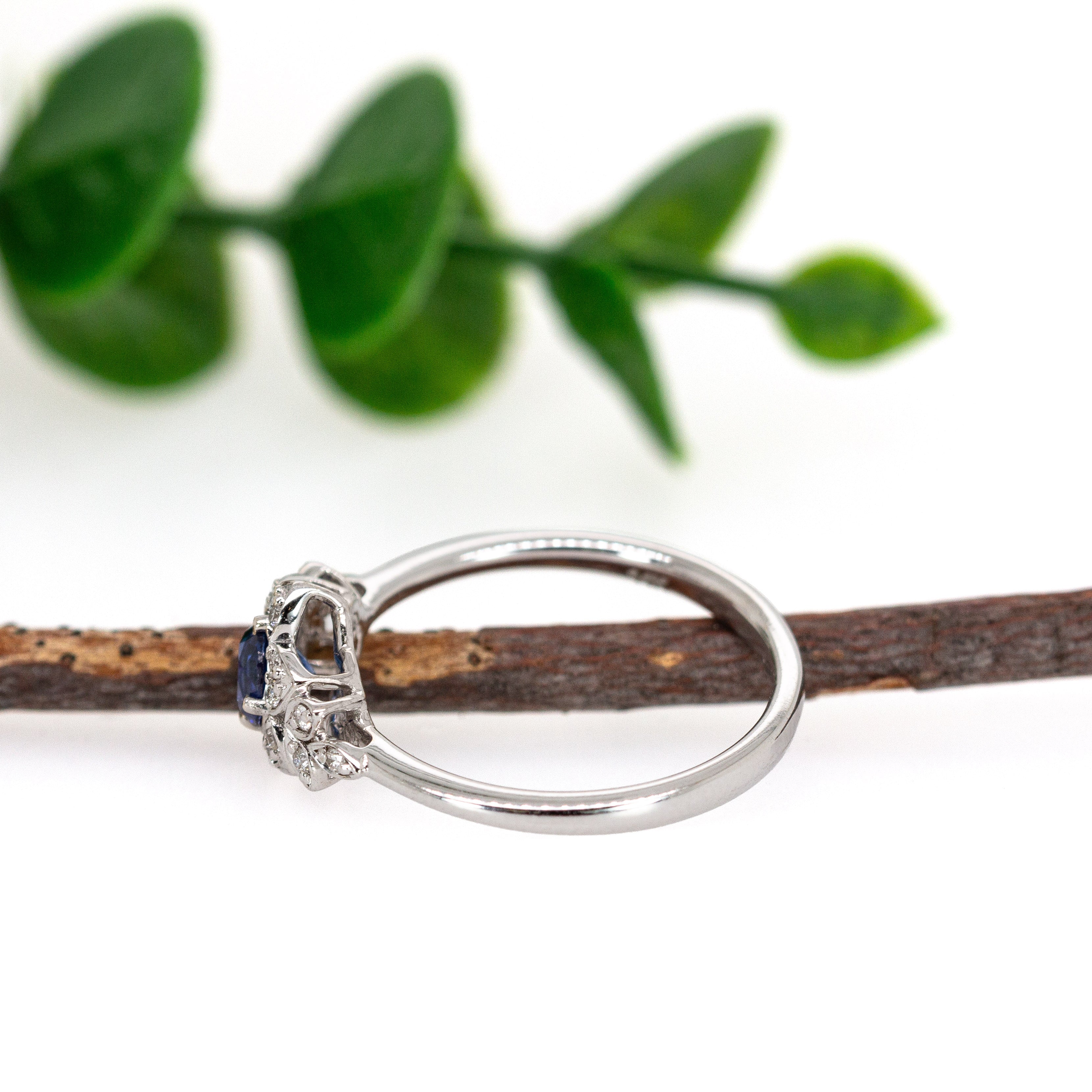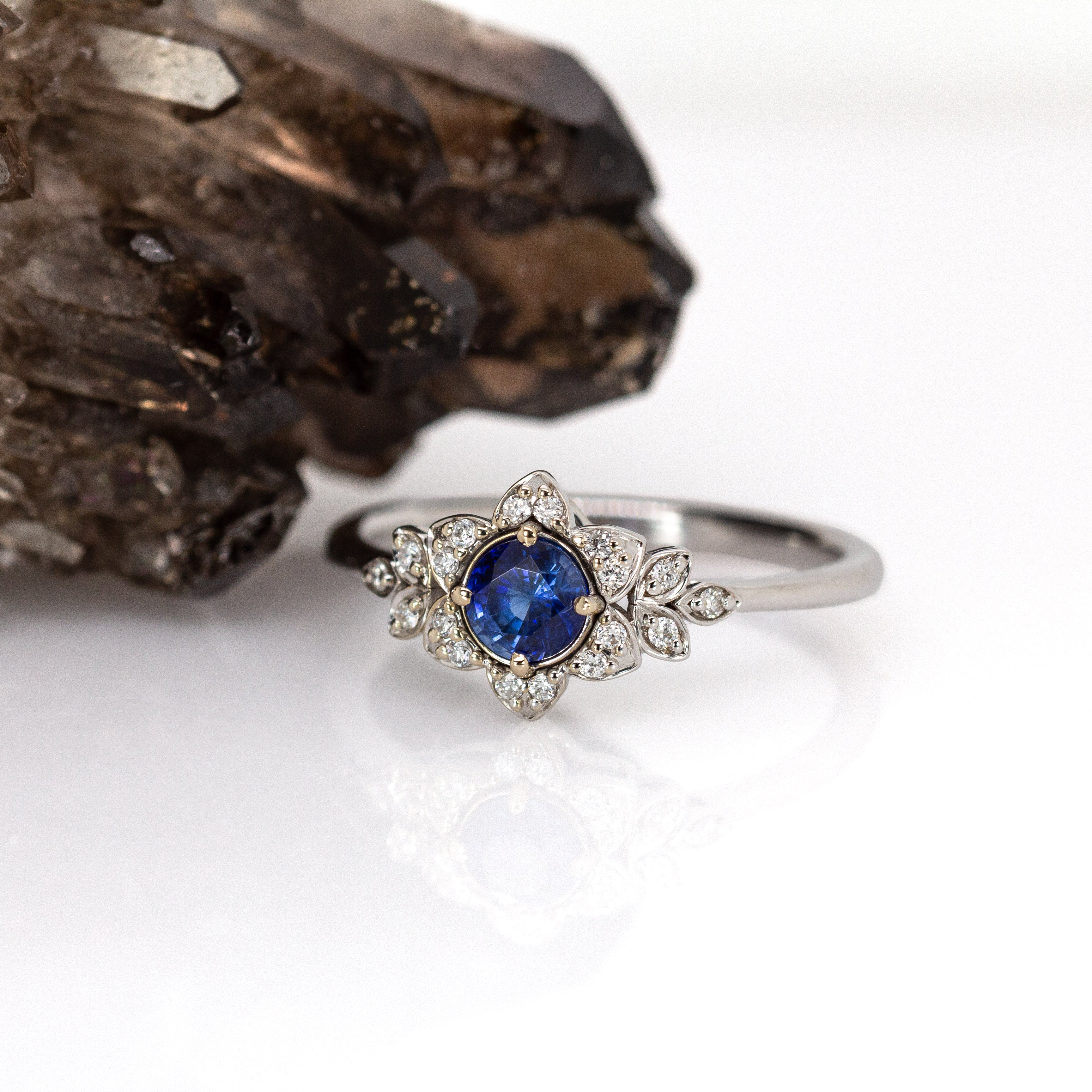 A true testament to fine jewelry artistry, this Ceylon sapphire and diamond floral ring captures light and admiration from every angle. The centerpiece—a 4.6mm, 0.48ct AAA sapphire—offers a captivating deep blue that symbolizes wisdom and sincerity. Natural earth-mined diamonds accentuate the floral design, adding a subtle yet radiant sparkle to the band. Expertly handcrafted in solid 14k white gold, this ring delivers a graceful, feminine charm that feels both modern and timeless, perfect for everyday elegance or as a treasured statement piece.
