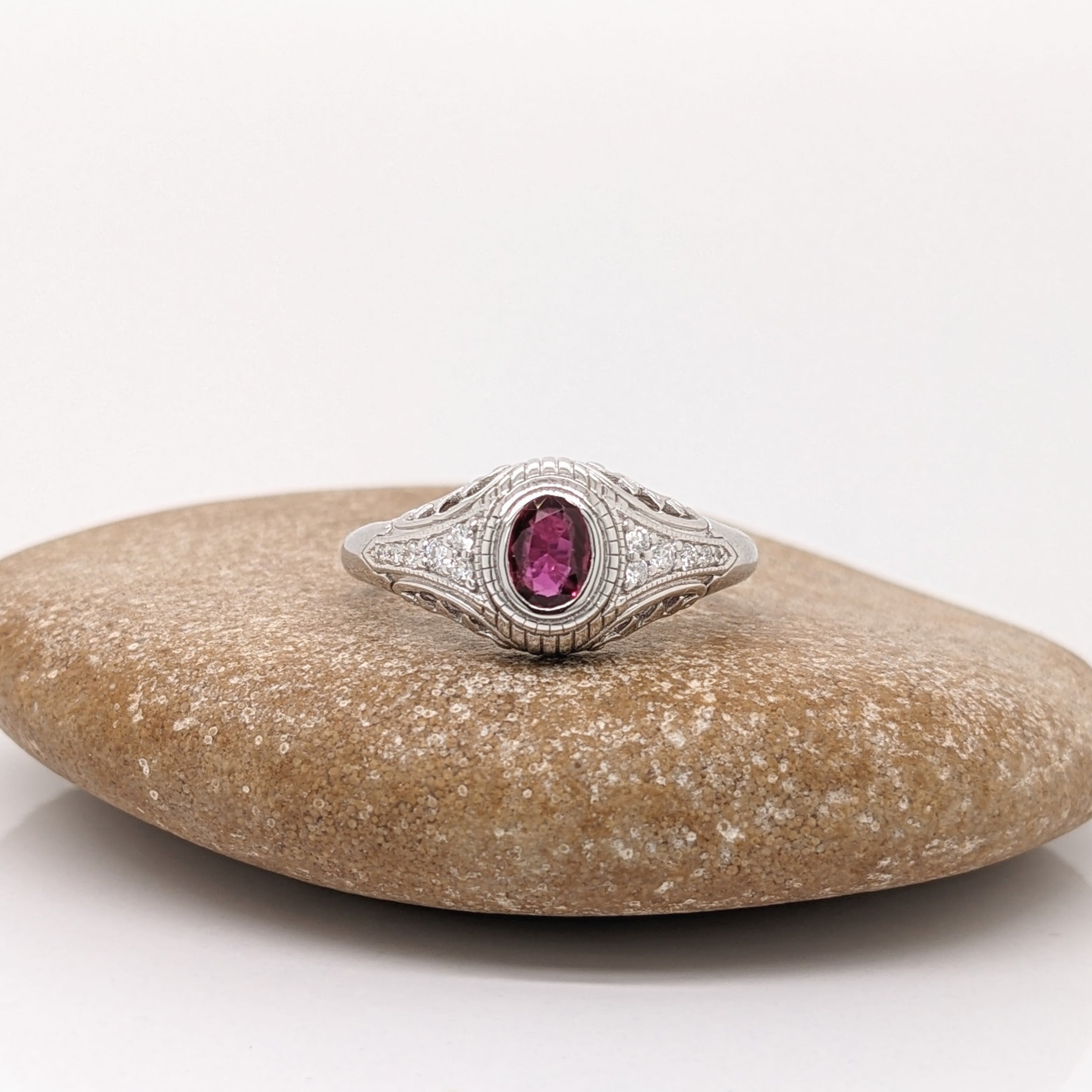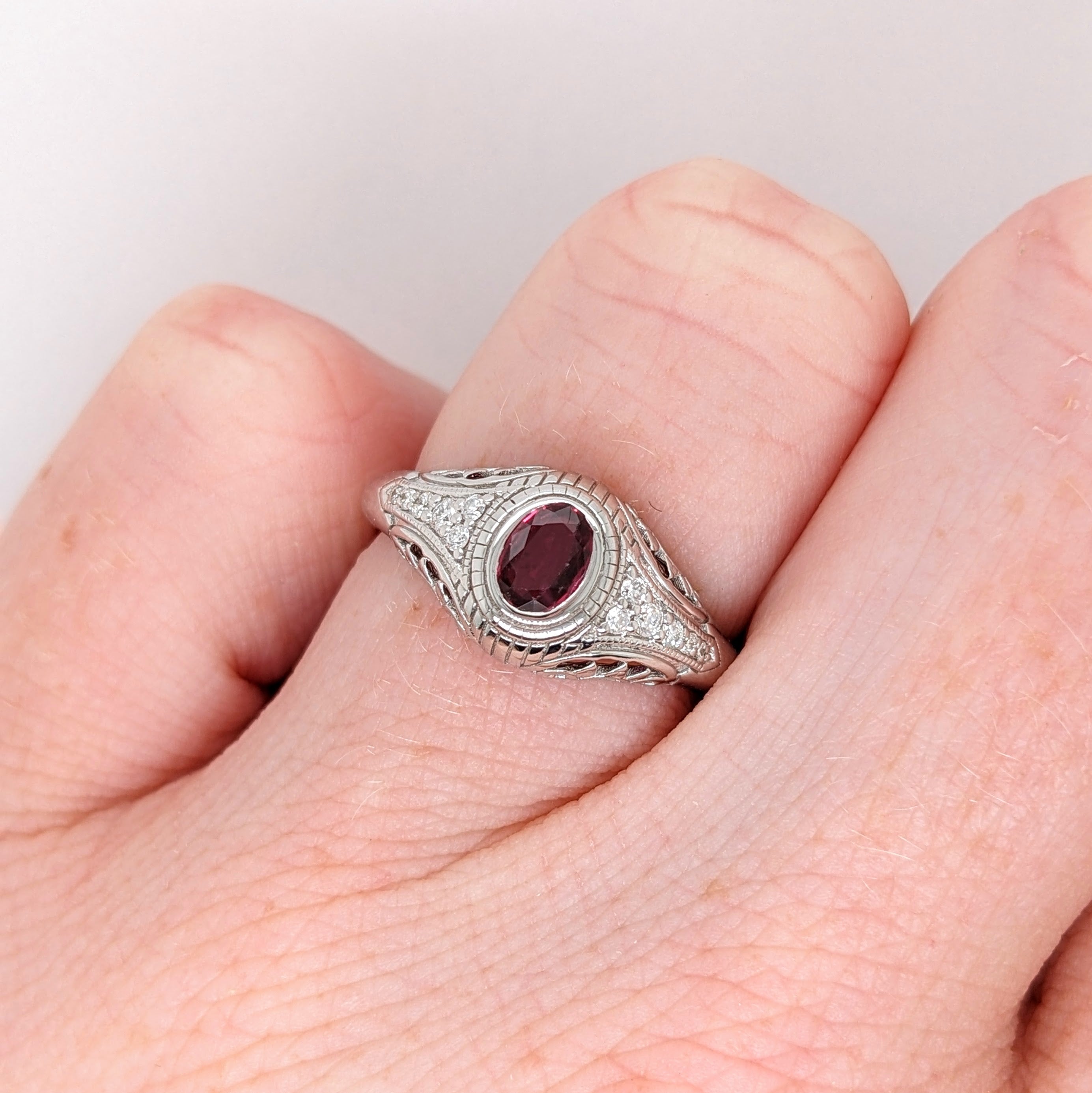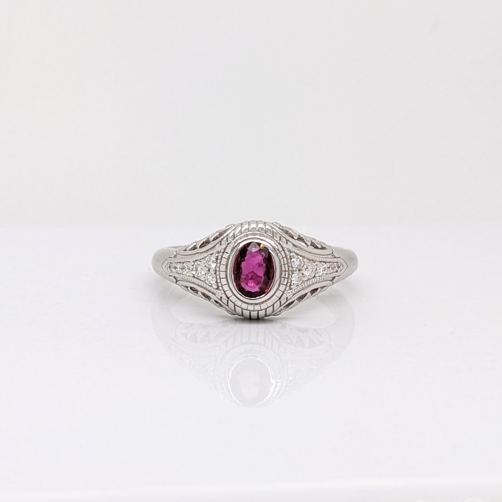 Vintage Inspired Ruby Ring w Earth Mined Diamonds in Solid 14K White Gold | Oval 5x4mm
