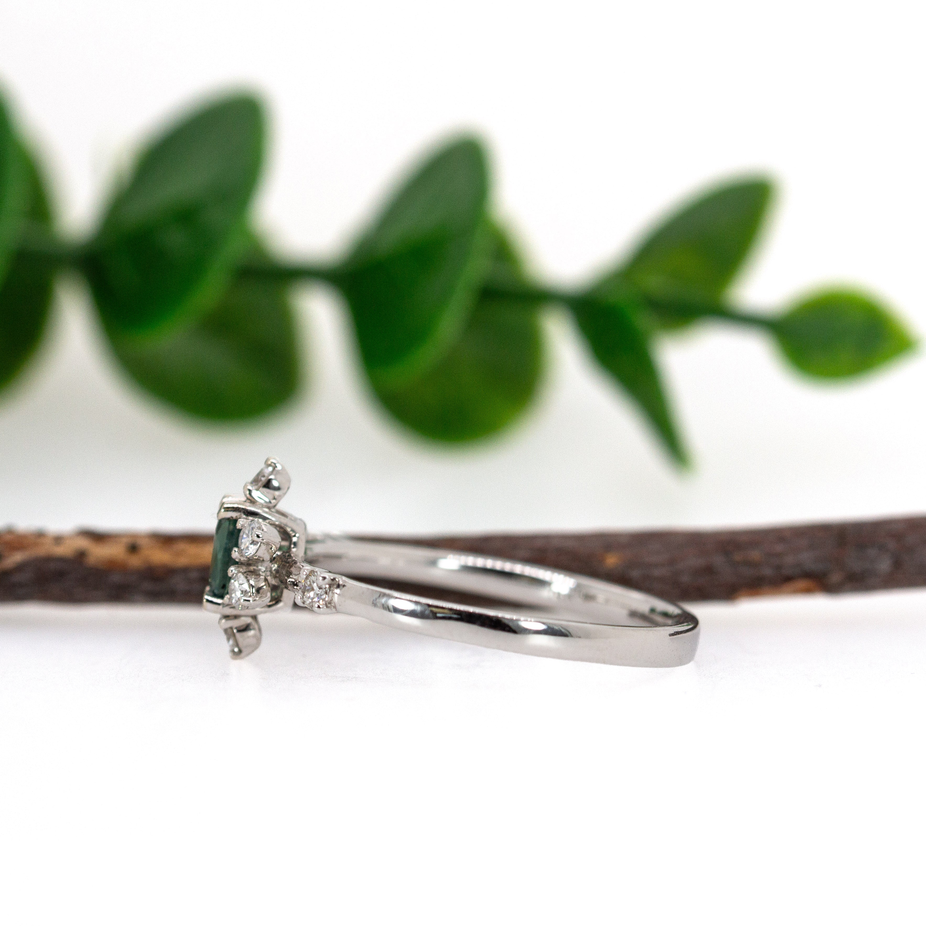 Discover timeless elegance with this stunning 0.37 carat oval-cut alexandrite ring, showcasing a rare natural gemstone that shifts from teal-green in daylight to rich purplish-red under indoor light. Set in solid 14K white gold and accented with genuine earth-mined diamonds, this piece blends classic sophistication with extraordinary beauty.