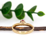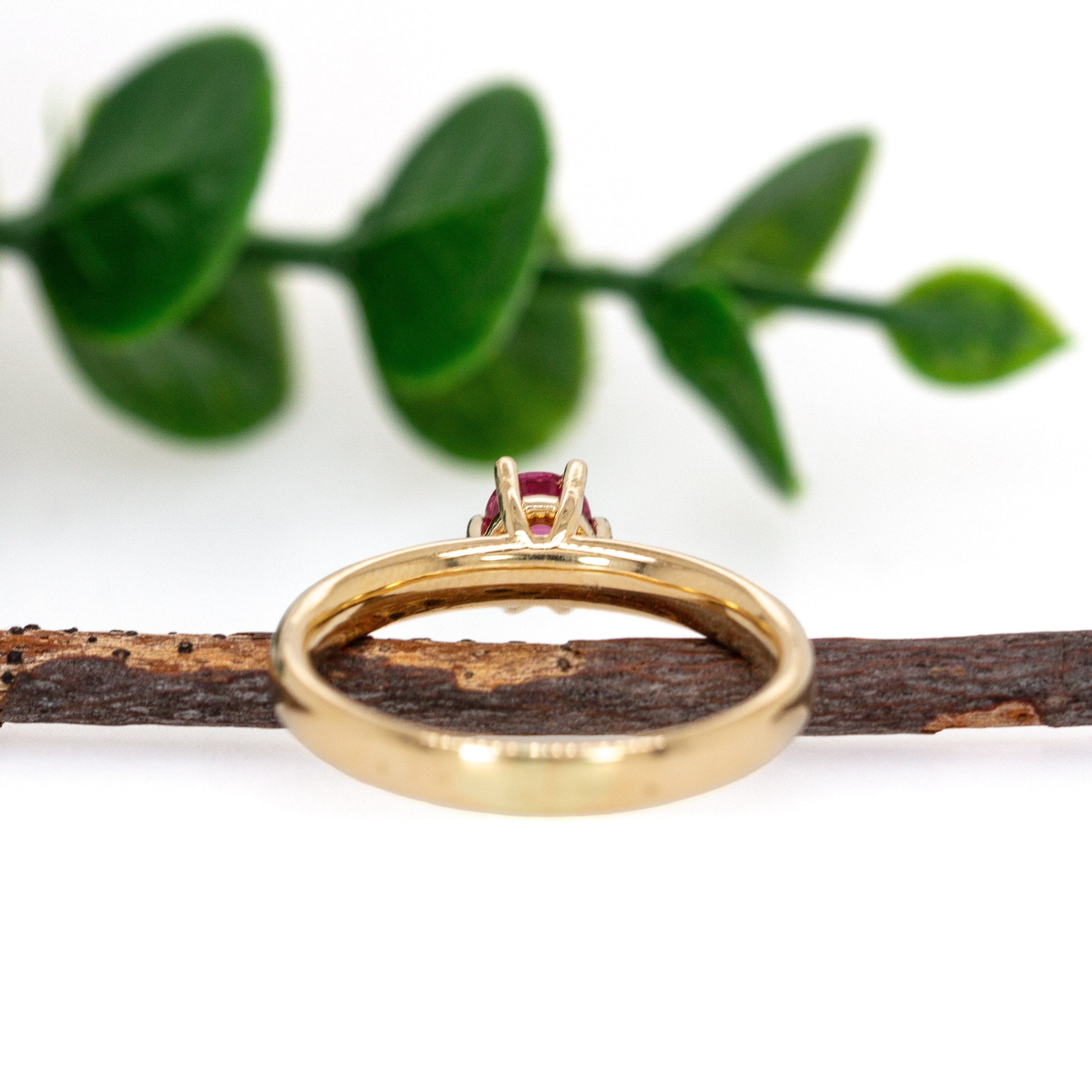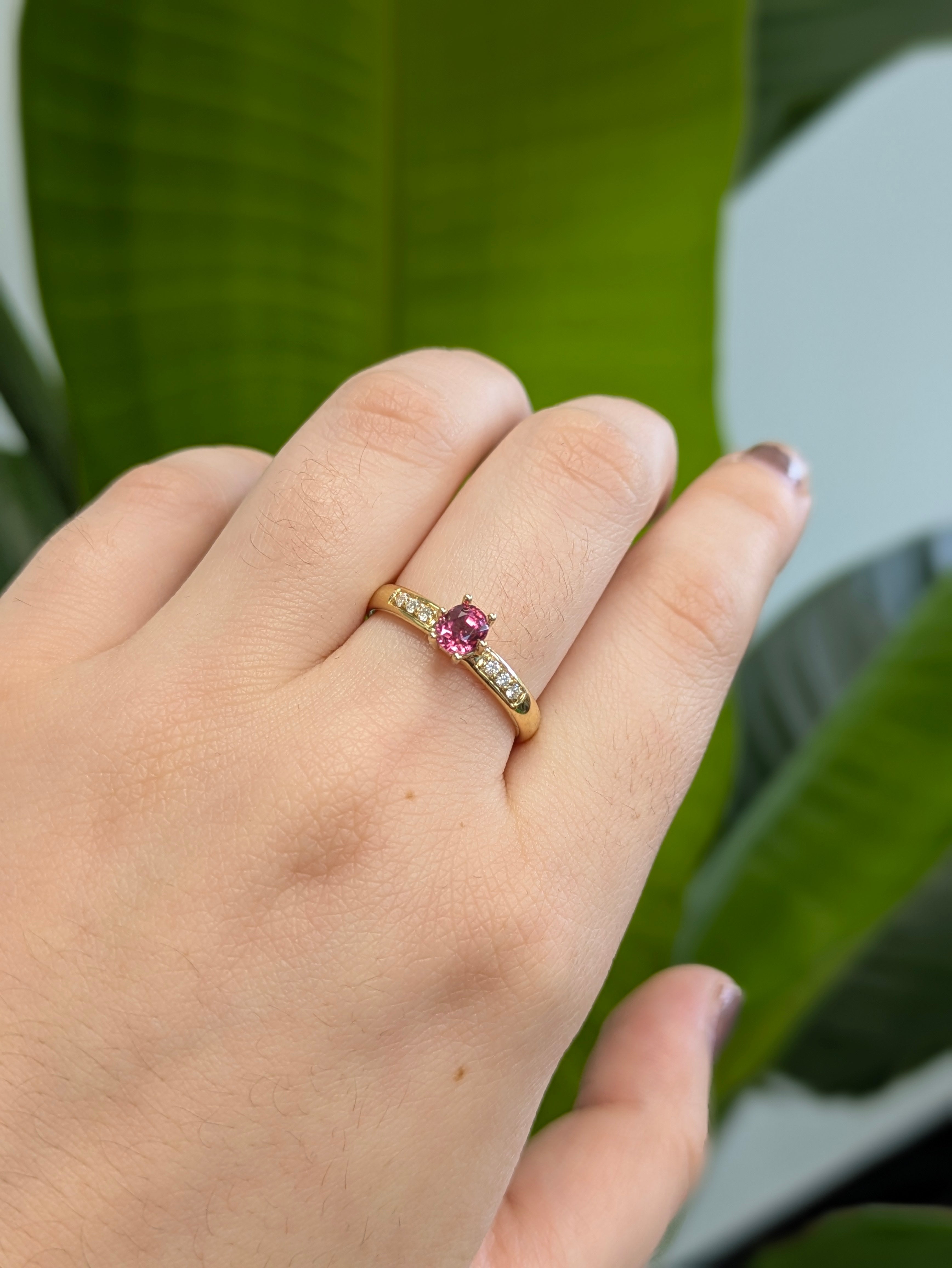 Elegant yet unpretentious, this pink spinel ring features a naturally untreated 0.54 carat gemstone, radiating a subtle glow that feels both delicate and confident. The 4mm round stone is set in six graceful prongs and accented by ethically sourced earth-mined diamonds, all resting atop a solid 14K yellow gold band with a modern, slightly wide profile. A refined beauty designed for everyday wear or unforgettable moments.
