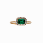 Simplicity meets elegance with our Colombian Emerald Ring. Crafted from solid 14K Yellow Gold and showcasing a stunning emerald cut 6x4mm emerald, this ring is the perfect addition to any jewelry collection. Complete with earth mined diamond halo, this piece radiates beauty and grace.