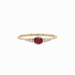A dainty east west ring is perfect for the minimalist in your life or for giving someone their first piece of jewelry :) This ruby presents a mixture of red hues which is perfectly accentuated by two diamonds on each side. The slim yellow gold shank provides a lightweight, effortless look!
