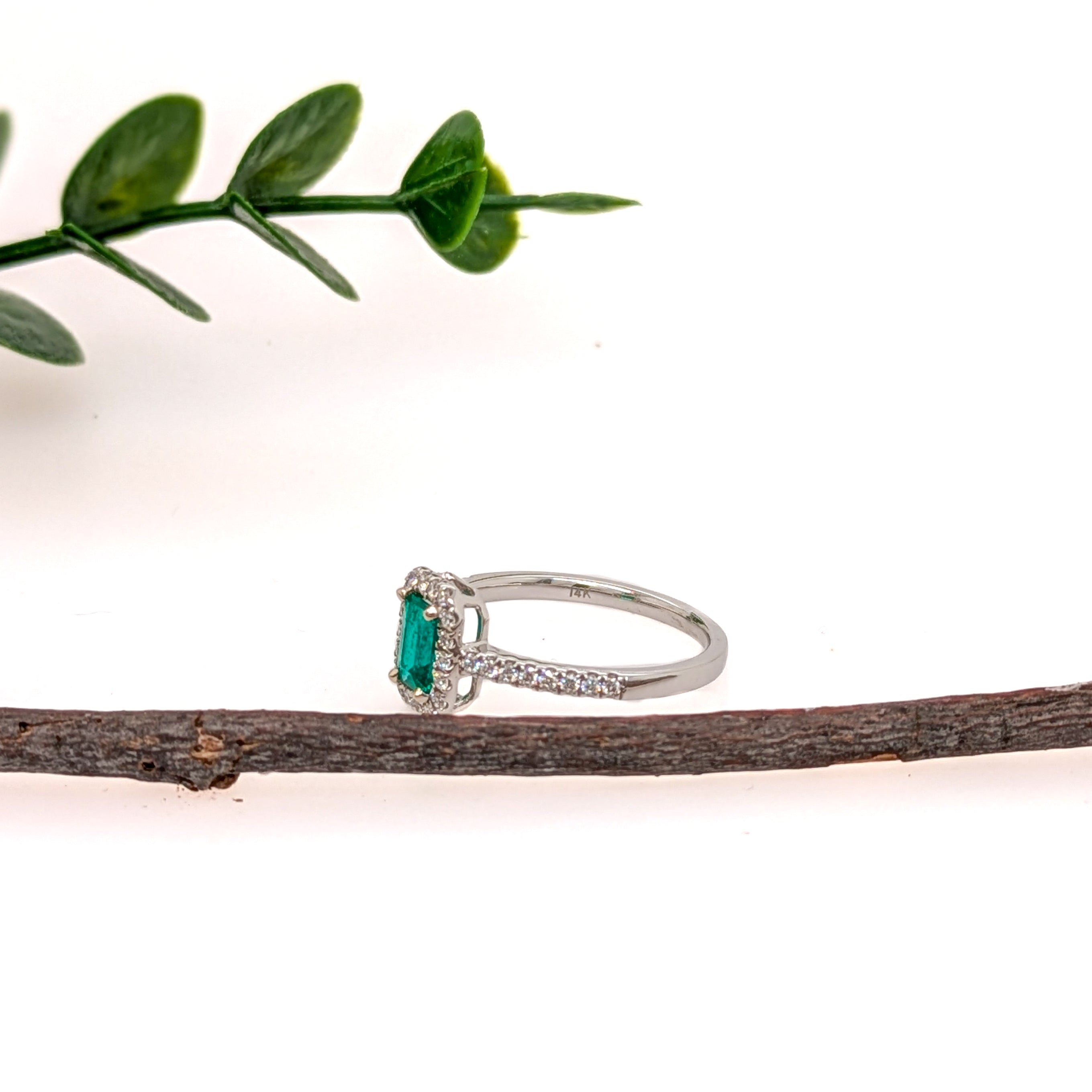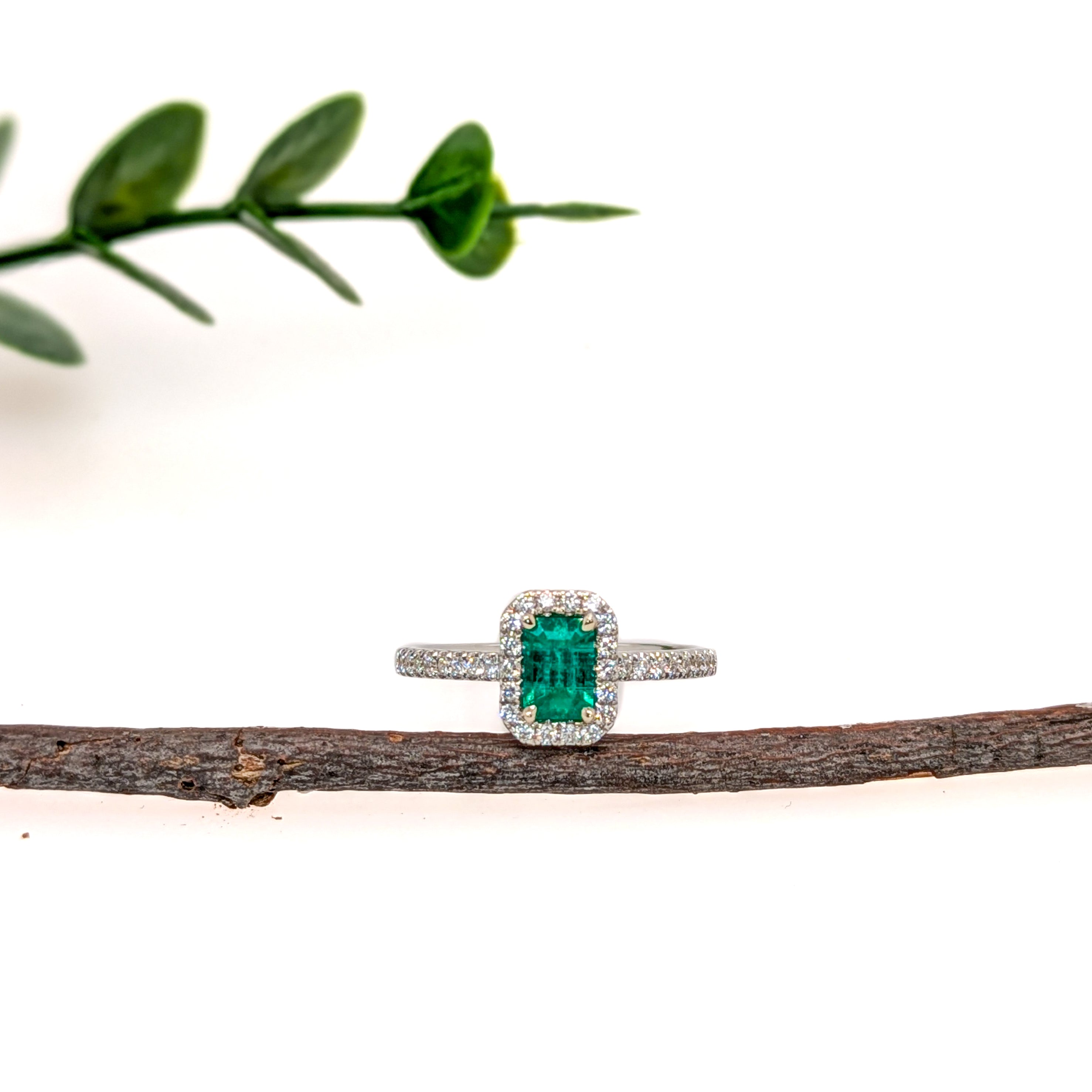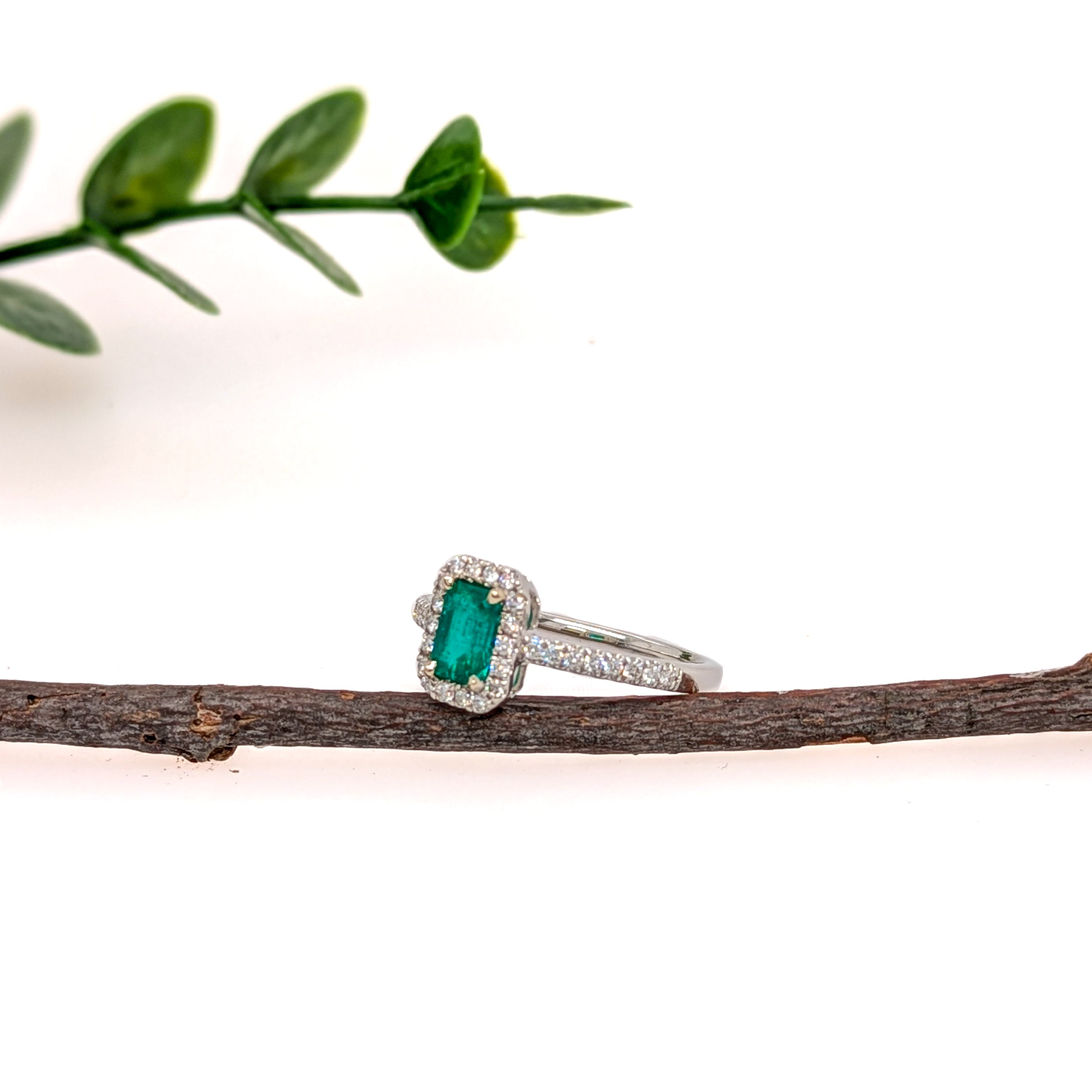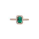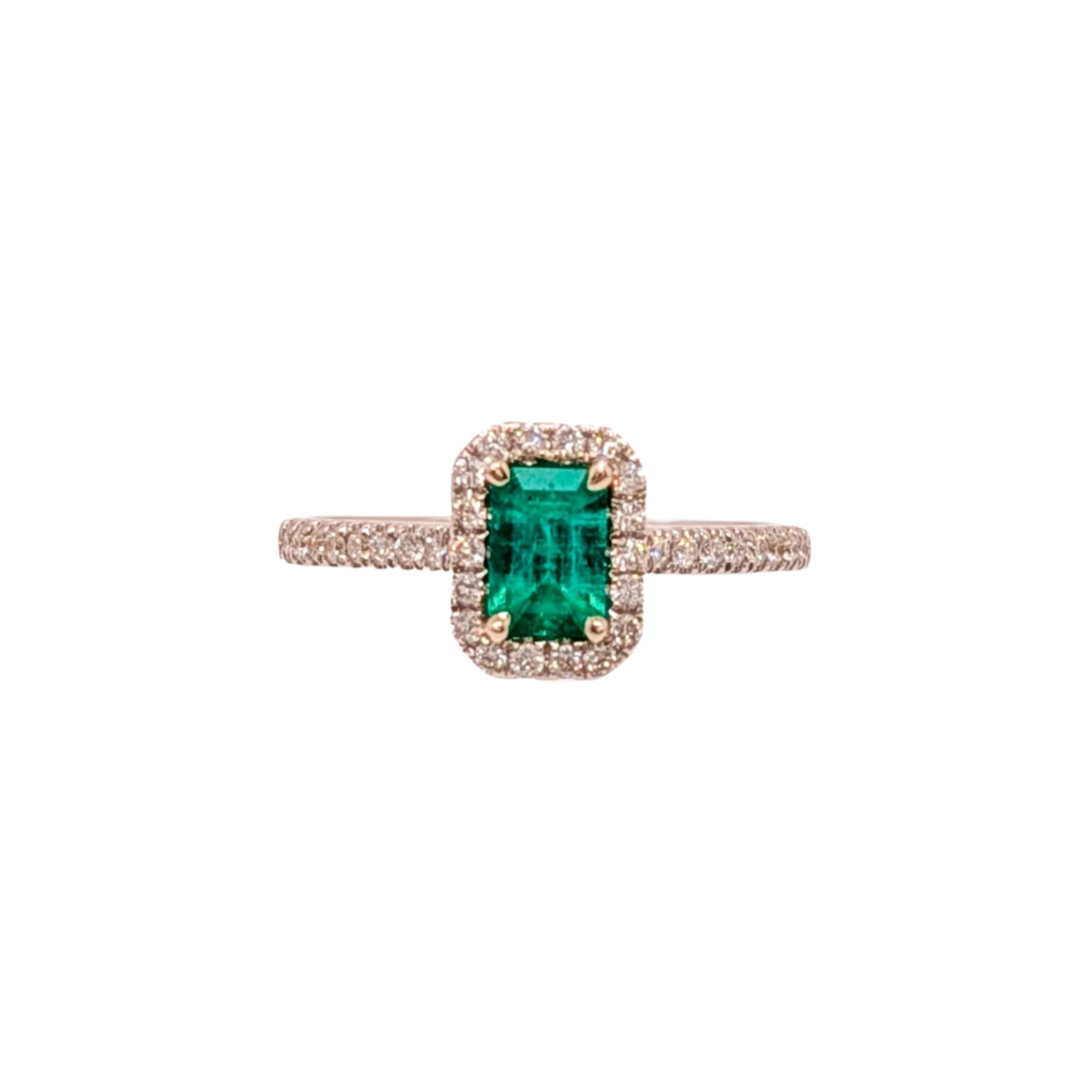 A dazzling halo of round-cut diamonds encircles the emerald, enhancing its brilliance and creating an eye-catching sparkle. Additional diamonds line the band, adding extra radiance and refinement. Crafted with precision, this ring is ideal for engagements, anniversaries, or as a cherished heirloom piece.