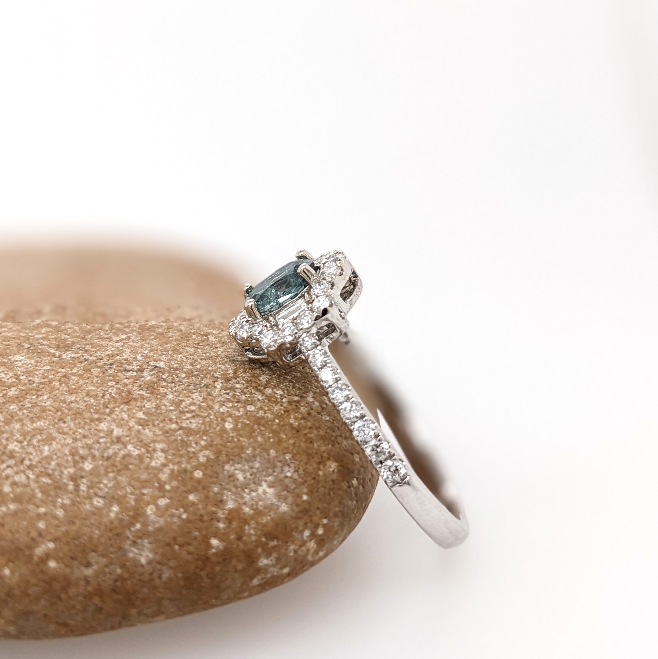 This unique ring features a natural color changing Alexandrite with natural earth-mined baguette and round diamond accents giving this ring a one-of-a-kind design. The color changing natural alexandrite appears blue green in daylight and shifts to a deep purple with red flashes when in candlelight. This beautiful piece was crafted in 14k solid gold using a 5x4mm oval alexandrite.