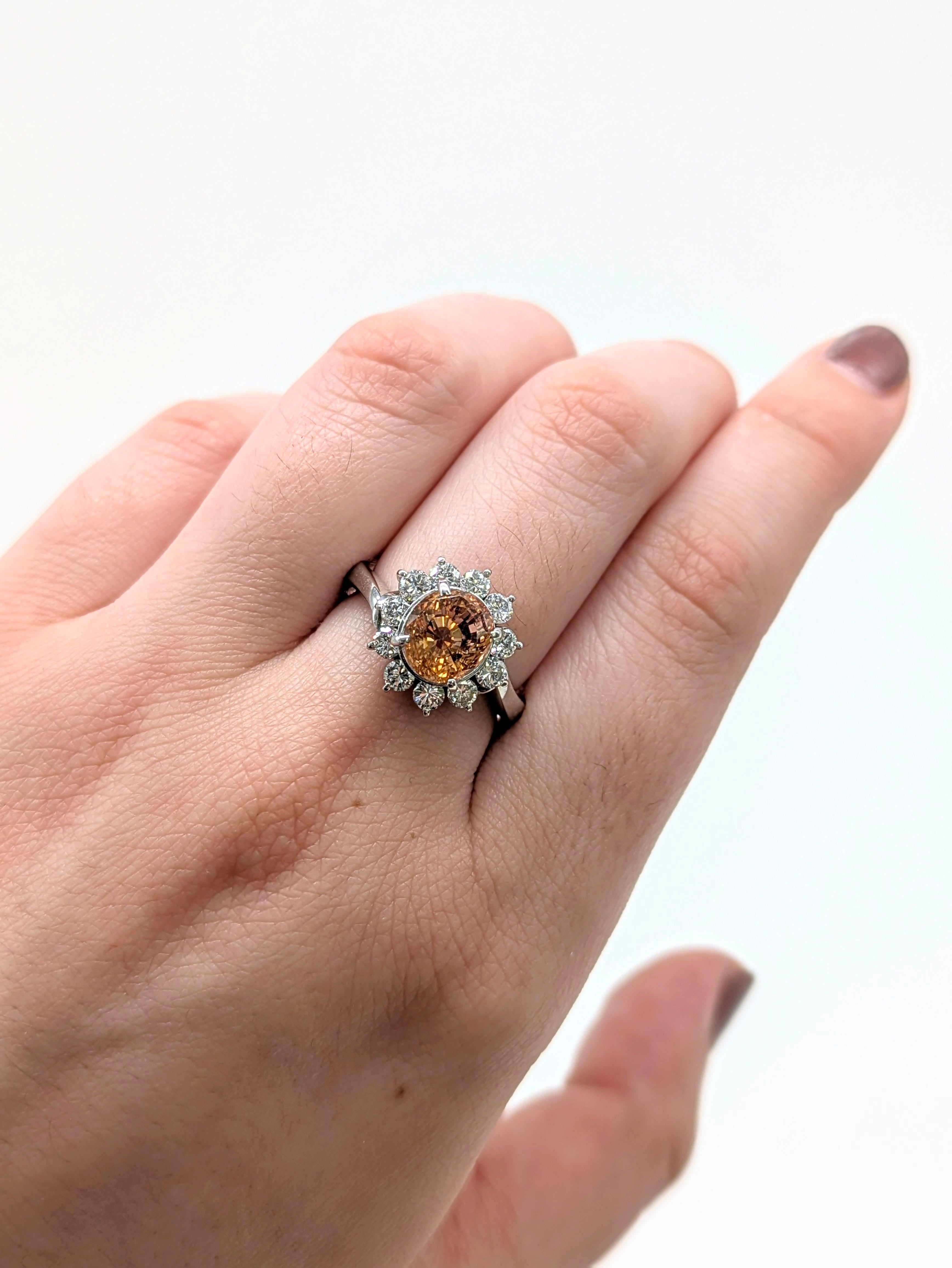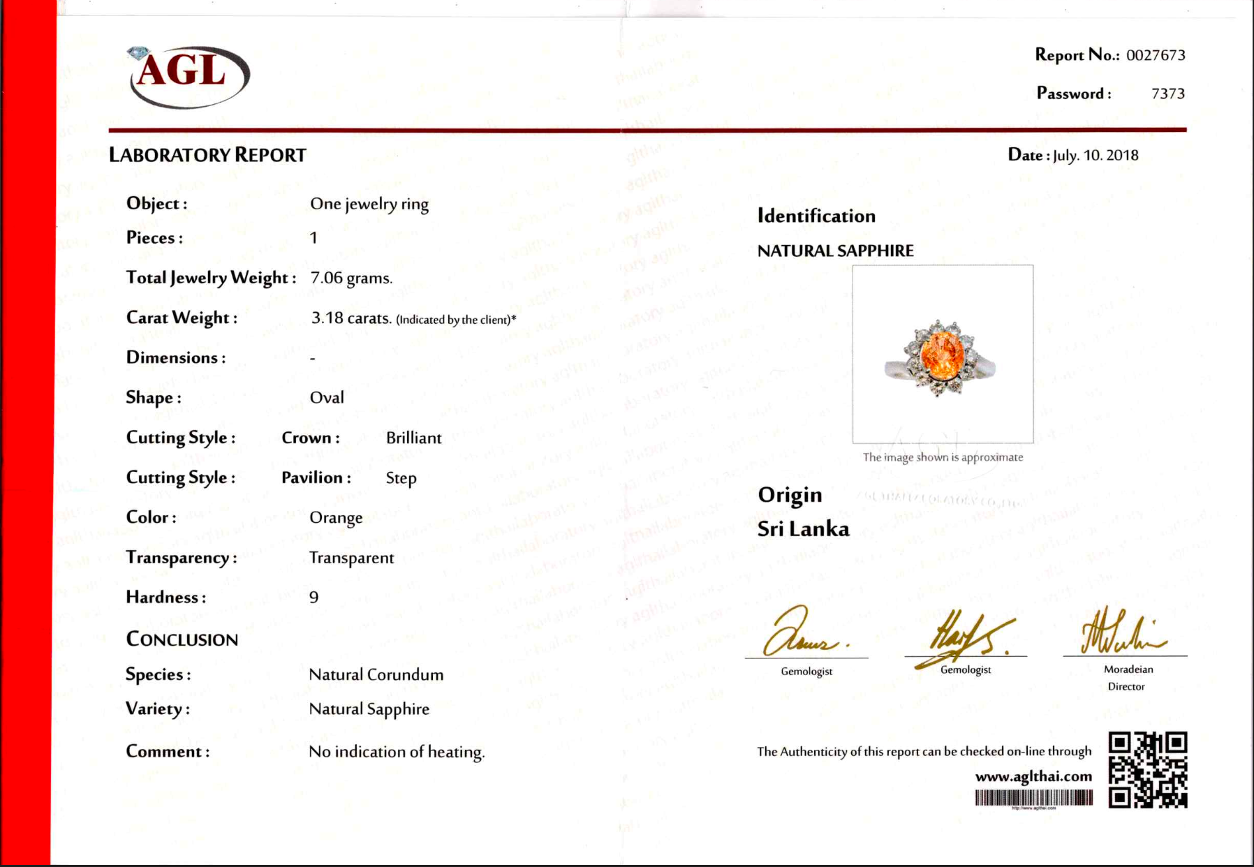 This ring features a stunning 2-carat oval-shaped orange sapphire at its center, measuring 8x6mm. Certified by AGL, the sapphire is completely natural, with no heat treatment applied, ensuring its pure and unaltered beauty. Surrounding the vibrant orange gemstone are 11 brilliant-cut diamonds totaling 0.44 carats, adding a touch of sparkle and elegance to the design. The ring is crafted in gold, weighing 6.34 grams, offering both luxury and durability. Ideal for those seeking a unique and timeless piece, this previously loved ring is a perfect blend of color and sophistication.