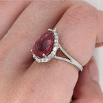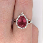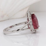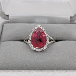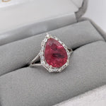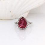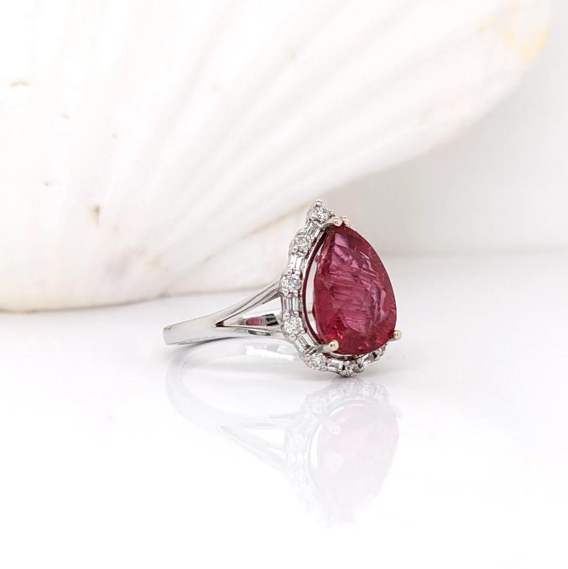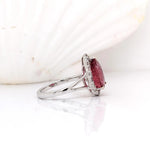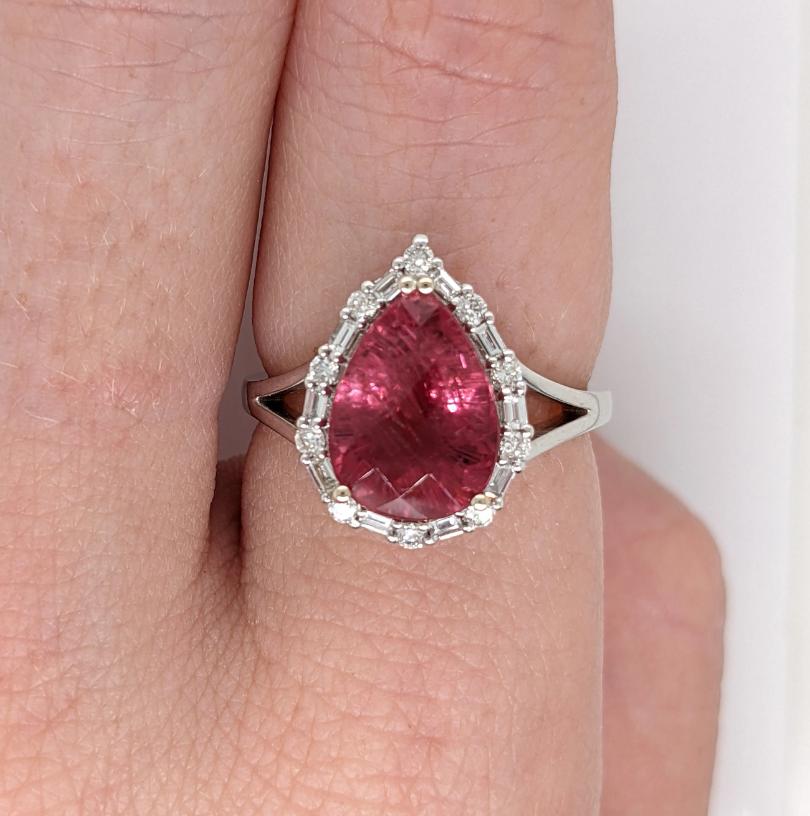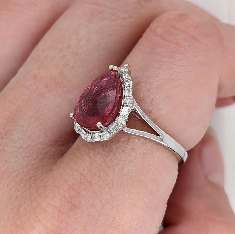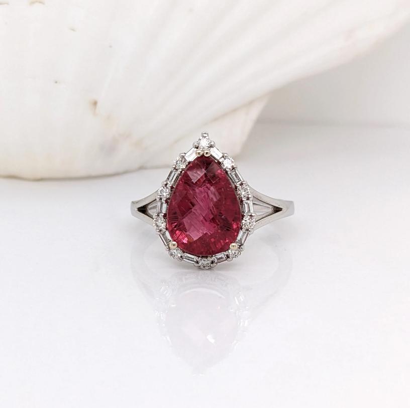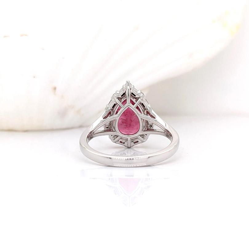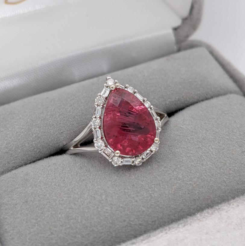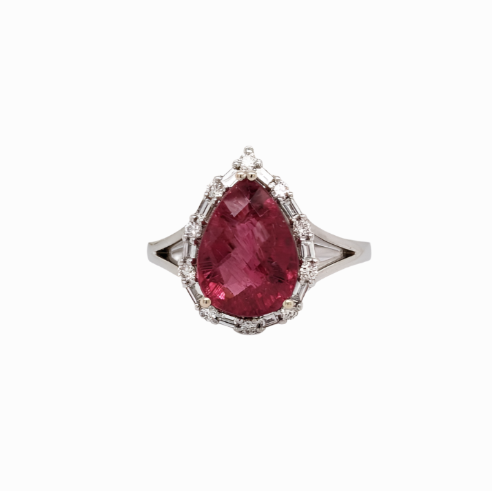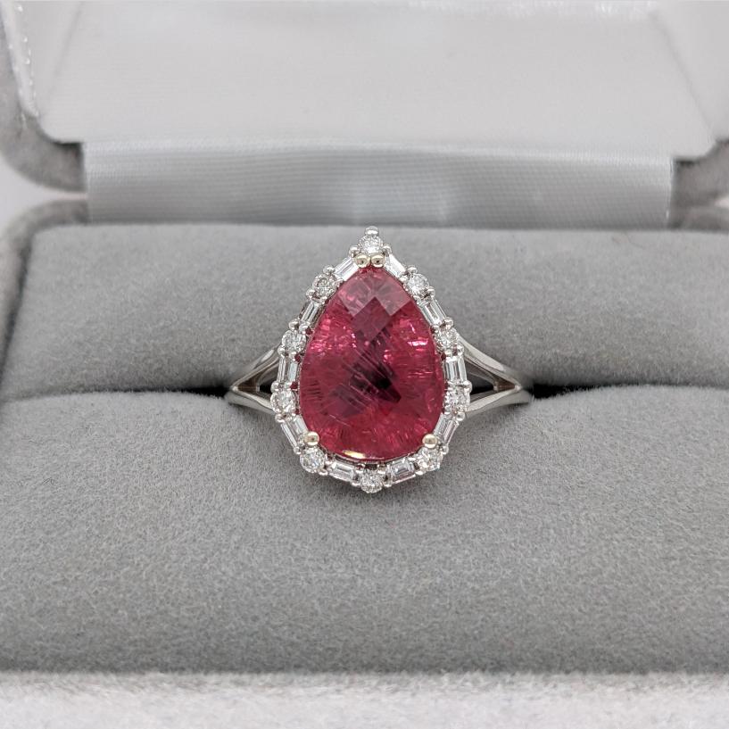 Pear Shaped Pink Tourmaline W a Mixed Baguette and Round Diamond Halo Ring in 14K White Gold | Pear