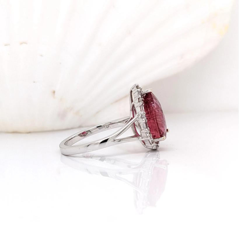 This stunning ring features a beautiful rubellite pink tourmaline framed by a mixed round and baguette diamond halo and a split shank. A beautiful collection piece that is perfect for every occasion. 💕