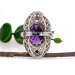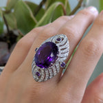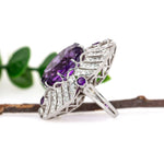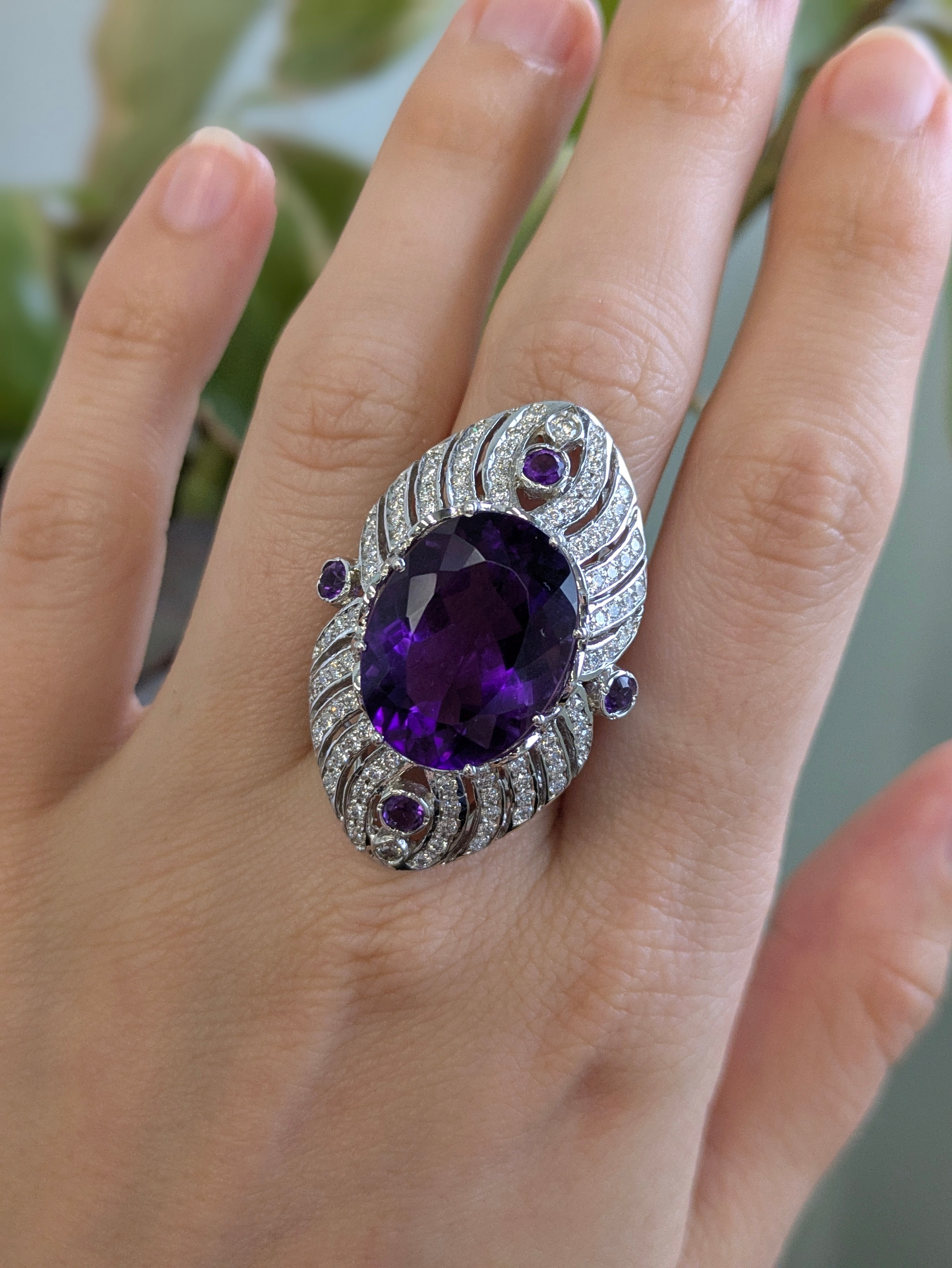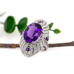 Delicate earth-mined diamond accents add a refined sparkle, beautifully complementing the vibrant amethysts while enhancing the ring’s luxurious feel. Every detail reflects expert craftsmanship and a timeless design meant to stand out.