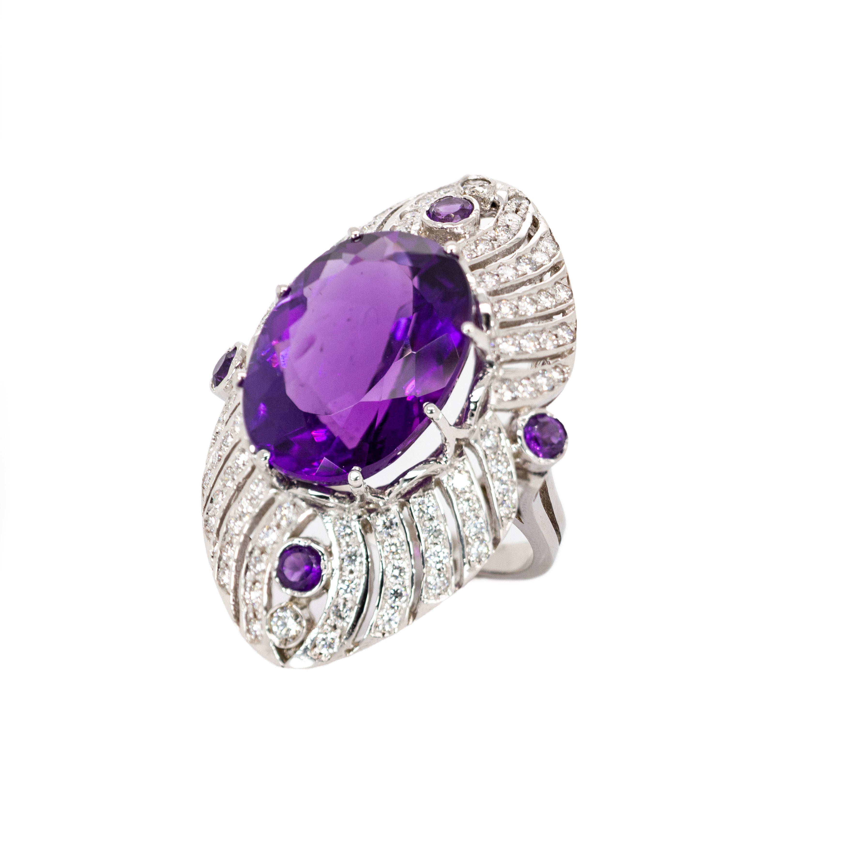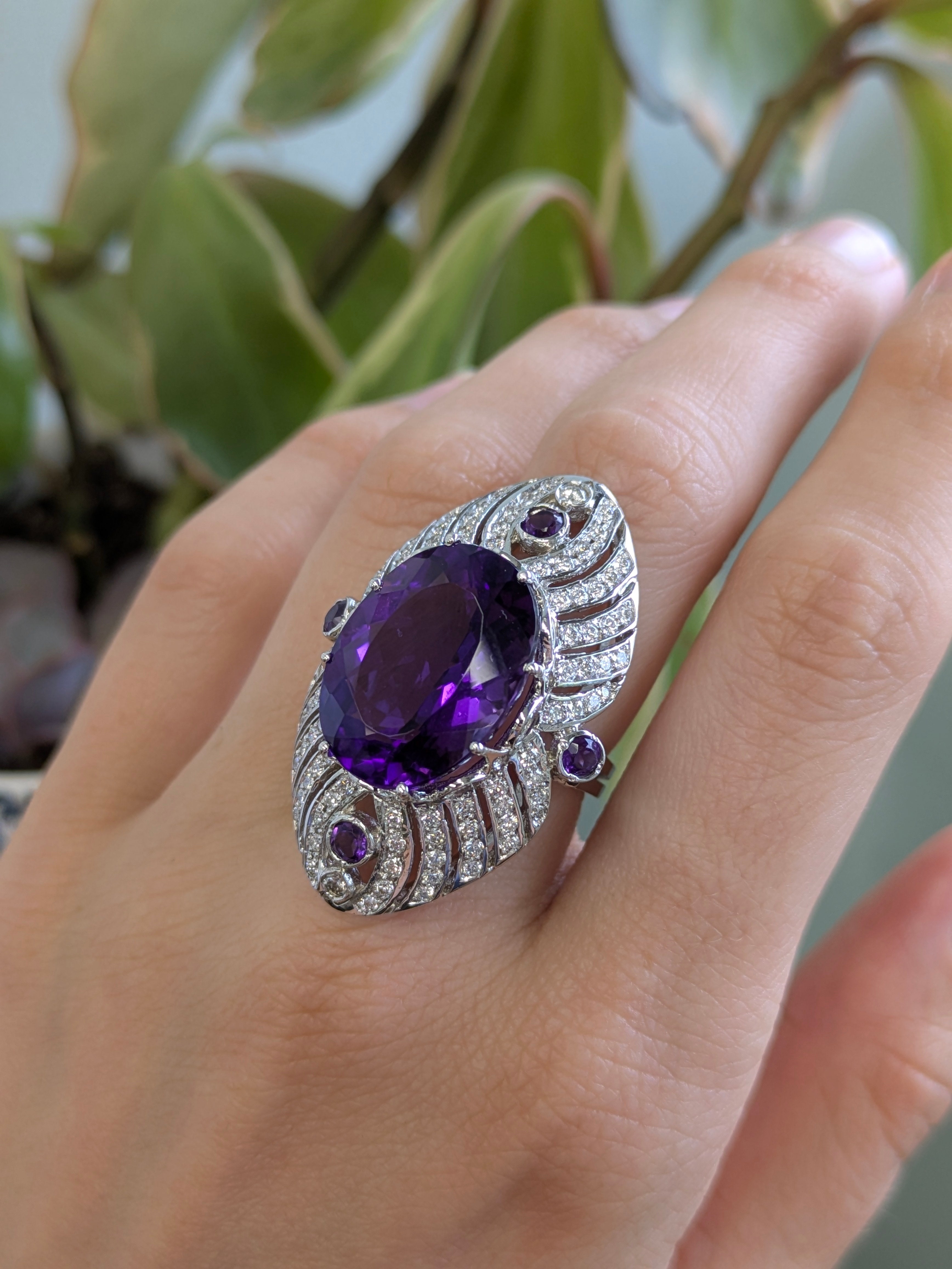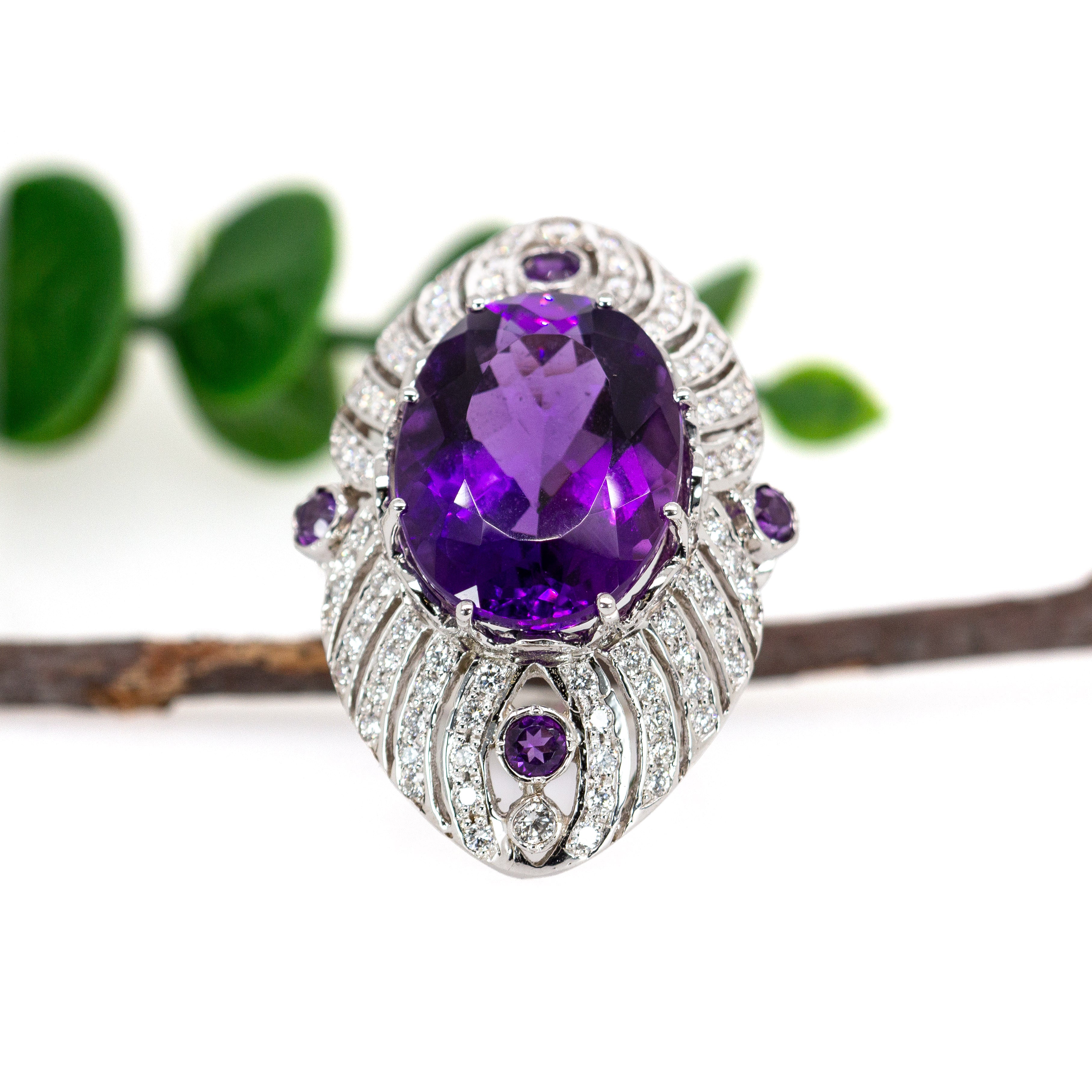 Command attention with this captivating amethyst and diamond ring, designed to be the centerpiece of your jewelry collection. Crafted in solid 14K real white gold, this bold statement ring showcases a large central amethyst, rich in deep violet tones, surrounded by four smaller amethysts. Together, they offer a stunning 22 carats of natural gemstone brilliance.