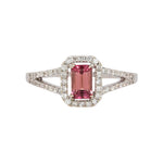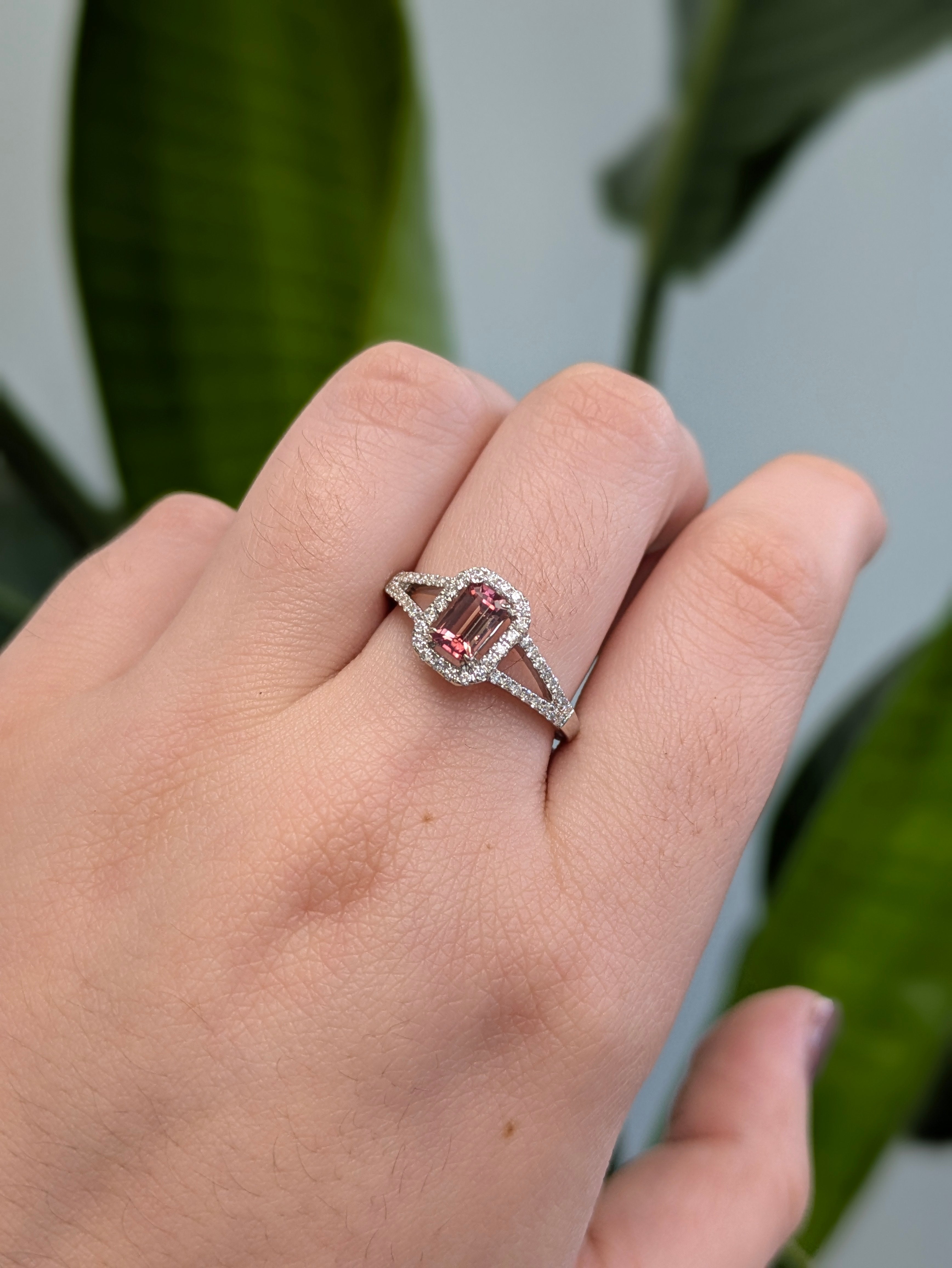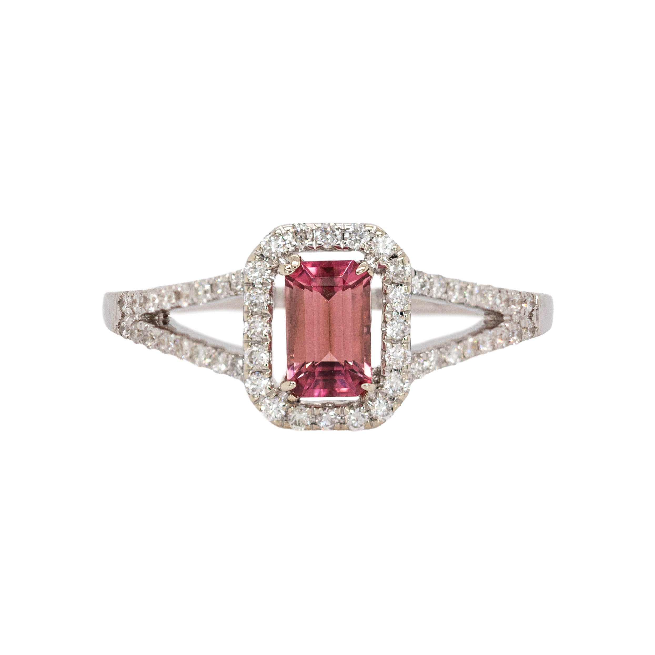 Elegant yet distinctive, this pink tourmaline ring offers a fresh take on timeless beauty. The emerald-cut 6x4mm center stone shimmers with a soft blush hue, surrounded by a dazzling halo of natural diamonds. A gracefully split shank, pavé-set with glittering accents, brings extra brilliance and balance to the piece. Crafted in solid 14K white gold, this ring is a sophisticated statement for those who love subtle color, refined design, and meaningful gemstones.