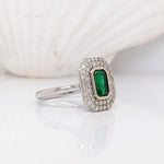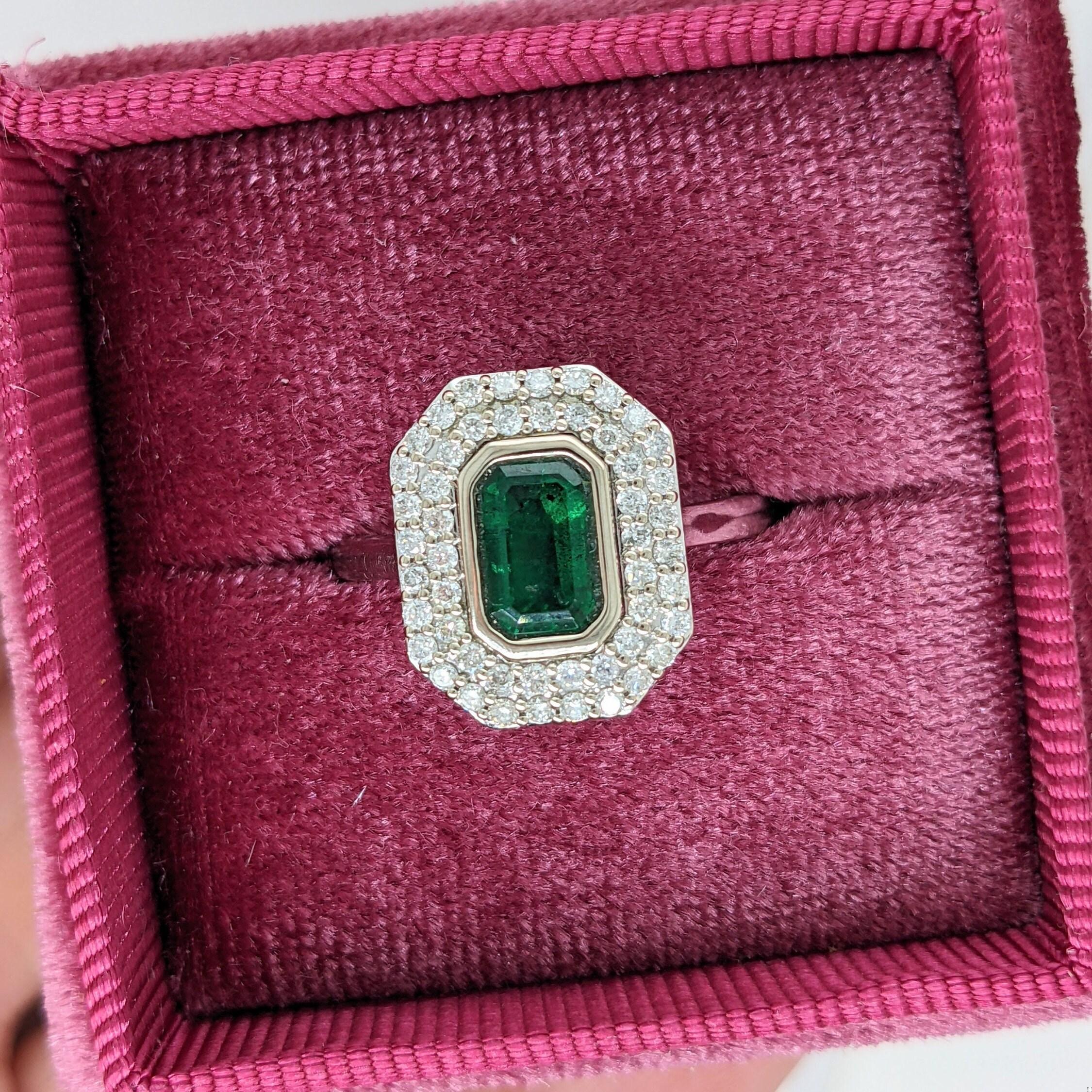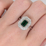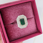This beautiful Victorian-style ring features a vibrant deep green emerald set in 14k white gold with a double halo of natural diamond accents. A statement ring design perfect for an eye-catching engagement or anniversary. This ring also makes a beautiful birthstone ring for your loved ones.